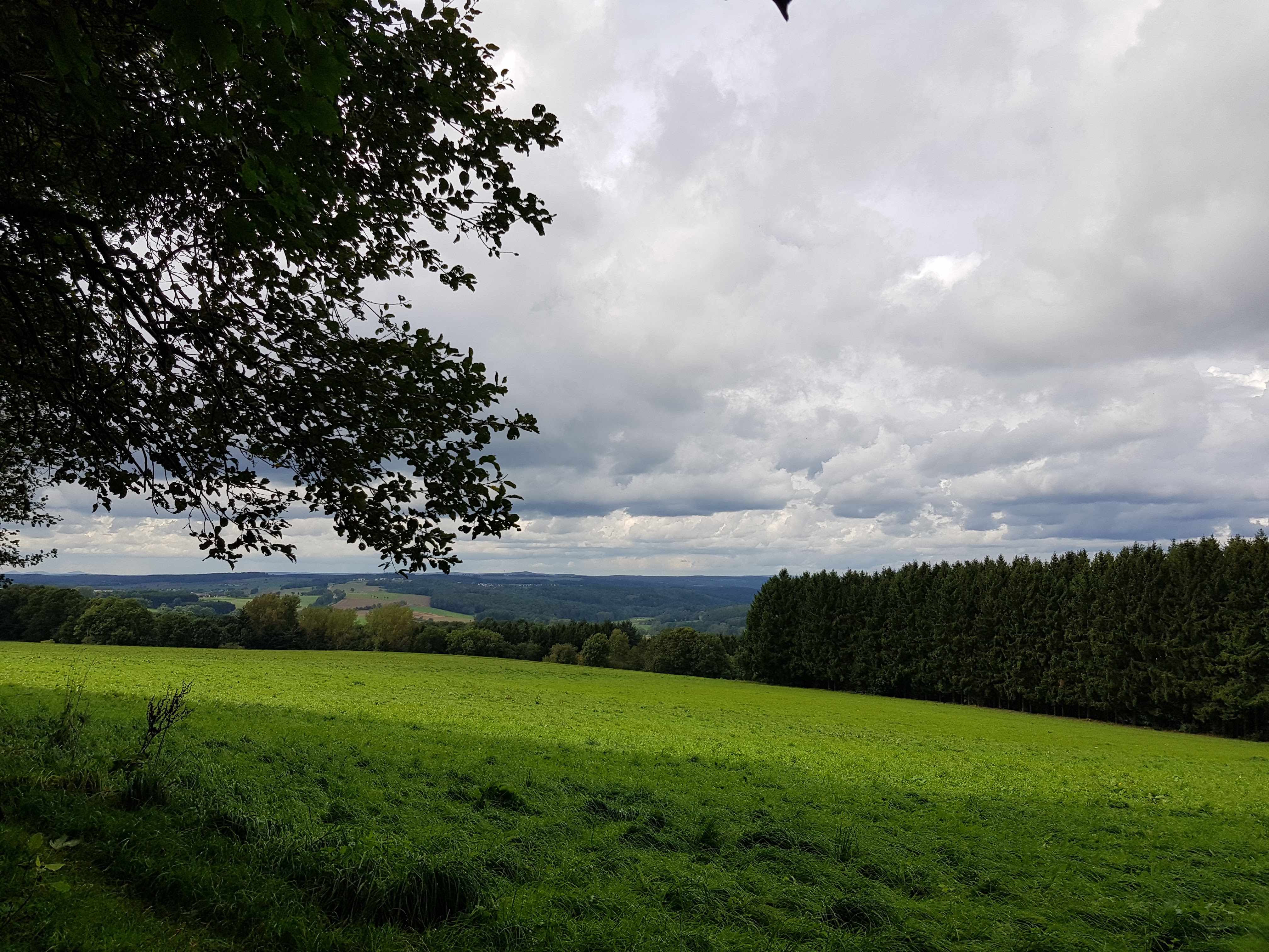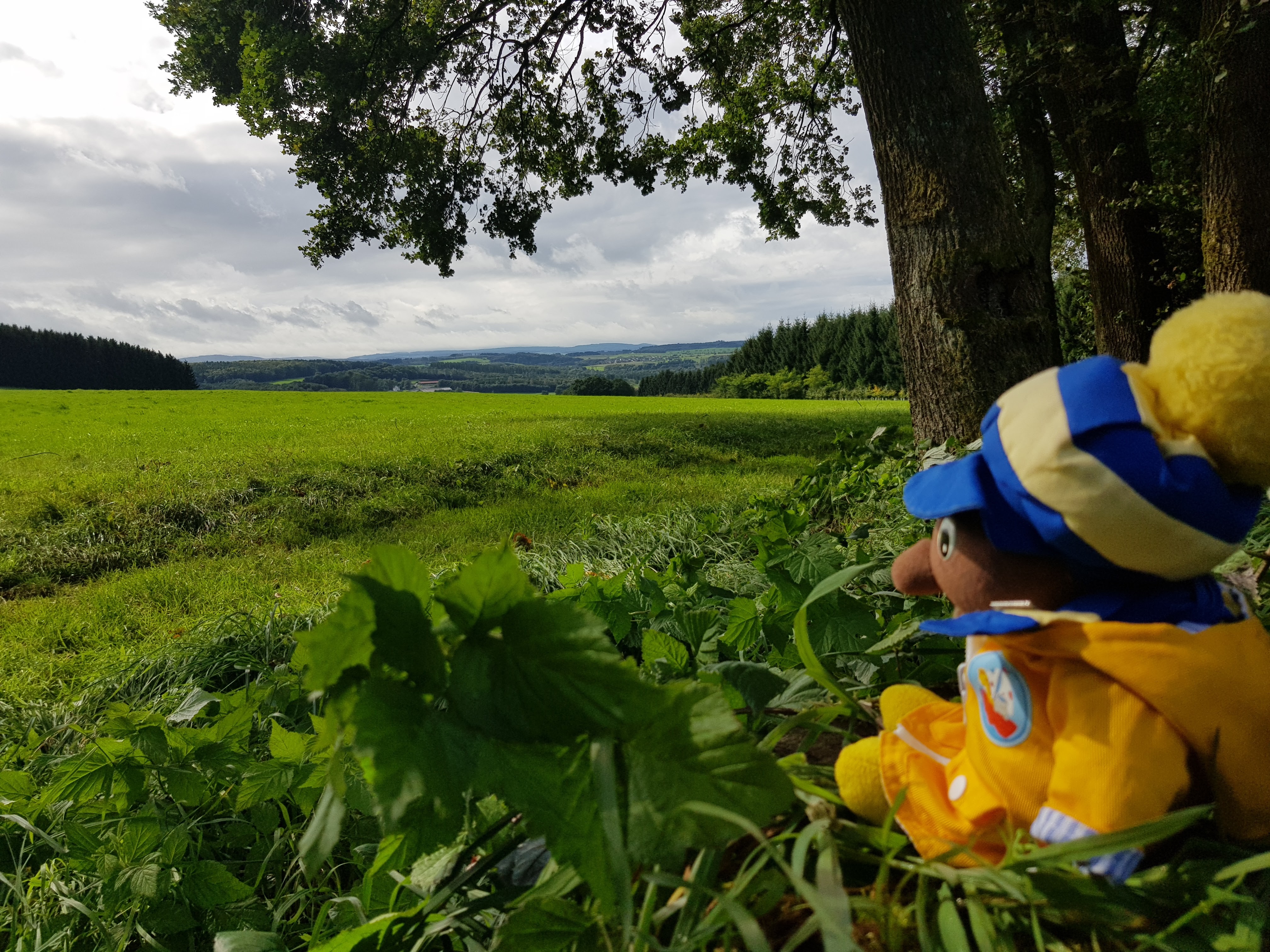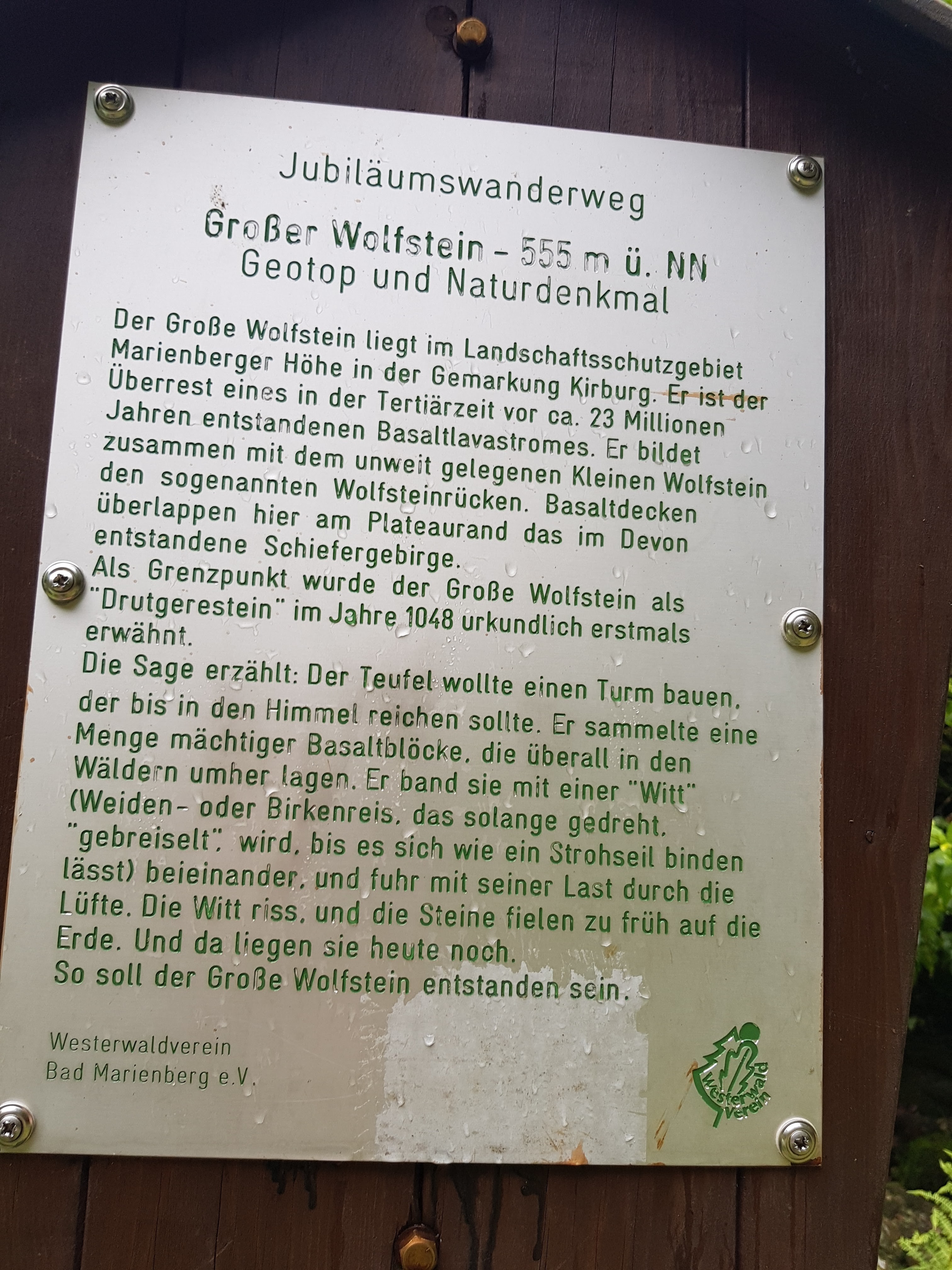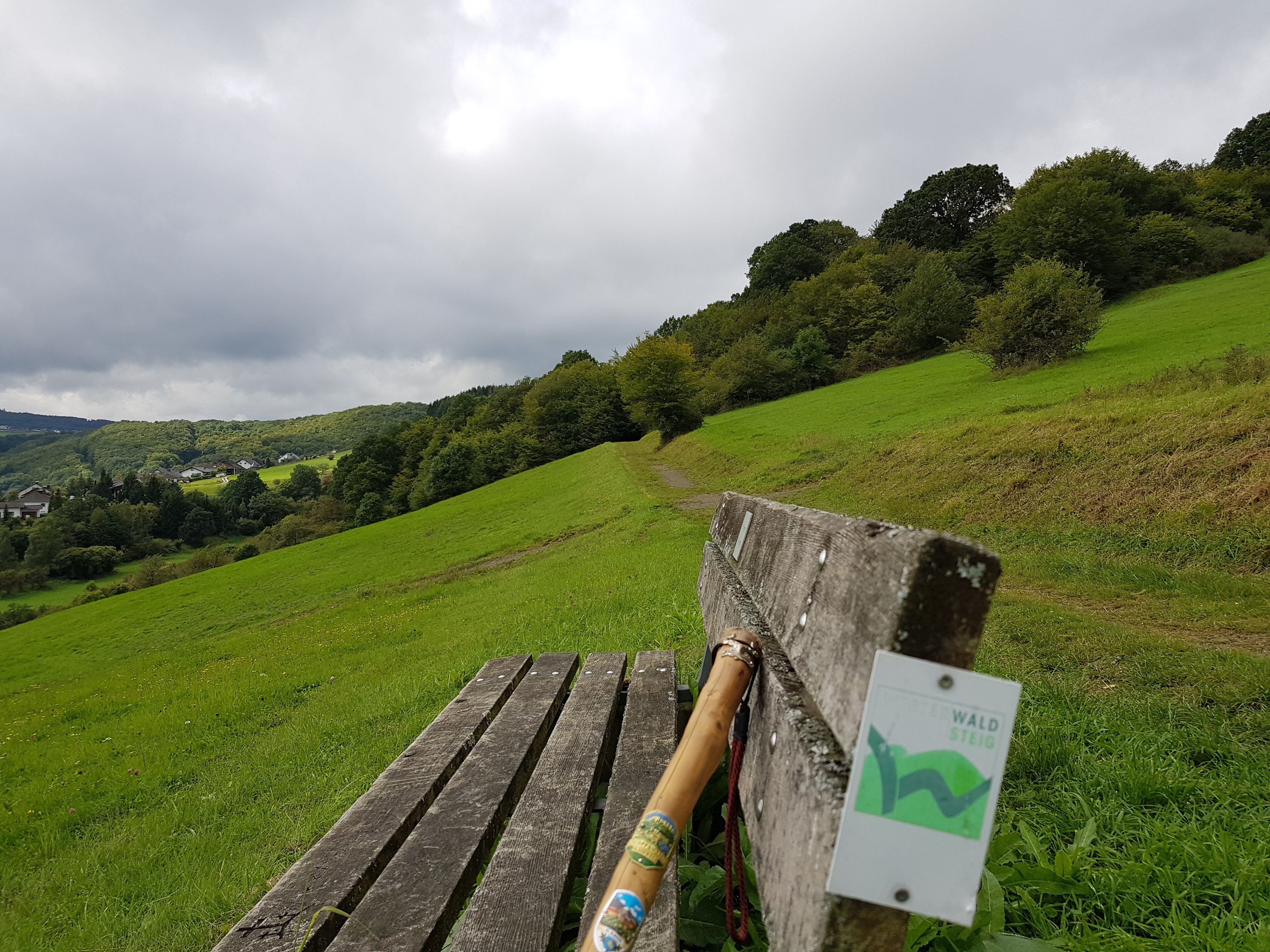 Es ist immer witzig, um wie viele Kurven wir geführt werden, damit der Weg auf seine Kilometer kommt. Aber ich glaube, das war beim Anlegen des Westerwaldsteiges nicht der Hauptgrund. Wir werden dadurch immer an besonders schöne Punkte geführt. Oder interessante. Wir haben dadurch gestern eine keltische Anlage kennengelernt, in der früher Zwerge gehaust haben. Sie hatten ihr ganzes Gold und Silber ausgebreitet und einem armen Burschen, der des Weges kam zugerufen, er könne so viel mitnehmen, wie in seine Taschen passen. Da ist er noch mal nach Hause, um größere Taschen zu holen. Doch als er wieder an der Stelle ankam, war alles weg. Heute habe ich die Geschichte von Adolf Weiß an einem Baum gelesen. Er hatte an einem Schreibwettbewerb teilgenommen und den hiesigen Spruch „Hui! Wäller? Allemol!“ geprägt. Er hatte 12 Flaschen Moselwein gewonnen.