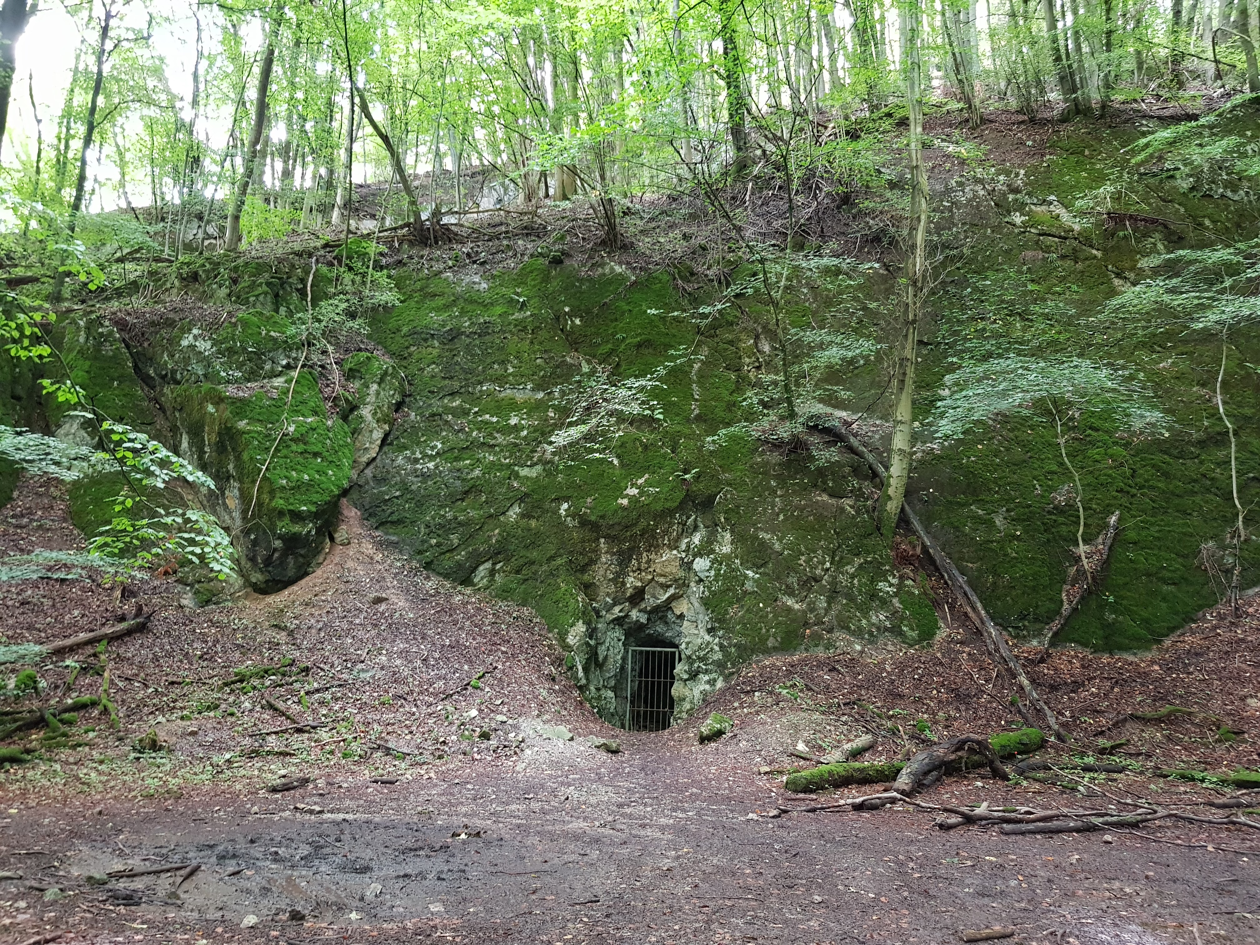 Währenddessen passieren wir das Schützenhaus, in dem gerade eine Feier in vollem Gange ist mit dem wohl hier überall üblichen, unerträglichen Helene-Fischer-Schlagerverschnitt. Sogar ein Bernhardiner, der am Wegesrand lagert, macht ein gequältes Gesicht. Wir nähern uns der Erdbachschlucht mit Höhlen, Steinkammern und Felsen. Das linke Bild bitte genau anschauen. Man sieht in der Bildmitte einen Eingang zu einer Höhle, die man aber nicht betreten darf (Lebensgefahr).