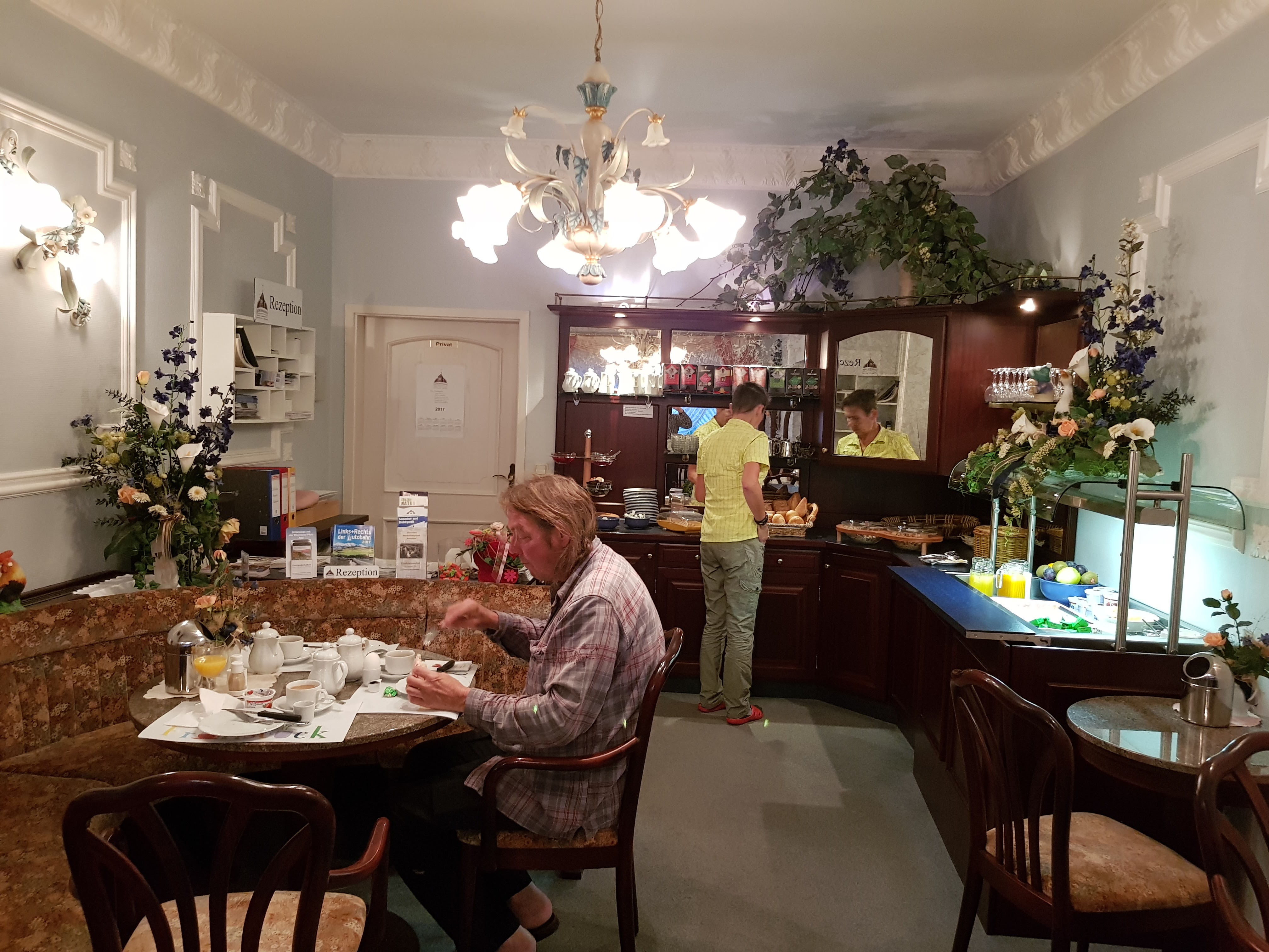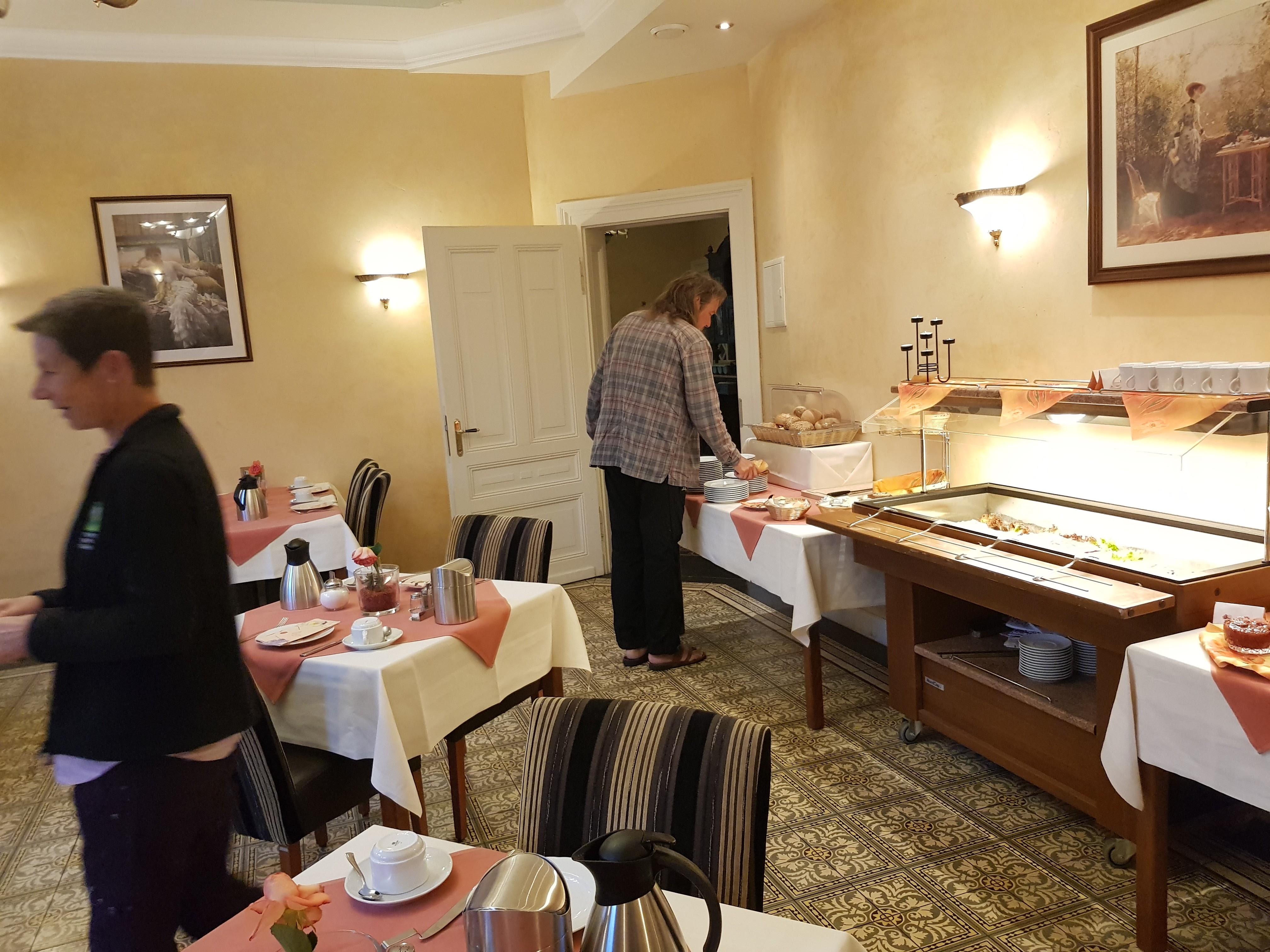 Völlig verschlafen taumeln wir heute morgen zum Frühstück. Die Gänge und Flure sind so verwinkelt, dass wir unseren Orientierungssinn aktivieren müssen, um zum Restaurant zu finden. Dazu müssen wir um 6 Ecken biegen, ich habe sie extra gezählt. Auf dem Bild ist Kerstin schon am Zusammenräumen. Kurz davor fragt sie mich, ob sie meine restliche Butter haben könne. „Du siehst schon so fertig aus.“ Da hat sie in einem Satz gleich zwei wahre Aussagen getroffen.