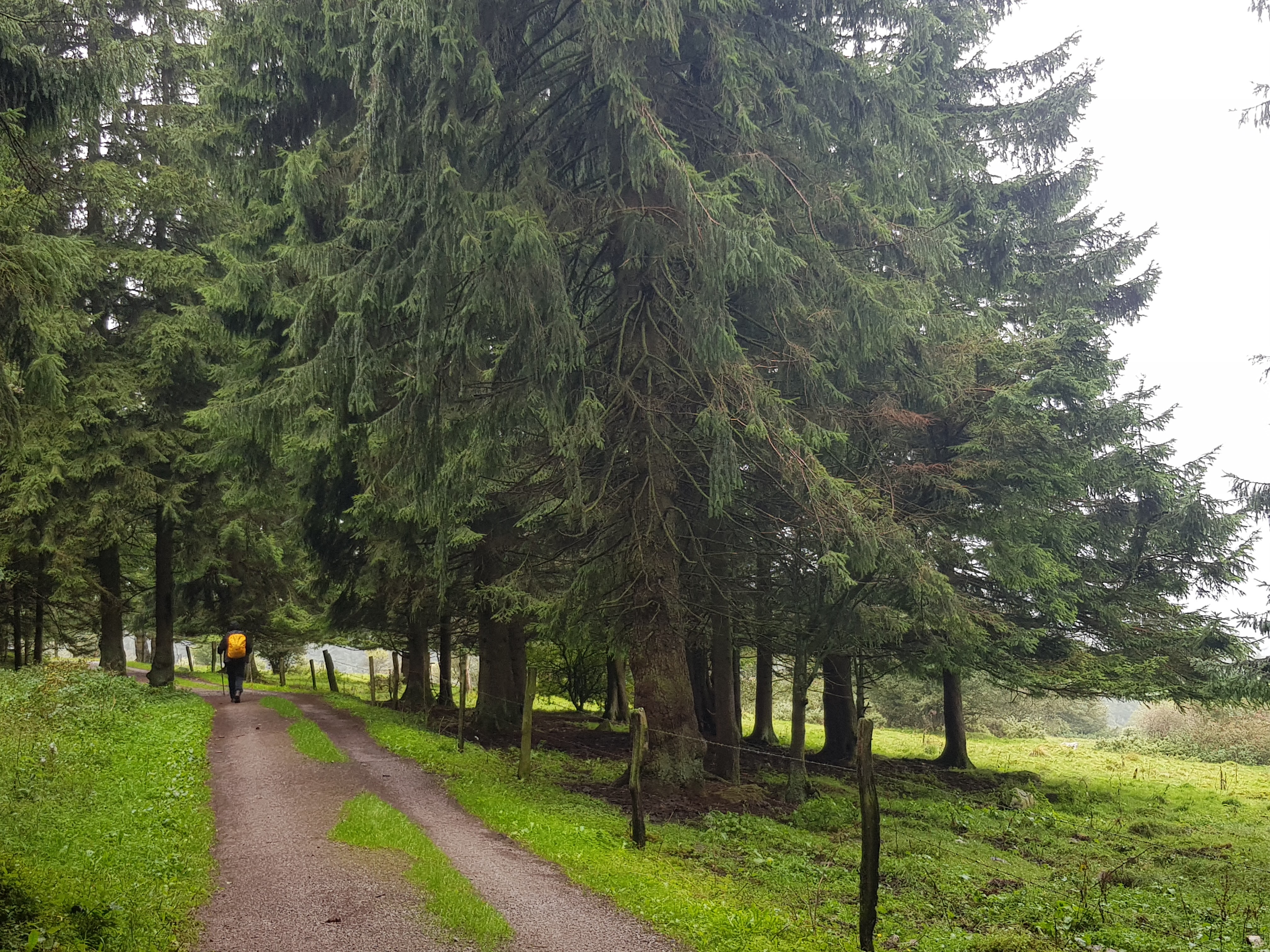 Draußen pieselt es still vor sich hin und es sieht nicht so aus, als wollte es aufhören. Grauer Himmel flächendeckend. Das motiviert nicht gerade, aber wir haben heute 23 km vor uns und müssen los. Noch die restlichen, gestern erworbenen Postkarten schreiben, den Reisebericht vervollständigen, Schuhe putzen (Pflegemittel habe ich ja jetzt genug), die dreckigen Regenklamotten von gestern überstülpen und schon ist die Wandergruppe Zimmermann startklar. An der Rezeption verabschieden wir uns und werden mit verwundertem Blick auf unsere Wanderstöcke gefragt: „Was haben Sie denn für ein Werkzeug dabei?“ Wir klären ihn auf, aber er hat tatsächlich noch nie in seinem Leben Wanderstöcke gesehen! Fassungslos verabschieden wir uns und machen uns auf den Weg. Wie jeden Tag hat Kerstin wieder viele bunte Bilder auf ihrem Zettel, deren Motive man an bestimmten Stellen in der Realität erkennen muss. Während sie mit Gerd die Gegend absucht, lasse auch ich meinen Blick schweifen und sehe direkt über mir einen dicken, abgebrochenen Ast am seidenen Fädchen baumeln. Der wird dort nicht mehr lange hängen!