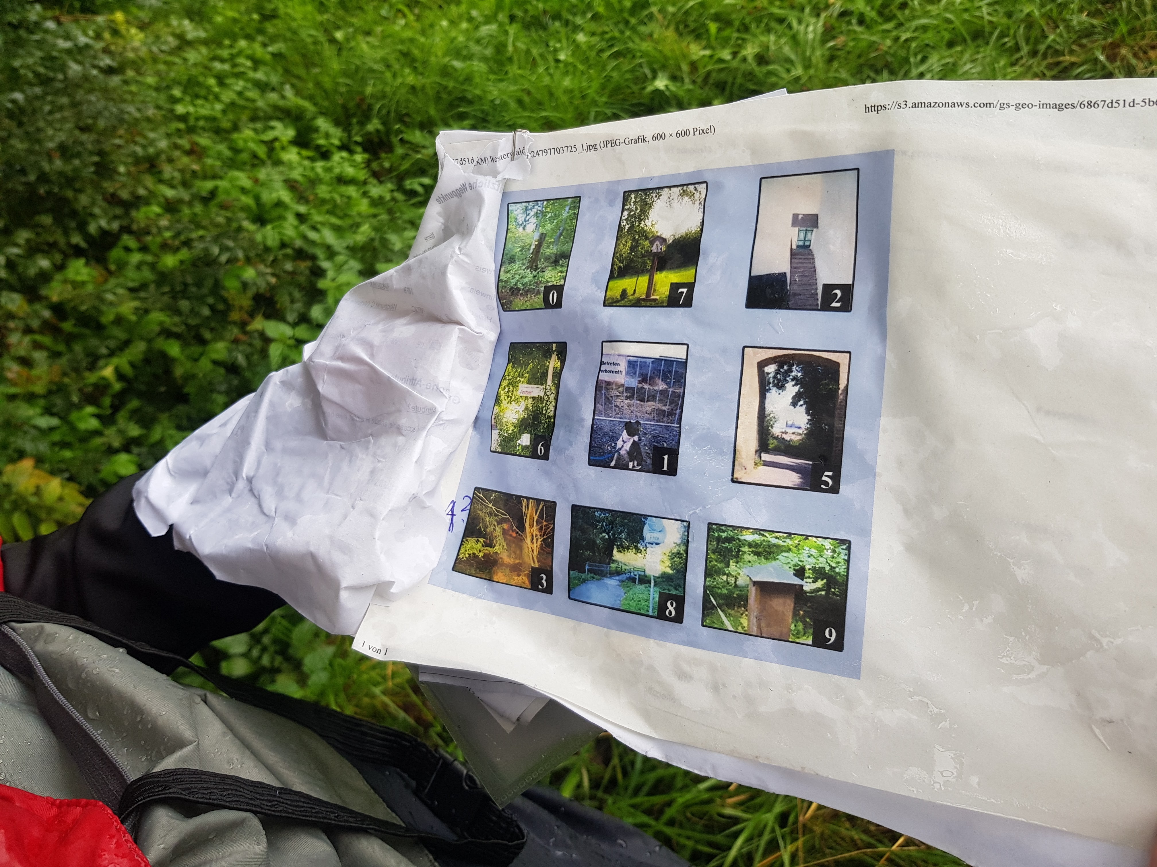 Kerstin hat uns wieder ein Blatt mit bunten Bildern in die Hand gedrückt. Immer, wenn sie das Kommando gibt – also wenn die Koordinaten Alarm schlagen – müssen wir an der Stelle eins von den Motiven auf unserem Zettel suchen. Das klappt ganz gut. Manchmal auch so gut, dass wir die Objekte schon im voraus erkennen.