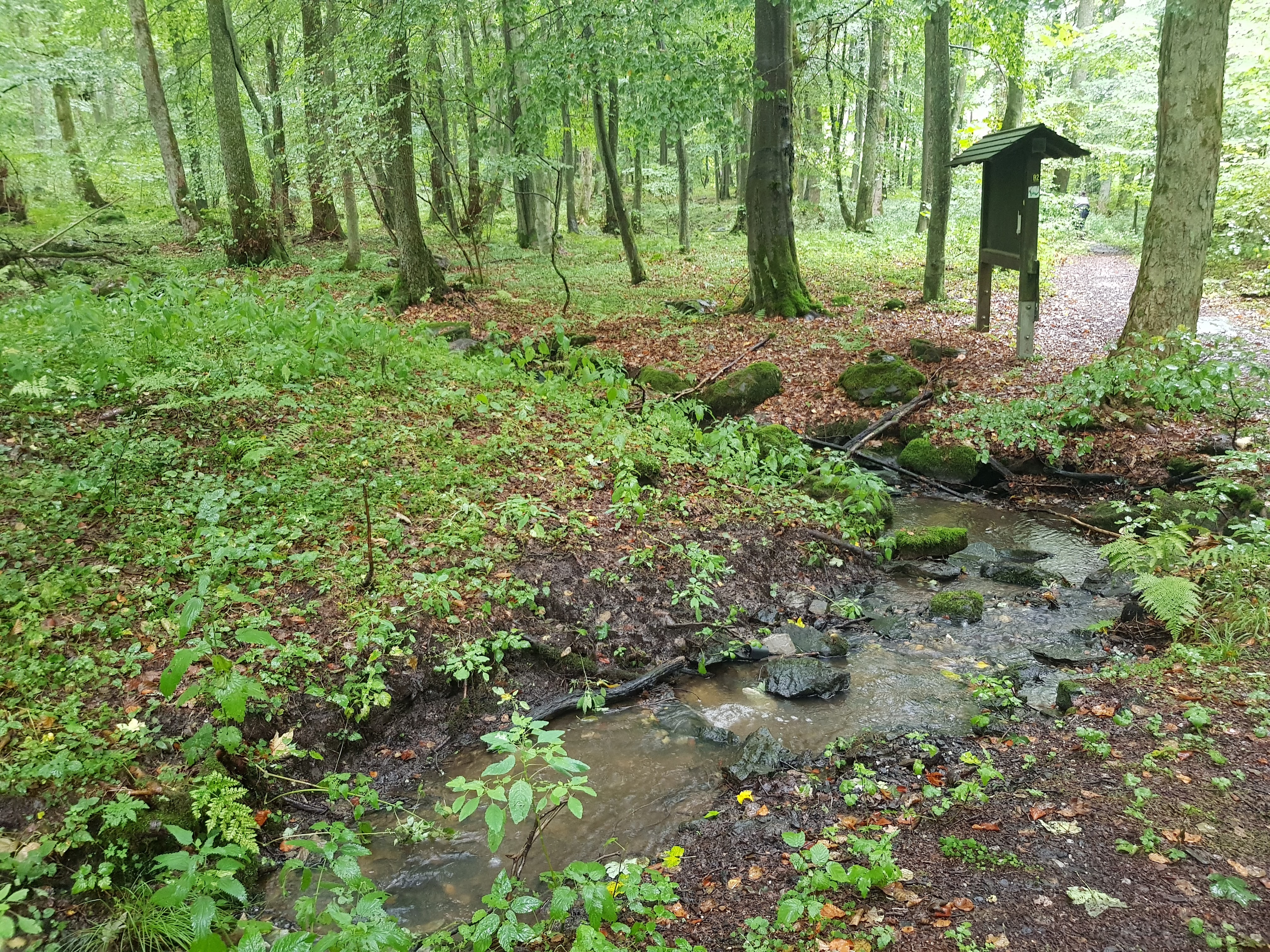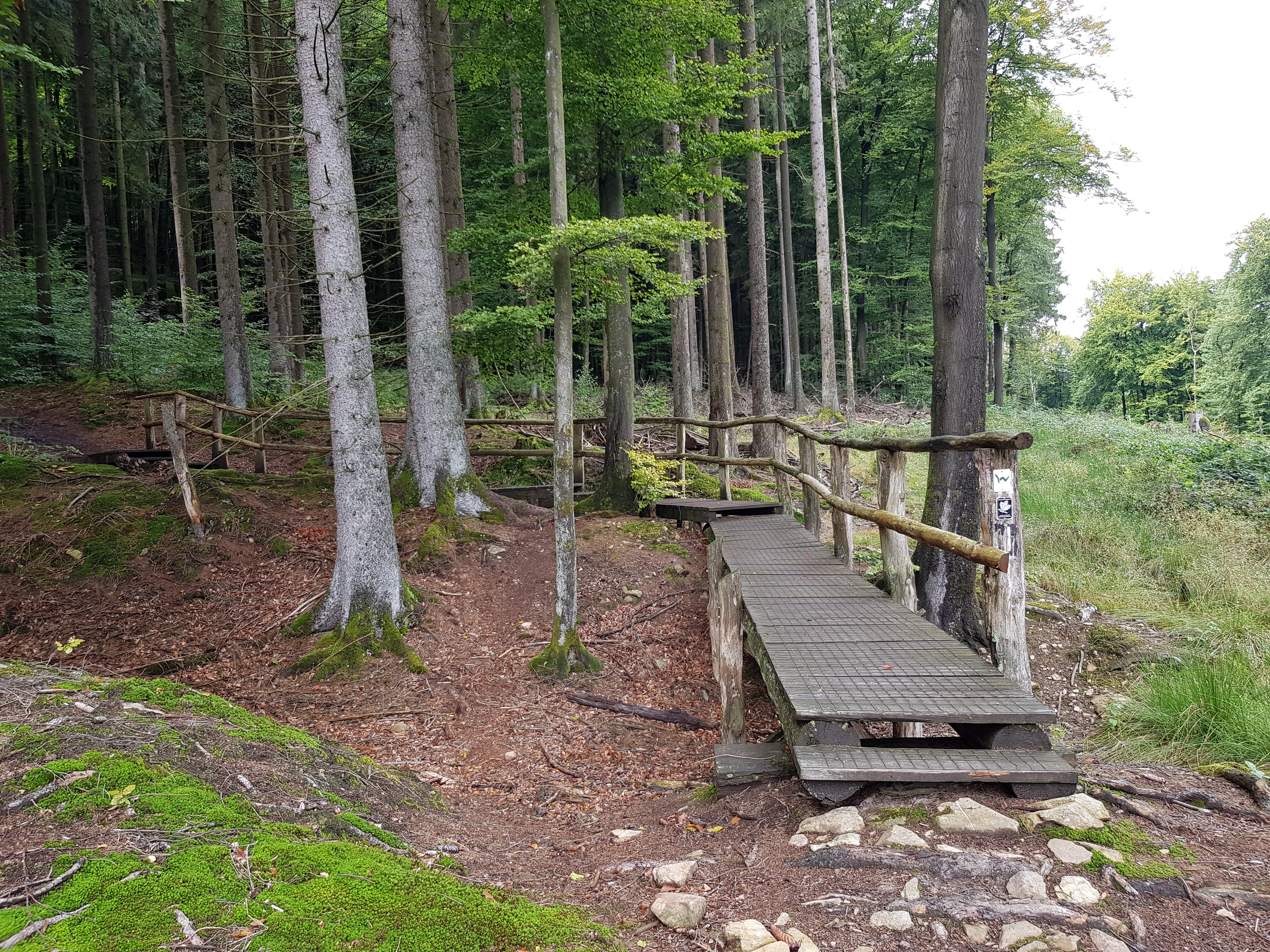 Das ist die höchste Stelle der heutigen Wanderung. Es geht teilweise sanft, aber auch kniestrapazierend steil bergab in Richtung Unnau-Korb bis an die Nister. Es ist schon die ganze Zeit trocken von oben, aber natürlich sind die Spuren des feuchten Wetters der letzten Tage noch zu sehen