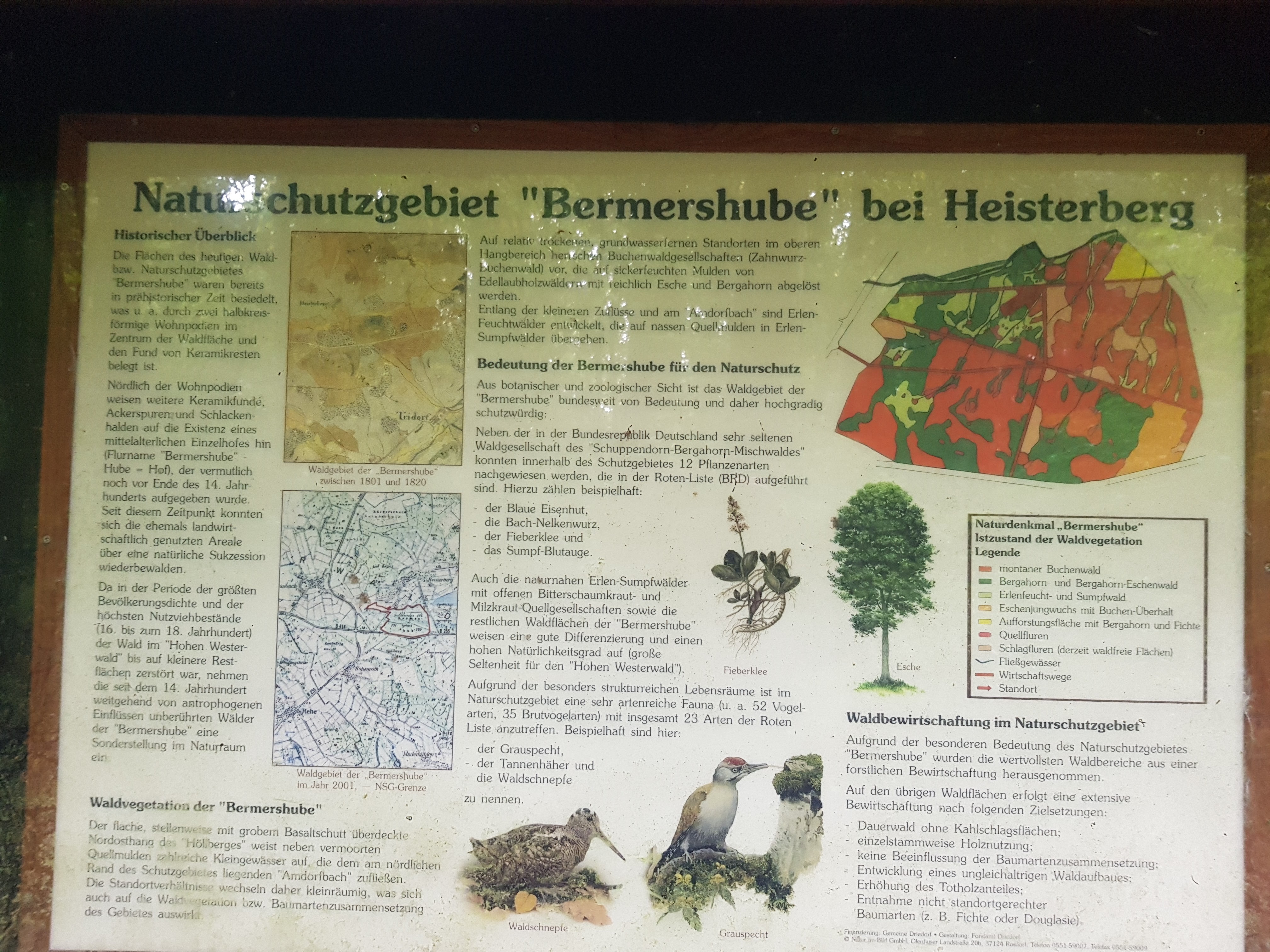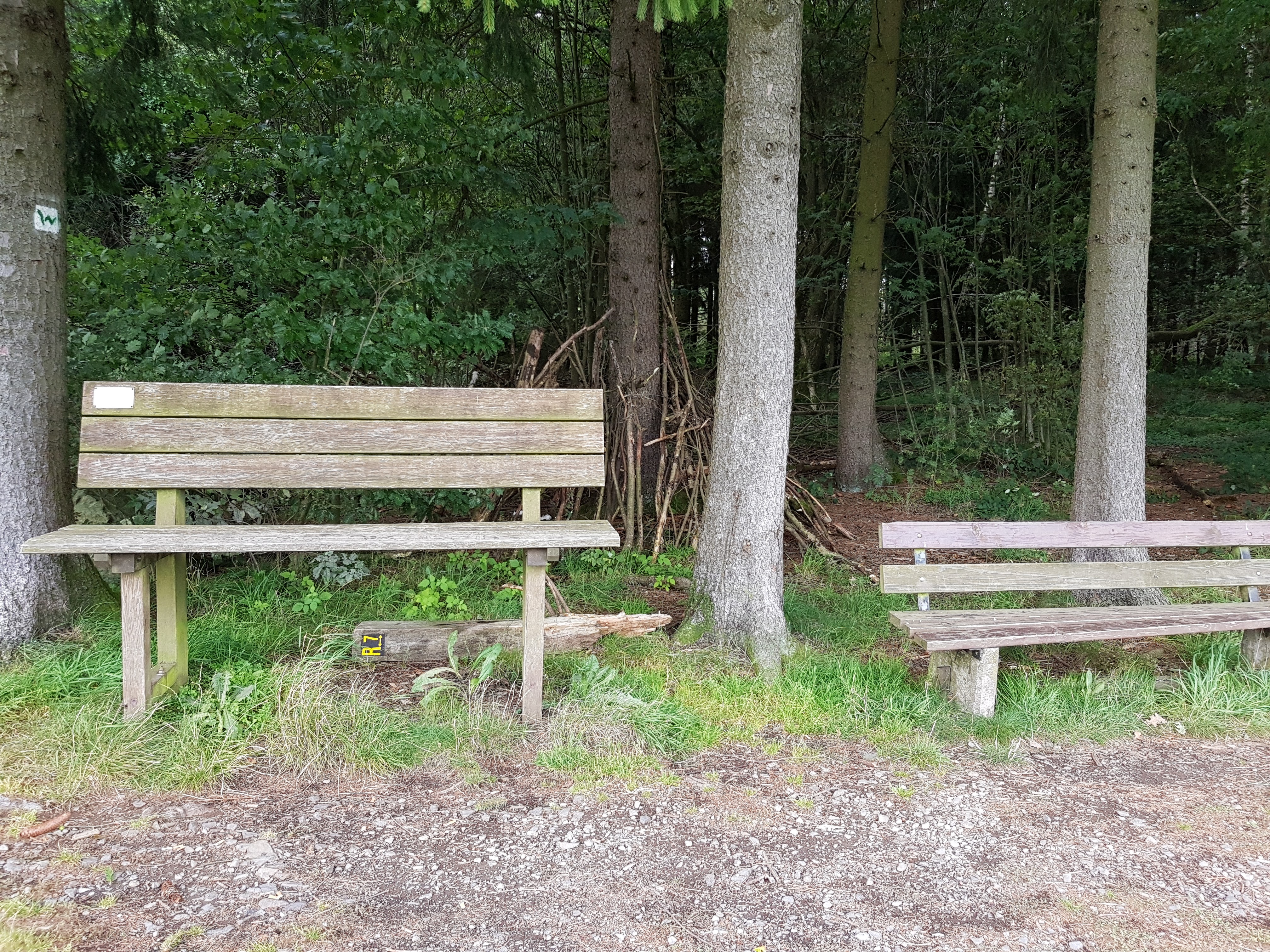 Schwer zu ertragen ist der Anblick der vielen Pilze. In Berlin sind wir ganze Nachmittage erfolglos auf Suche, hier stehen sie am Wegesrand, aber wir können sie nicht mitnehmen! Eine ganze Weile stehen rechts Warnschilder Spalier, dass man dieses Gebiet nicht betreten darf. Es handelt sich um den Standort einer Bundeswehrkaserne. Zwischenzeitlich sind wir auch durch Modder gewatet, durch den Regen sind die Wege teilweise völlig aufgeweicht. Aber durch die vielen Wiesenwege werden sie wieder sauber, wenn auch nass. Interessiert studieren wir die Entfernungsangaben auf den Schildern. Der Radweg zu unserem Zielort Rennerod ist 2,4 km lang, der Westerwaldsteig 5 km. Man ist fast geneigt, den Radweg zu nehmen, aber das wäre ja geschummelt. Außerdem würden uns so manche Naturschönheiten dadurch entgehen. Tapfer schleppen wir uns die letzten Kilometer vorwärts und machen am Hexenbaum eine letzte Pause. Das war übrigens früher die Hinrichtungsstätte für angebliche Hexen. Ich verkrümele mich mal kurz ins Gebüsch in der trügerischen Gewissheit, dass mich an dieser Stelle niemand sieht. Doch wie schon so manches Mal auf unseren Wanderungen ereilen mich auch hier Zuschauer. Ein Bus fährt fährt an mir vorbei. Mittlerweile rechne ich schon fast mit Zaungästen beim Pullern. Das Aufsehenerregendste war mal ein Zug, der direkt neben mir wegen Baustelle im Schritttempo vorbeifuhr. Ich konnte dem Fahrer direkt in die Augen sehen.