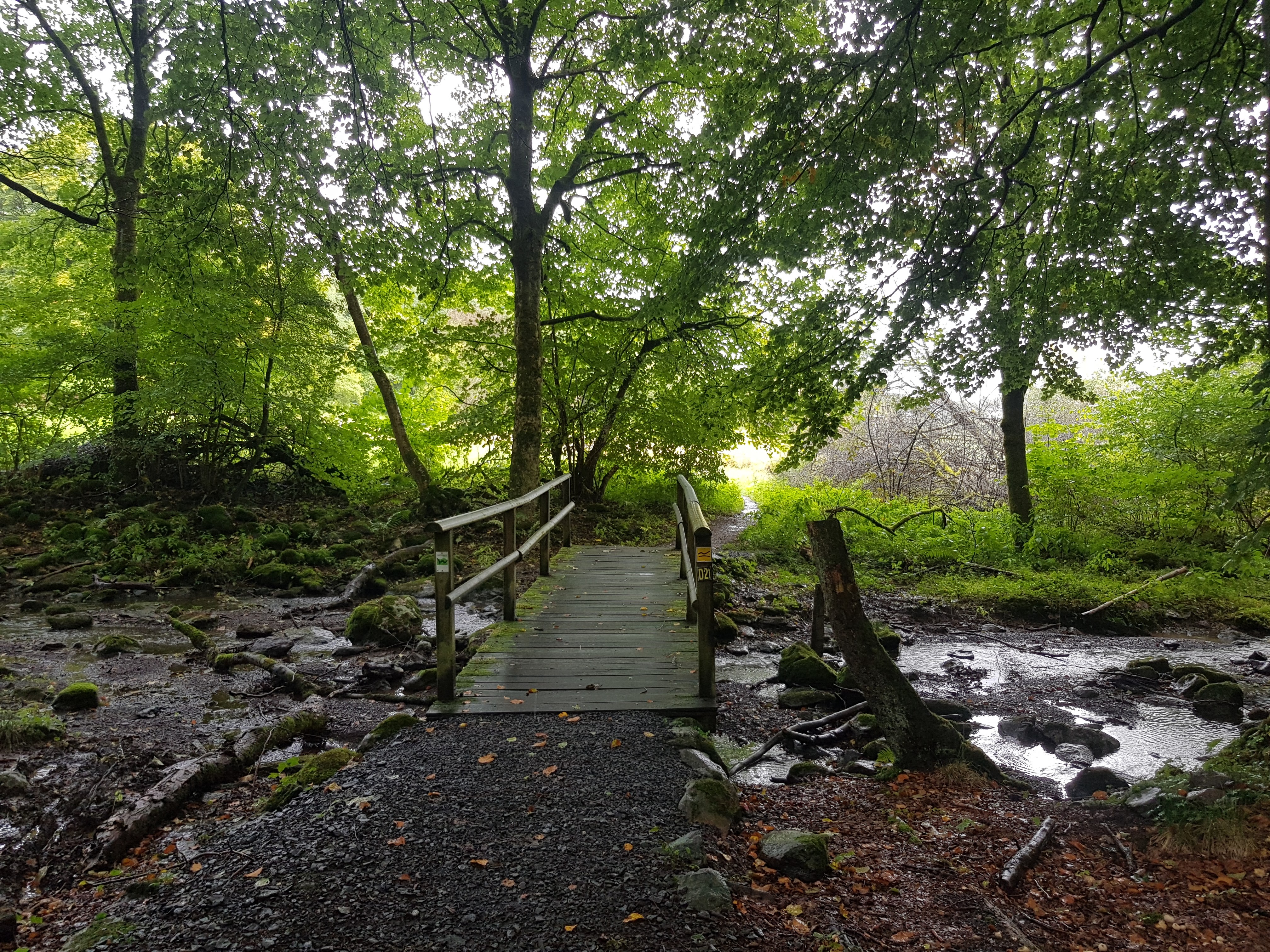 In diesem Abschnitt sind wir so beschäftigt, von Pfütze zu Pfütze zu hüpfen, dass wir die Wegmarkierung nicht im Auge behalten und den Abzweig verpassen. Also zurück durch den Modder. So ungemütlich das auch manchmal ist, trotzdem ist es schön draußen in der Natur. Die Luft ist so würzig und die Regentropfen glitzern wie Edelsteine.
