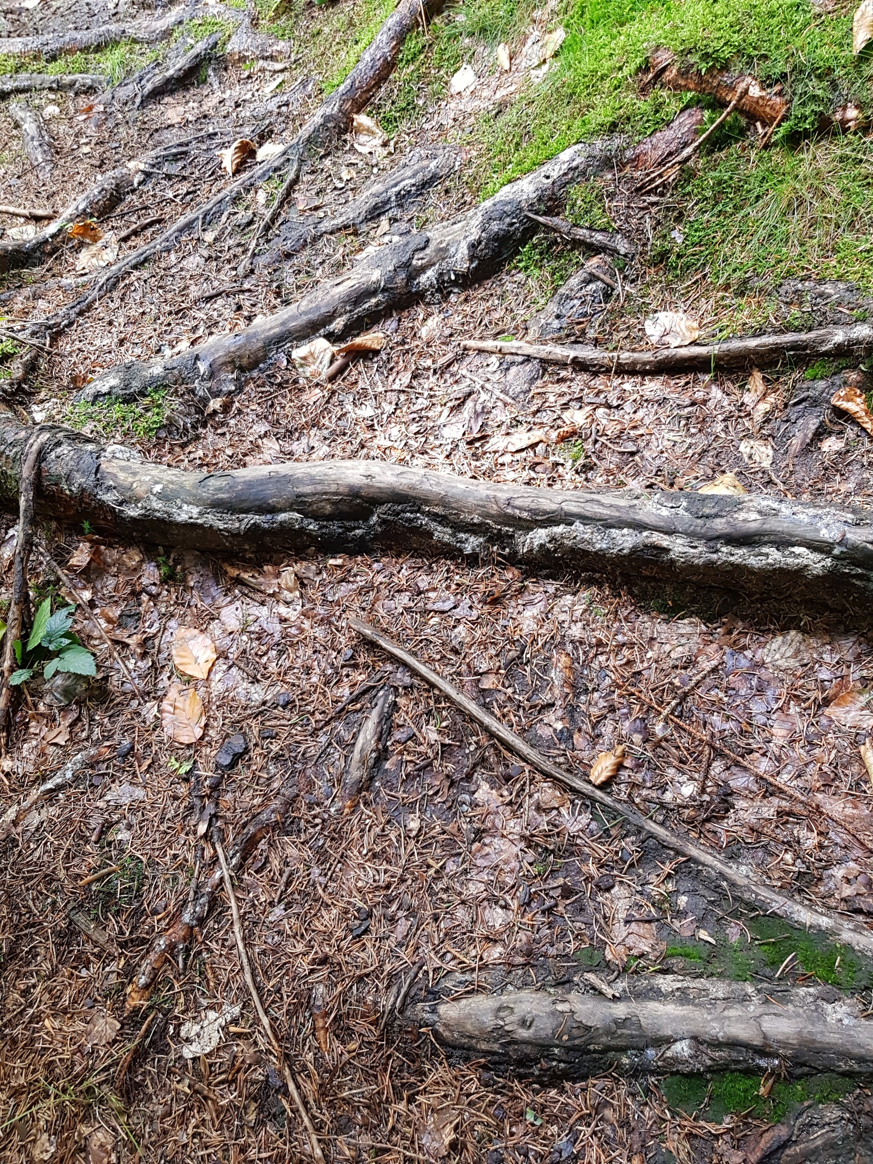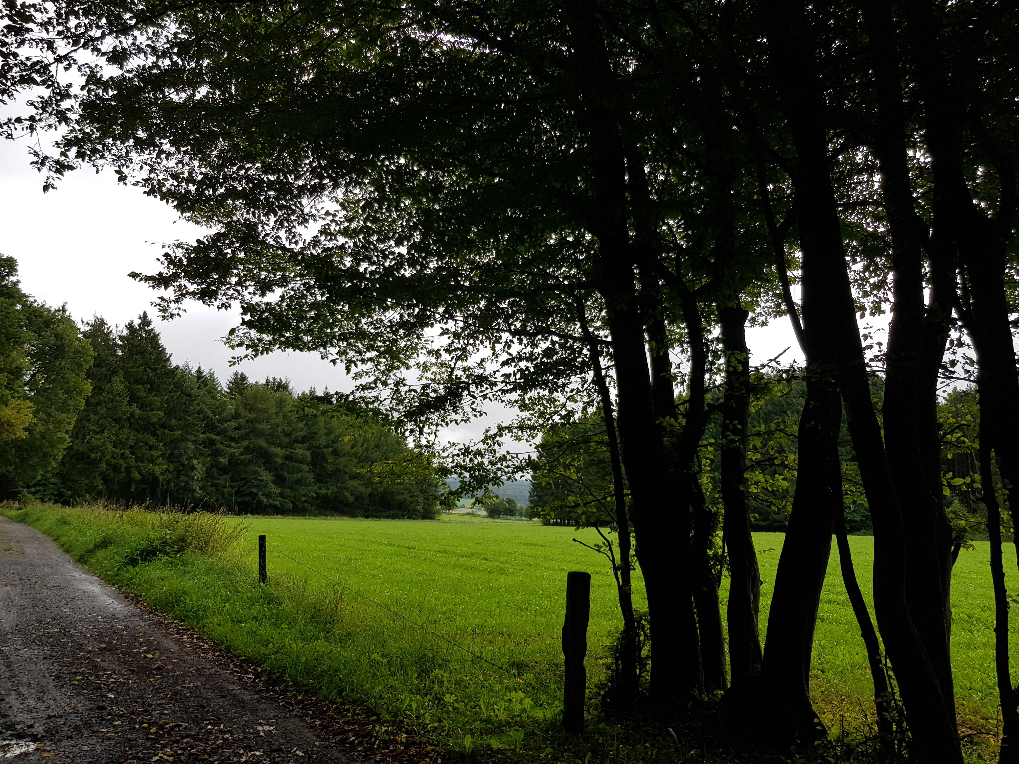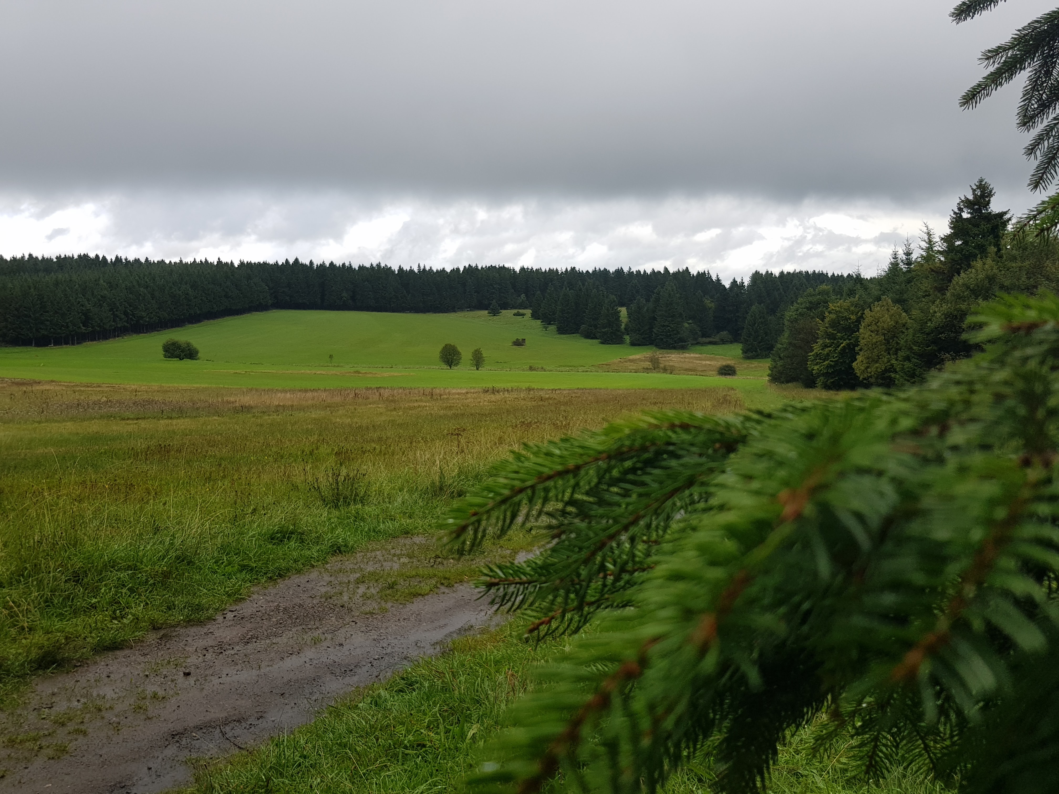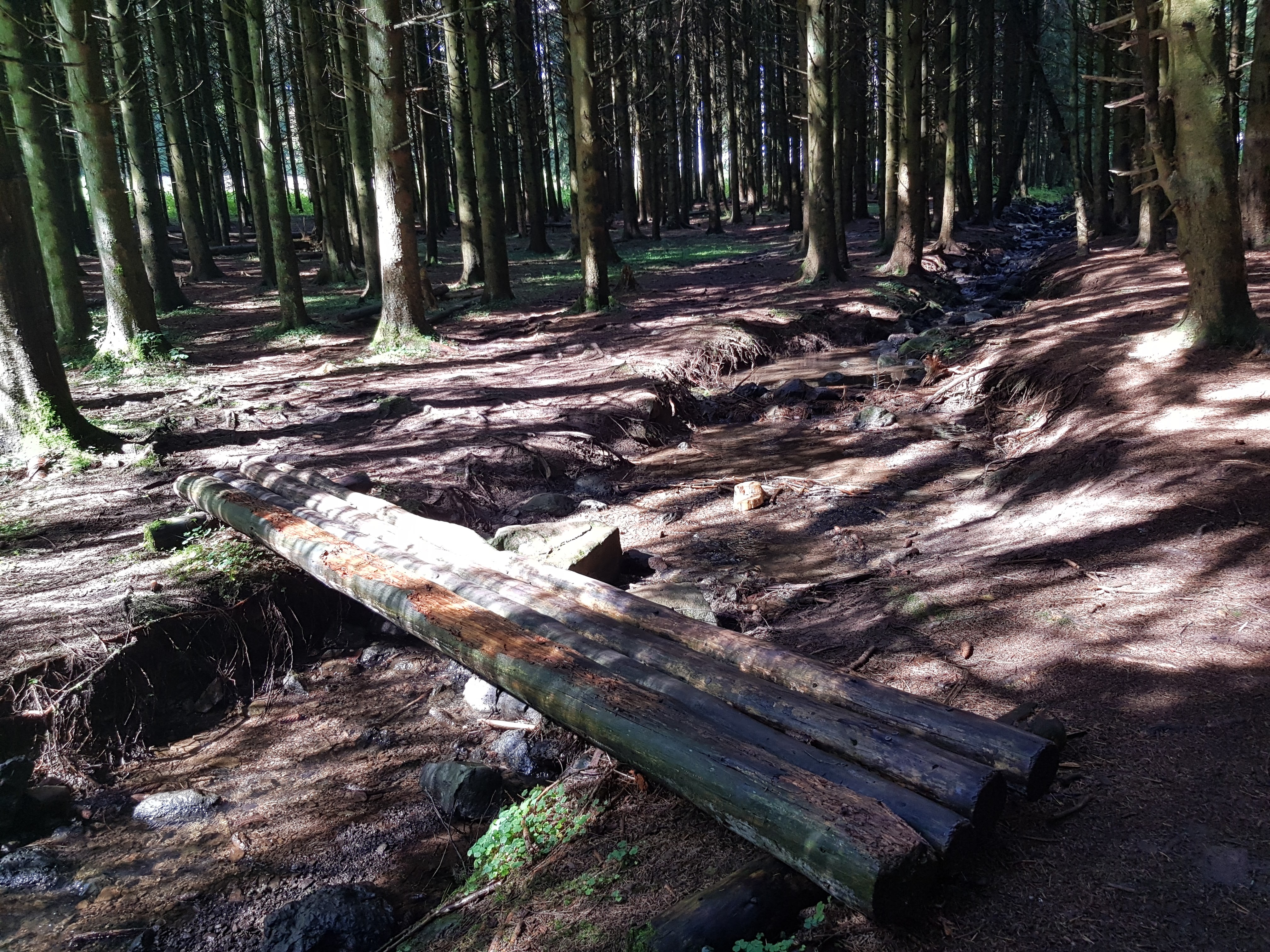 Durch die unaufhörliche Nässe sind manche Waldwege natürlich dermaßen aufgeweicht, dass wir versuchen, auf trockenere Stellen auszuweichen. An einer Stelle wurde uns der Weg großflächig total versperrt durch gefällte Bäume, über die wir mehr oder weniger sportlich drüberklettern. Das bringt mich auf die Idee, mal von allen Wegsorten, die uns unter die Füße kommen, ein Foto zu machen.