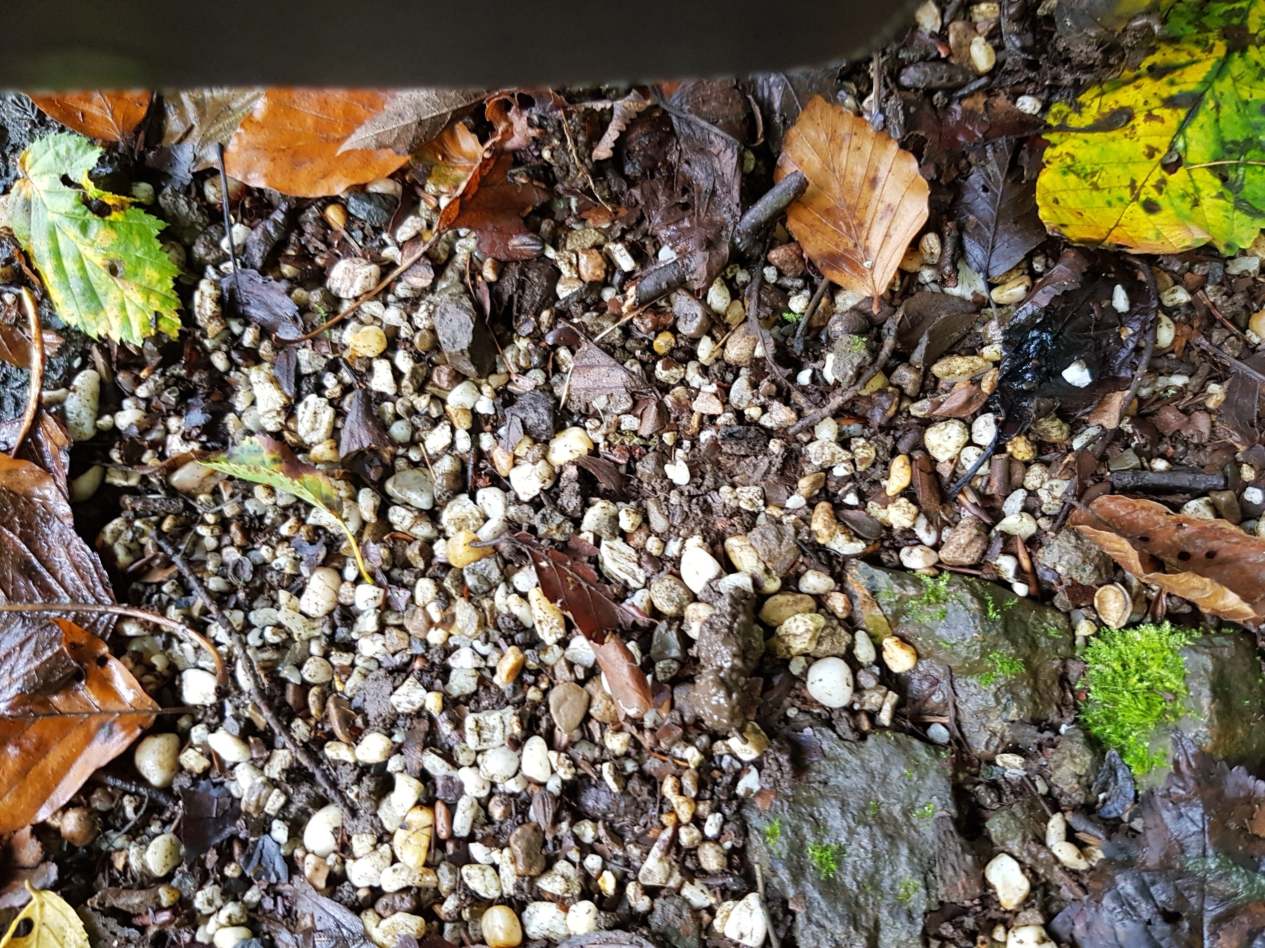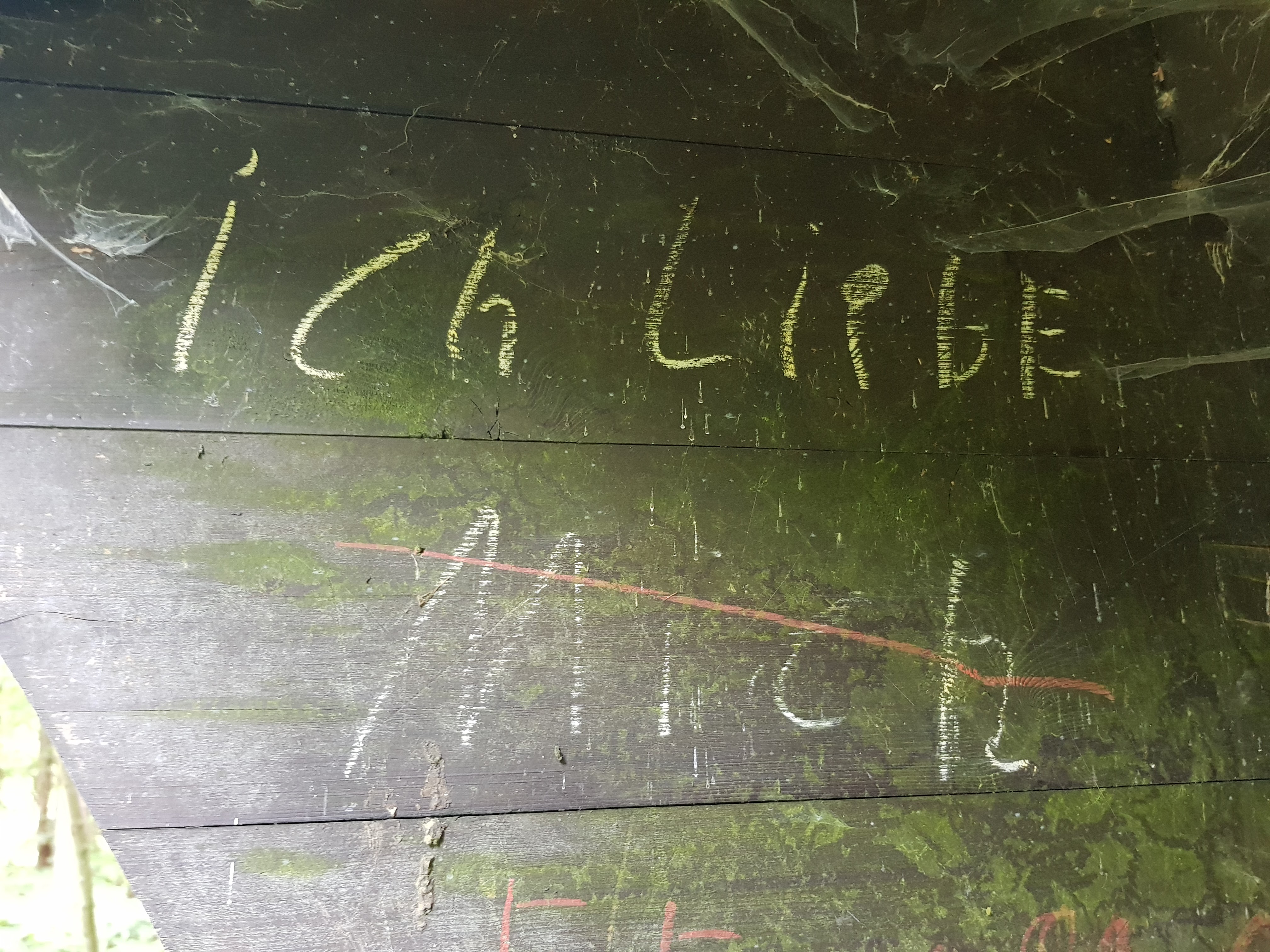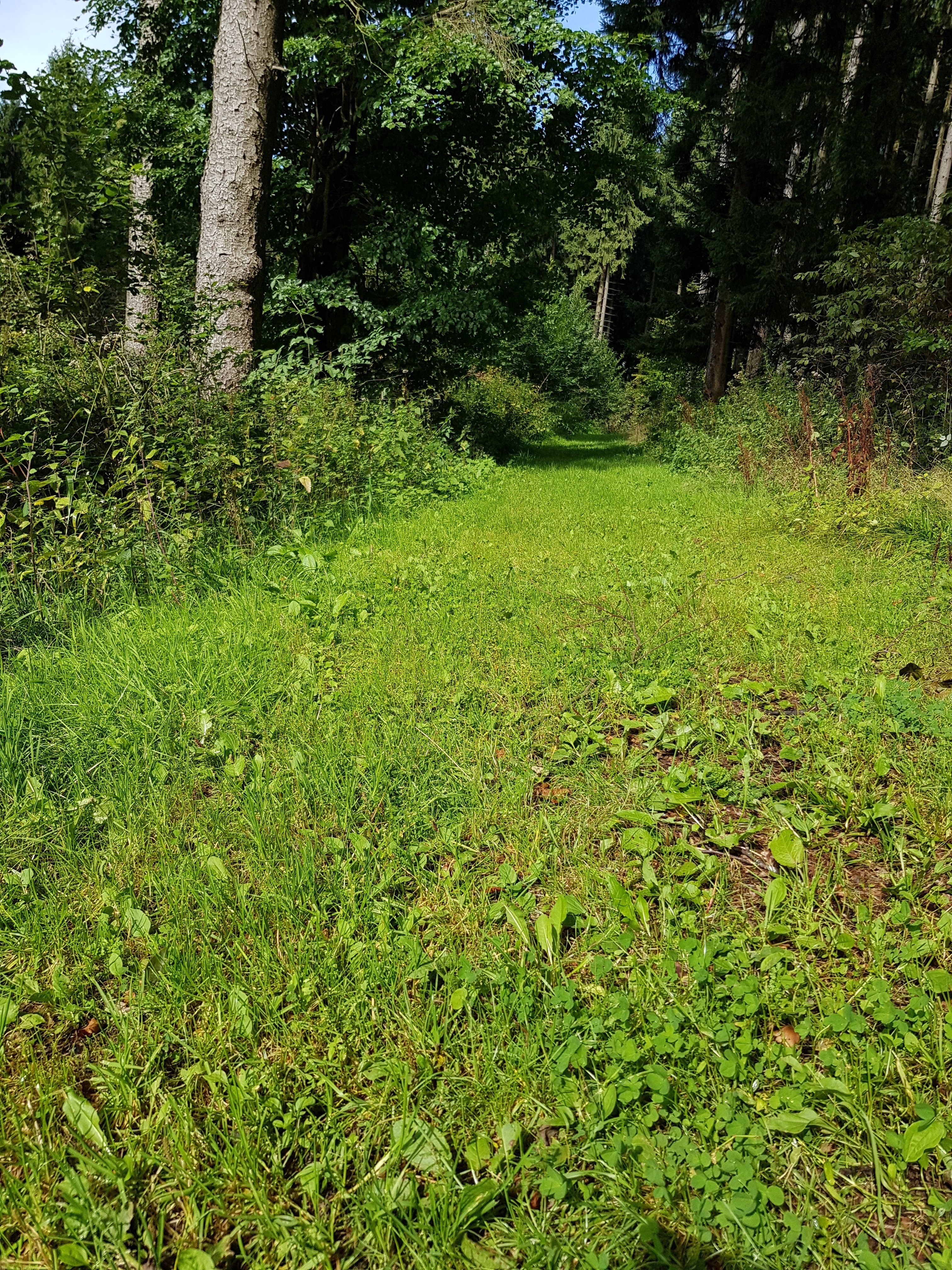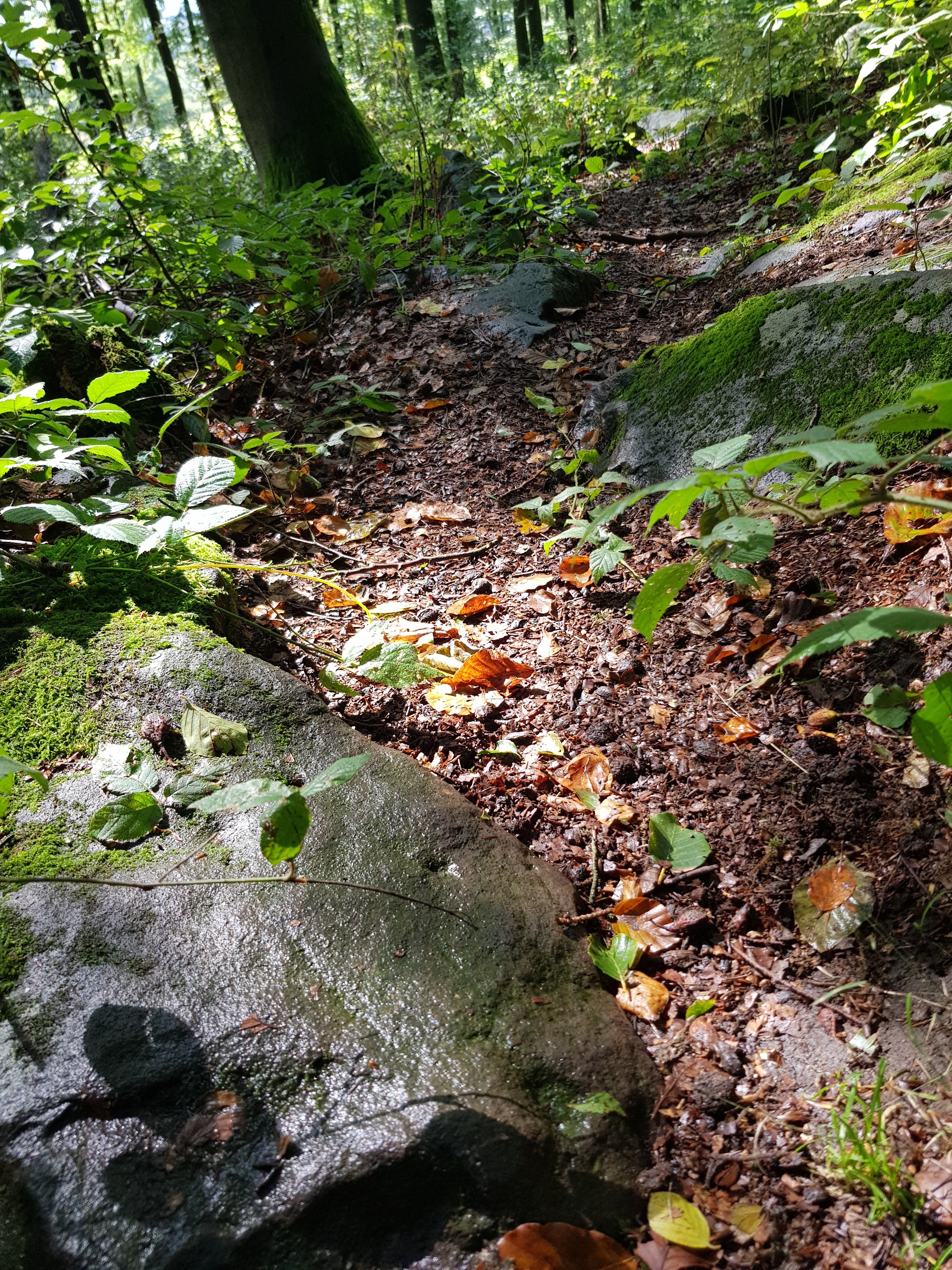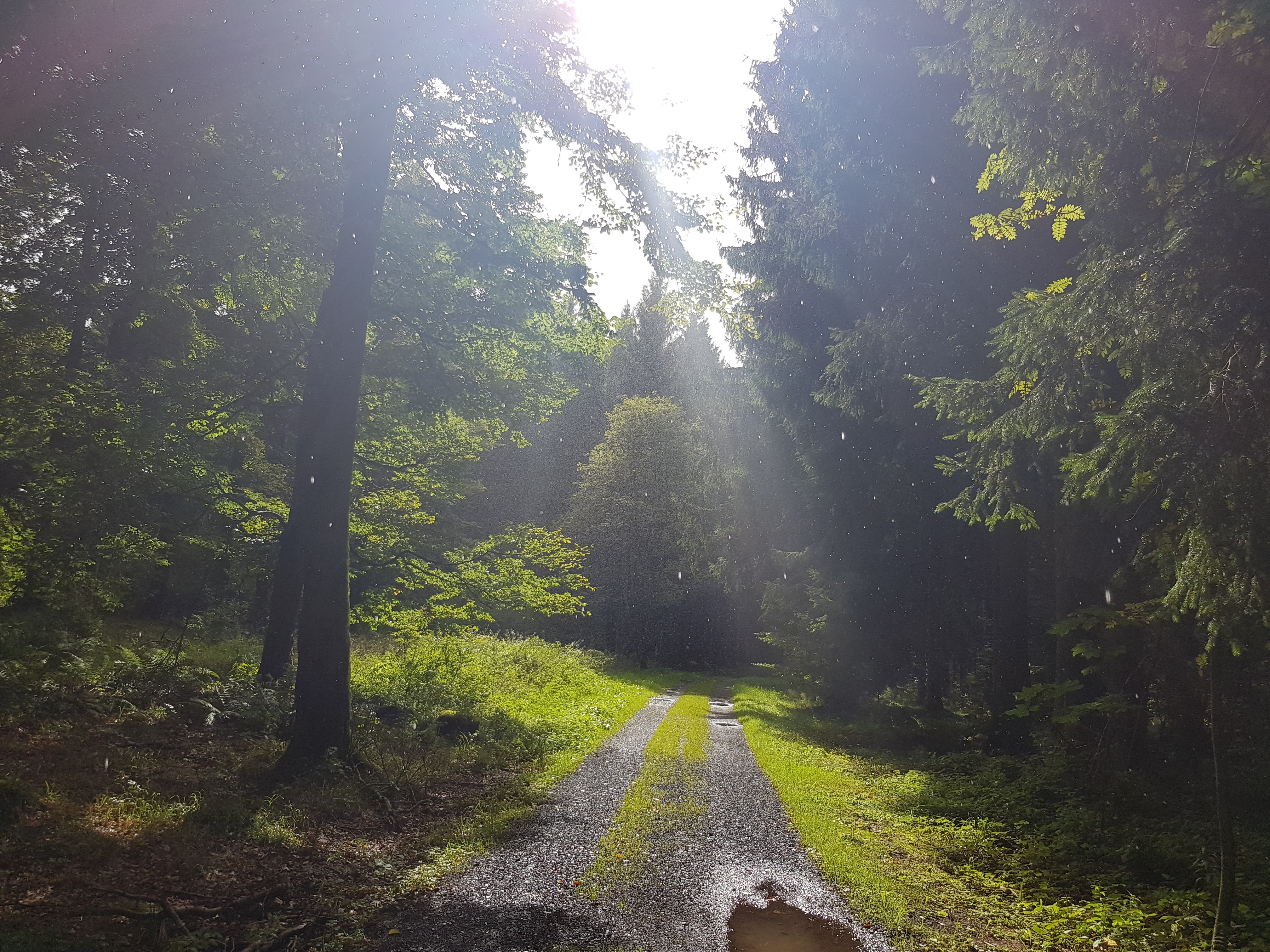 Durch die unaufhörliche Nässe sind manche Waldwege natürlich dermaßen aufgeweicht, dass wir versuchen, auf trockenere Stellen auszuweichen. An einer Stelle wurde uns der Weg großflächig total versperrt durch gefällte Bäume, über die wir mehr oder weniger sportlich drüberklettern. Das bringt mich auf die Idee, mal von allen Wegsorten, die uns unter die Füße kommen, ein Foto zu machen.