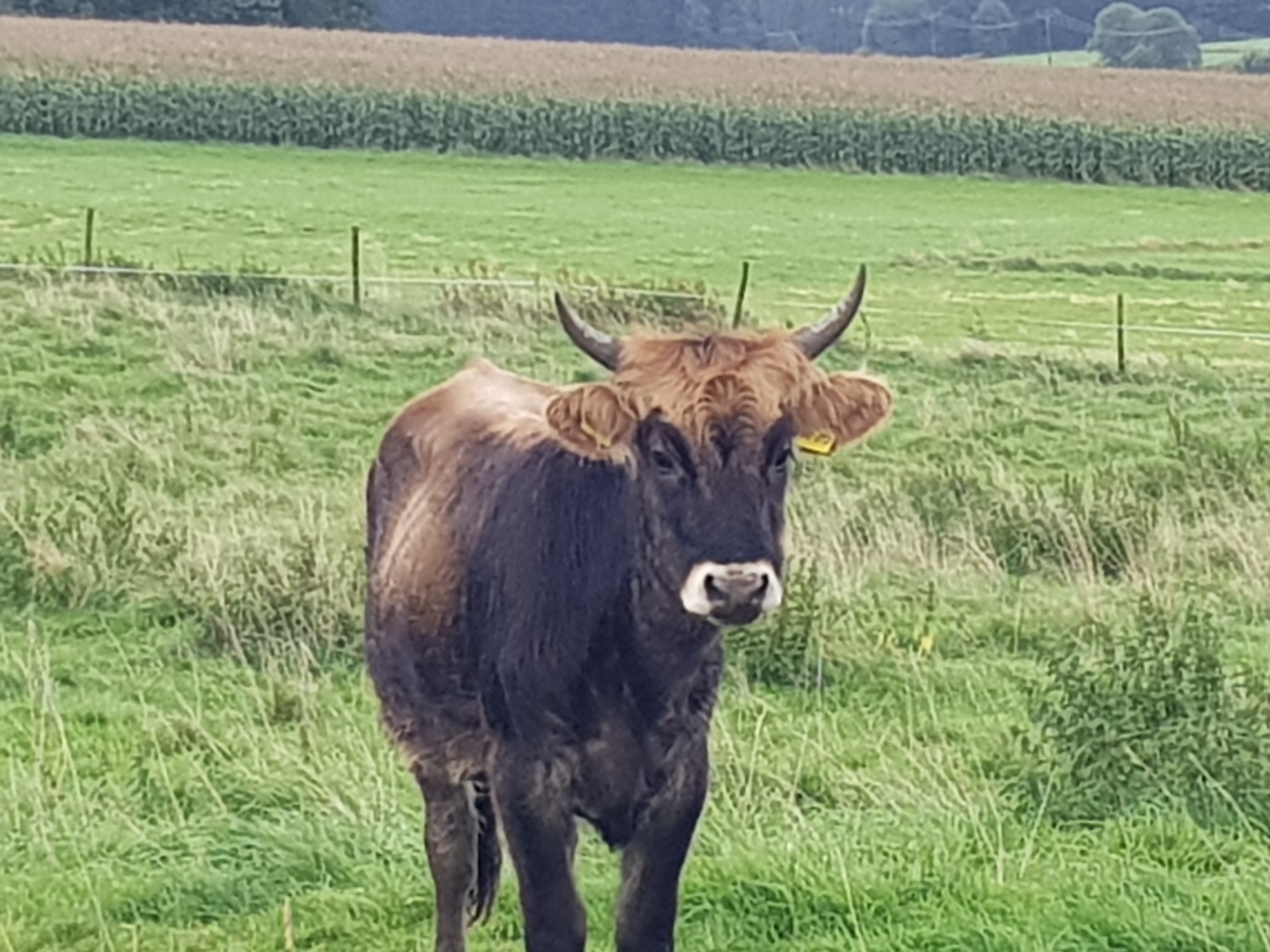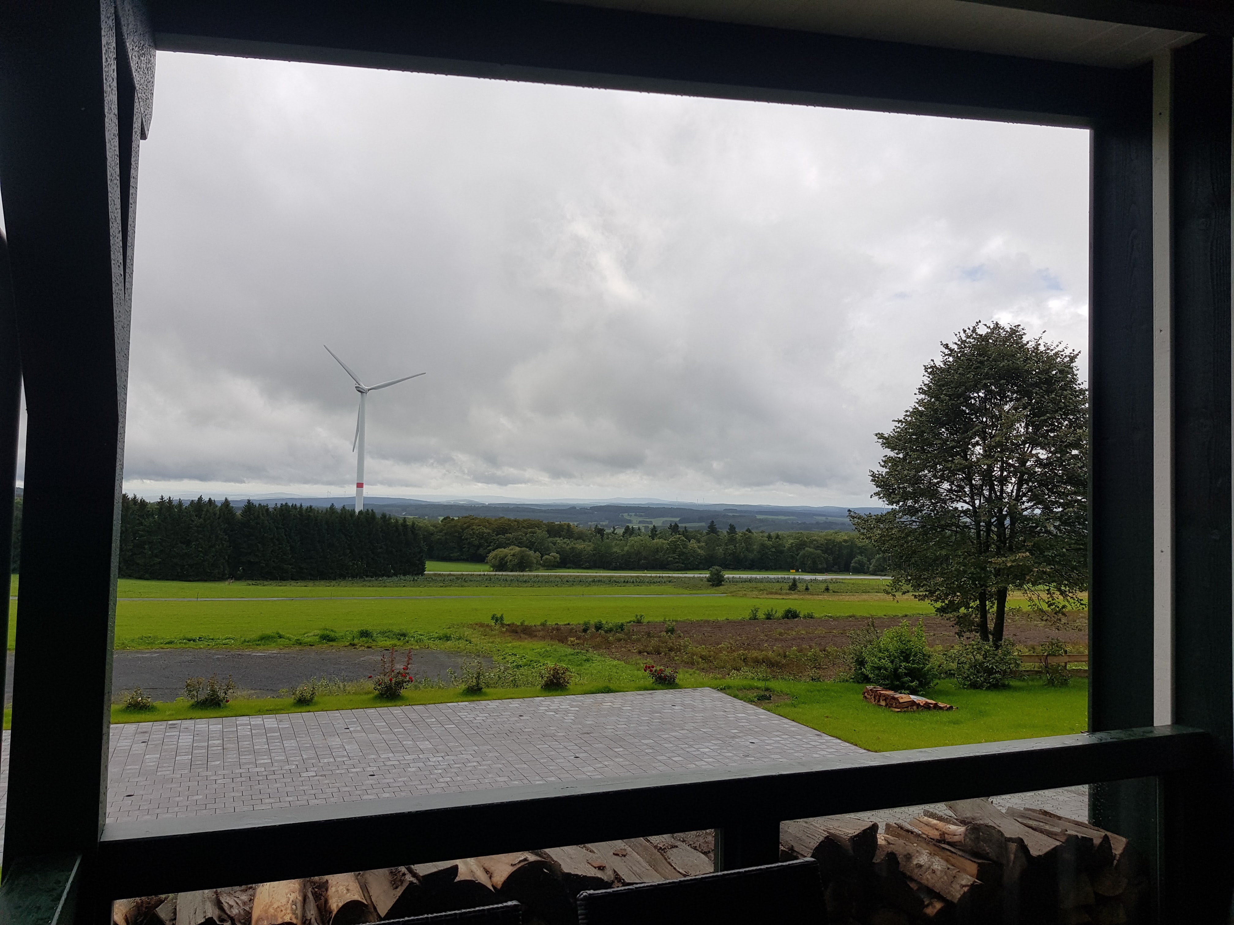 Dann ein sehr schöner Weg an einem Bach und ein paar Vertretern einer merkwürdigen Rinderrasse entlang und immer wieder schweift der Blick in weite Fernen. Wunderschön, auch bei Regen. Nach ca. 8 km erreichen wir die Fuchskaute, ein riesiges Restaurant auf dem höchsten Punkt des Westerwaldes. Inzwischen hat es auch mit regnen aufgehört und wir beschließen, uns drin etwas trocknen zu lassen und was Warmes zu trinken. Ich schaue mich mal ein bisschen um und kann durch die Scheiben einen gemütlichen Raum mit Piano, Kamin und Panoramafenstern entdecken, hinter denen man es sich mit Kissen gemütlich machen kann.