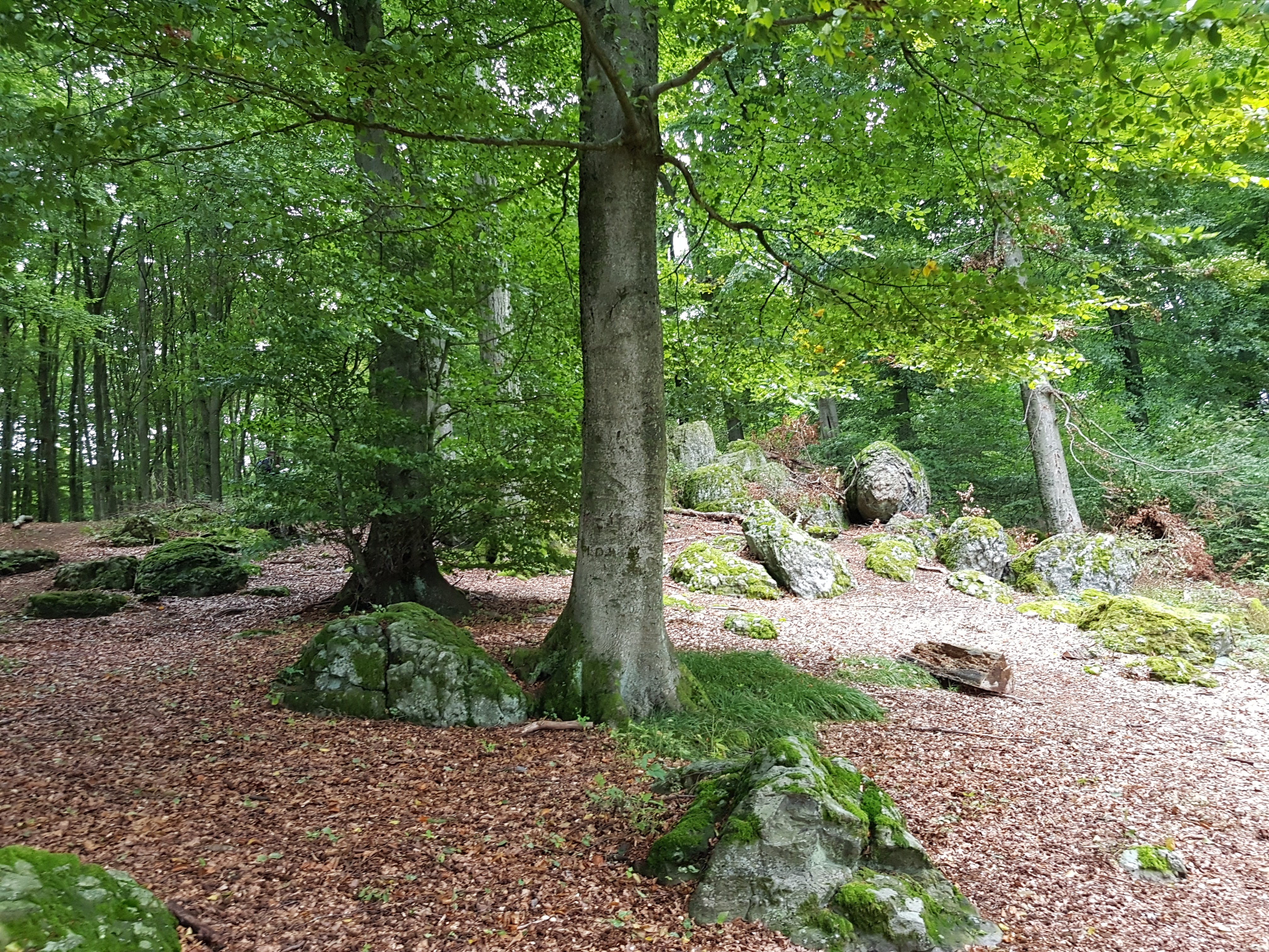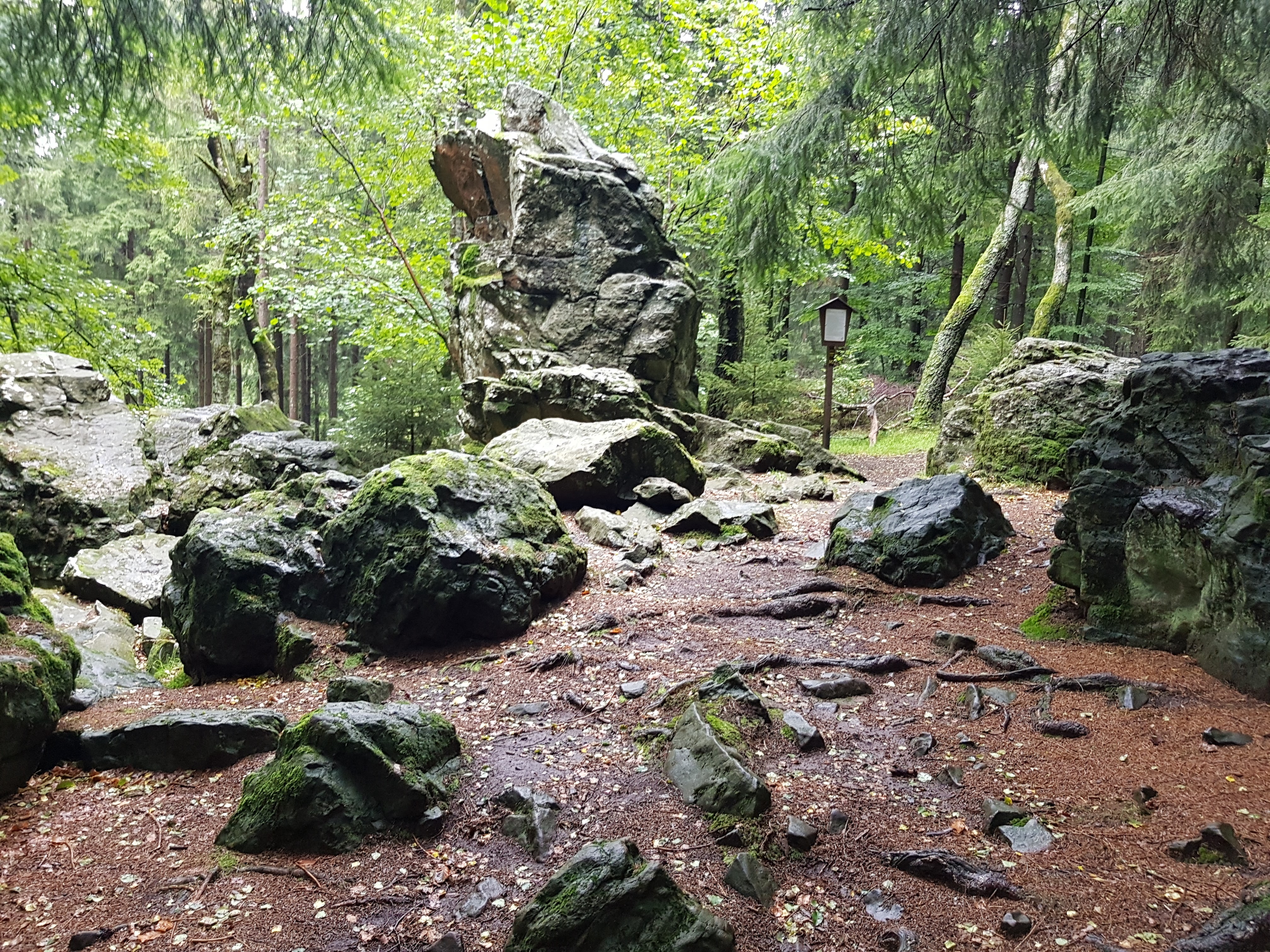 Meine Wandergruppe hat keine Aufstiegsambitionen, ich schon. Von dort kann man bis zur Fuchskaute sehen. Auch Berlin ist angezeigt mit 480 km Entfernung. Wir kommen an diversen Tierarten des Wildparkes vorbei, u.a. einem total lustigen Papagei, der „Hallo“ sagt, „Paul“ und ganze Sätze, die aber niemand versteht. Es geht weiter aufwärts durch einen herrlichen Buchenwald zu den Wolfssteinen, beeindruckenden Felsformationen, die der Sage nach dem Teufel zu verdanken sind. Er wollte einen Turm bis in den Himmel bauen, der aber beim Aufrichten eingestürzt ist. So liegen die Steine nun immer noch rum.