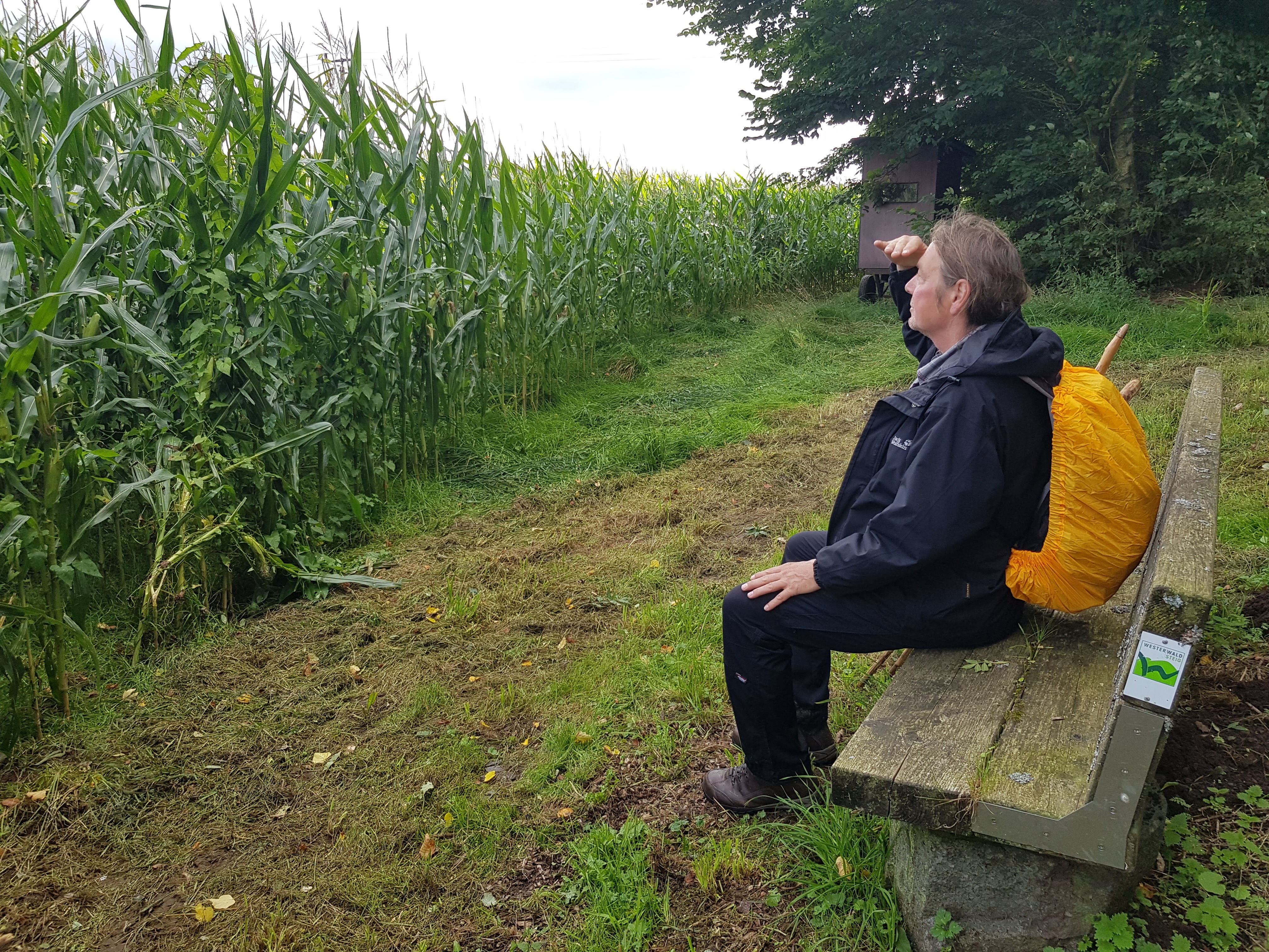 Die Maisfelder sind hier fast immer durch Weidestromdraht geschützt. Fragt sich, ob vor den hungrigen Wanderen oder Tieren. Ich klaue trotzdem einen Kolben und fange an zu knabbern, schmeckt aber nicht. Besonders amüsant finden wir eine Bank mit Maisfeld-Aussicht: