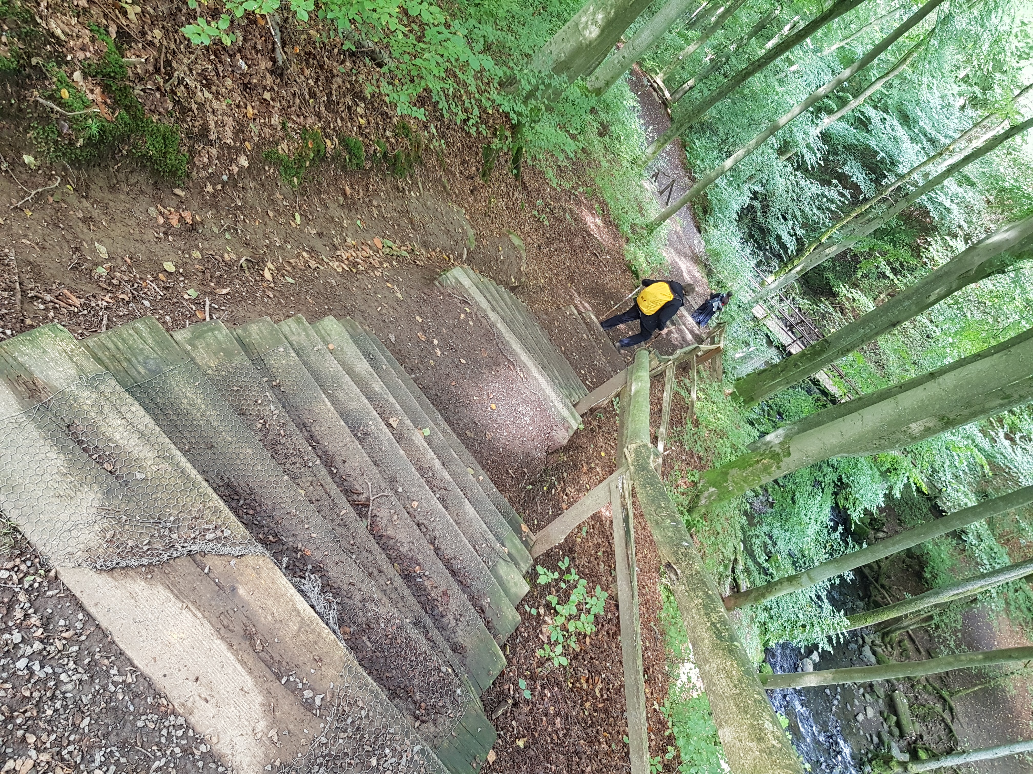So trotten wir vor uns hin und manchmal sehne ich mich fast nach Regen. Schließlich habe ich heute diese unförmige Hose angezogen, unter der ich dermaßen schwitze, dass eigentlich unten aus den Hosenbeinen kleine Dampfwölkchen aufsteigen müssten. Zur Halbzeit legen wir eine Pause ein an einem Gehöft, wo man intuitives Bogenschießen üben kann, was immer das auch bedeutet. Kurz darauf erreichen wir die zu recht vielgepriesene Holzbachschlucht. Kerstin probiert gleich auf der ersten Treppe, wie hart die Stufen sind. Nicht härter als sie selbst!