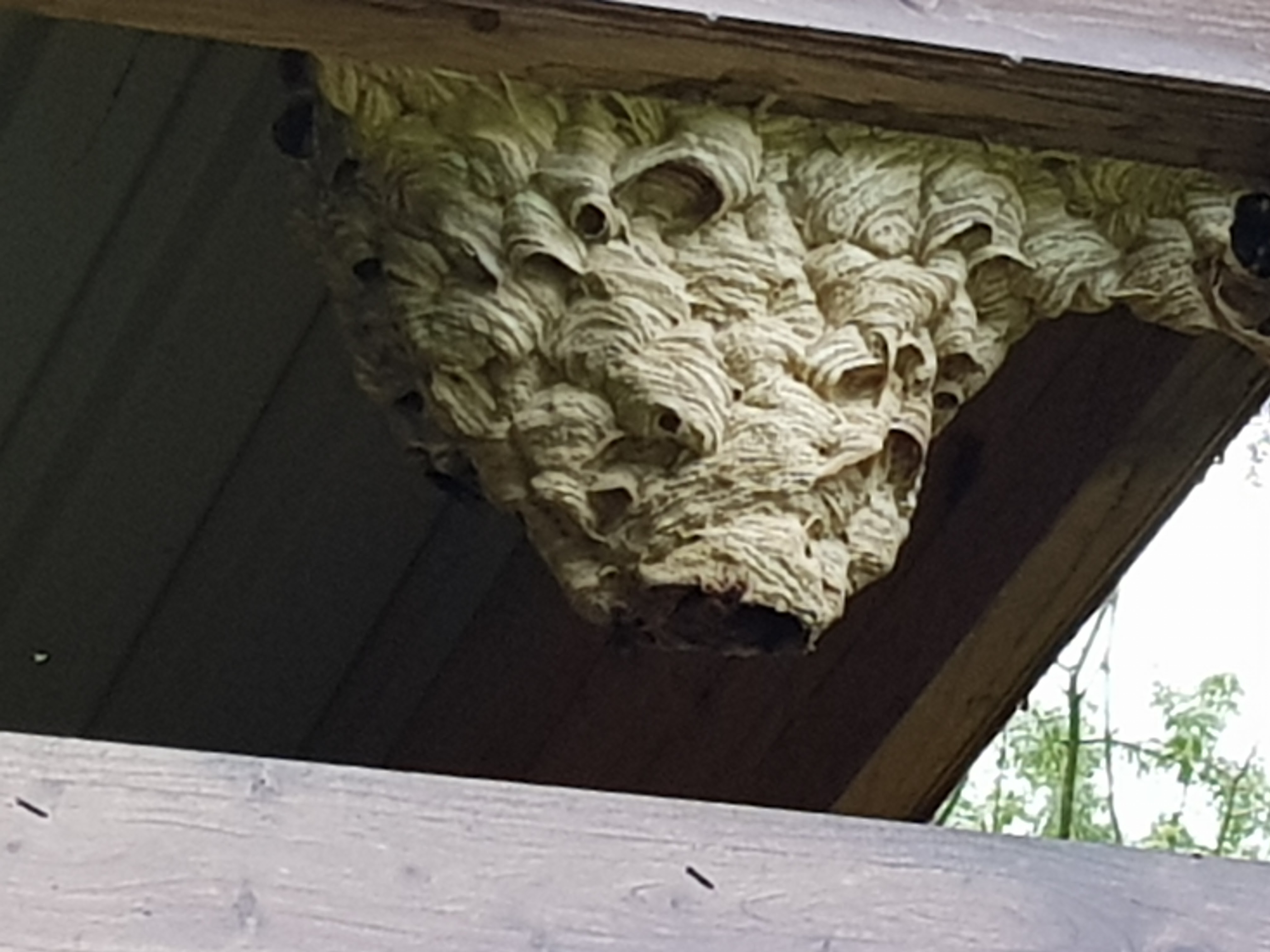 Nun geht mein Wunsch in Erfüllung: es regnet. Na also! Es ist faszinierend zu beobachten, wie man den Regen auf sich zukommen sieht. Auch ein Hornissennest zieht unsere Aufmerksamkeit auf sich.