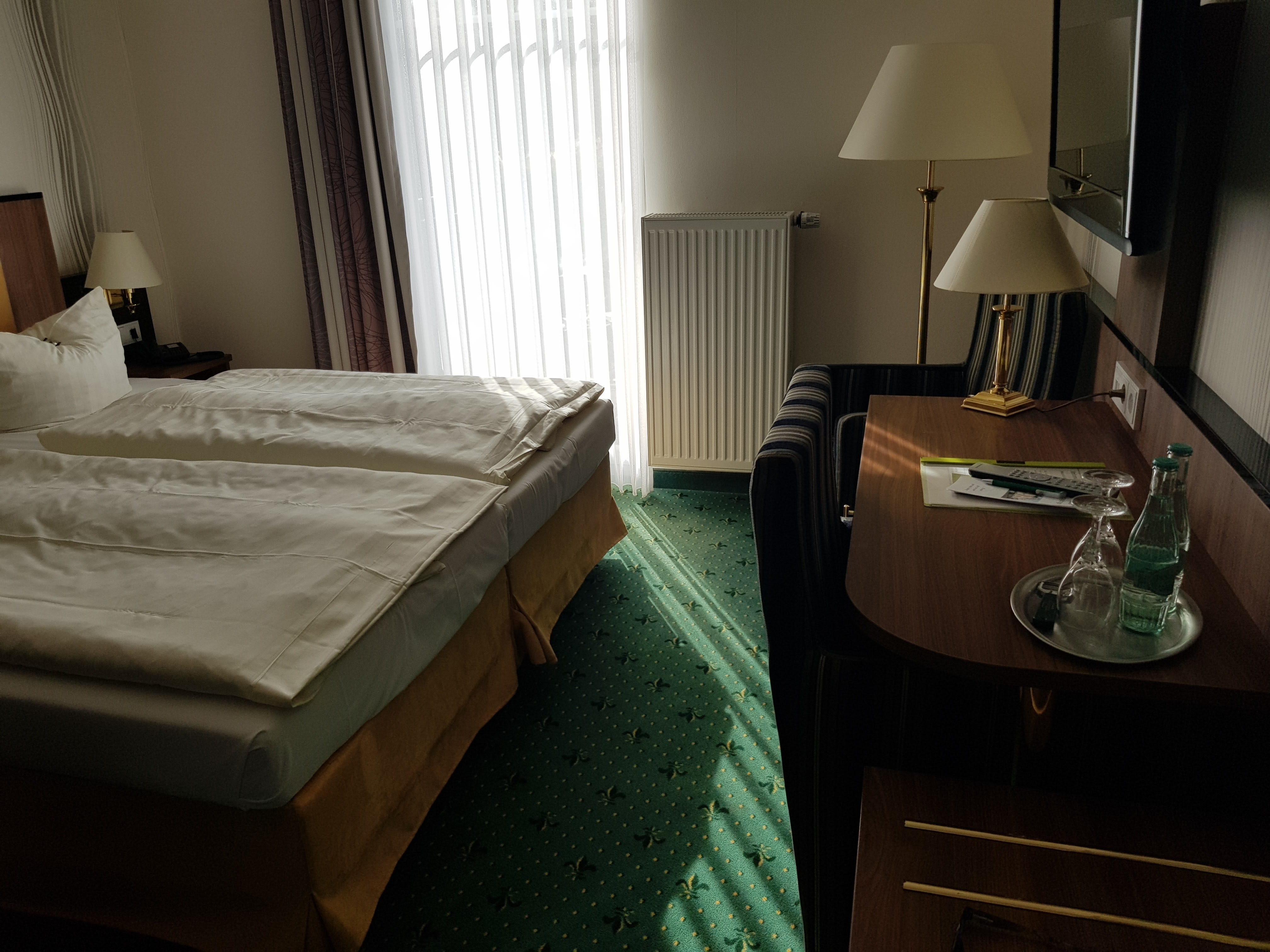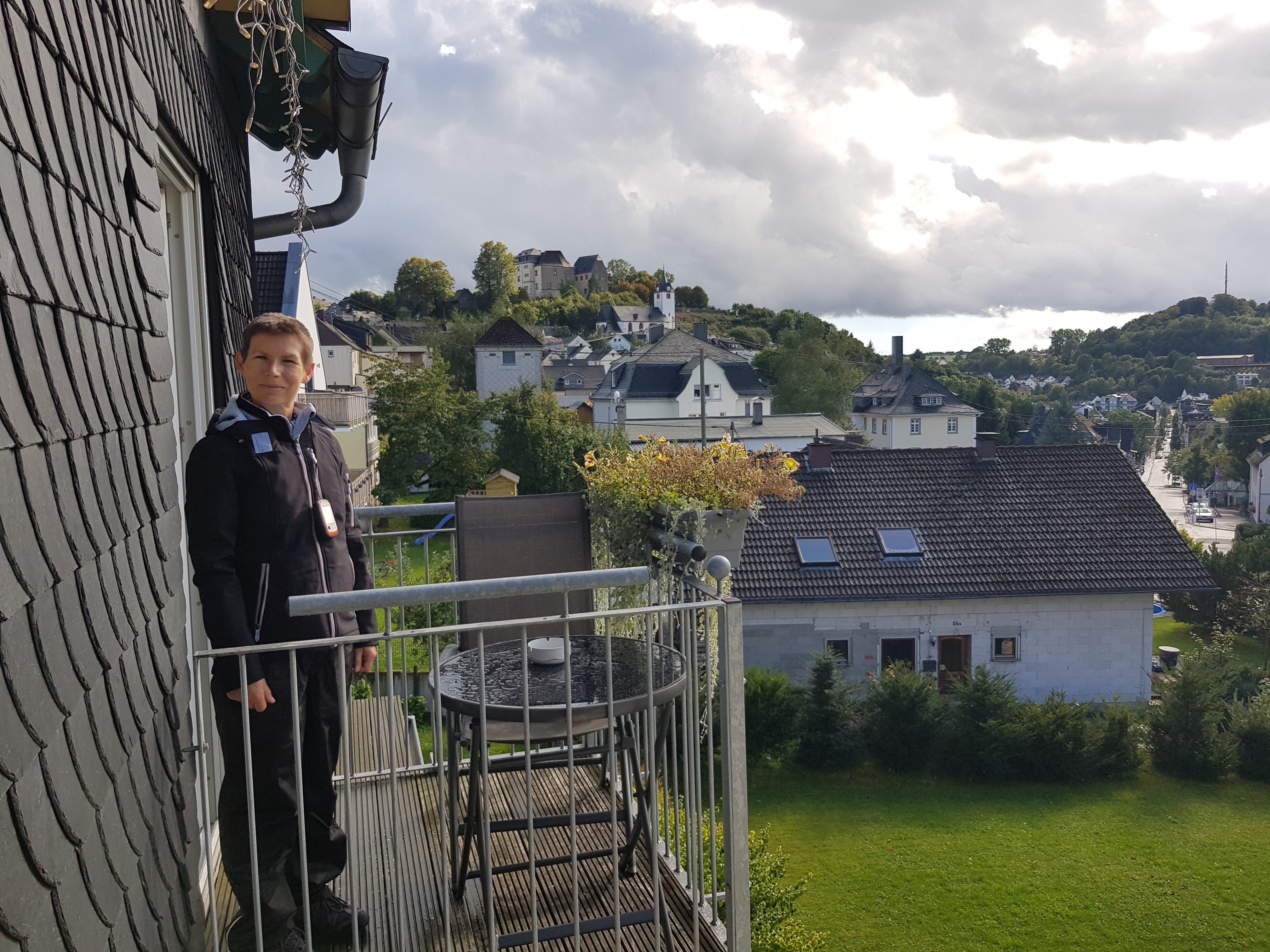 Wir werden langsam unruhig und schauen dann doch mal auf den Stadtplan. Es stellt sich schließlich heraus, dass wir vor einer Stunde schon am Hotel vorbeigelaufen sind und es nicht gemerkt haben. Was ist heute nur los? Es bleibt uns nichts anderes übrig – Kommando zurück! Kerstin, die unterdessen vergeblich mitten im Wald den heutigen Cache gesucht hat, stößt auch wieder zu uns. Wir kommen gegen 18:30 Uhr zum zweiten Mal zum Westerwälder Hof und sind froh, für heute die Wanderschuhe und Regenkleidung ablegen zu können. Unsere Zimmer sehen so aus: