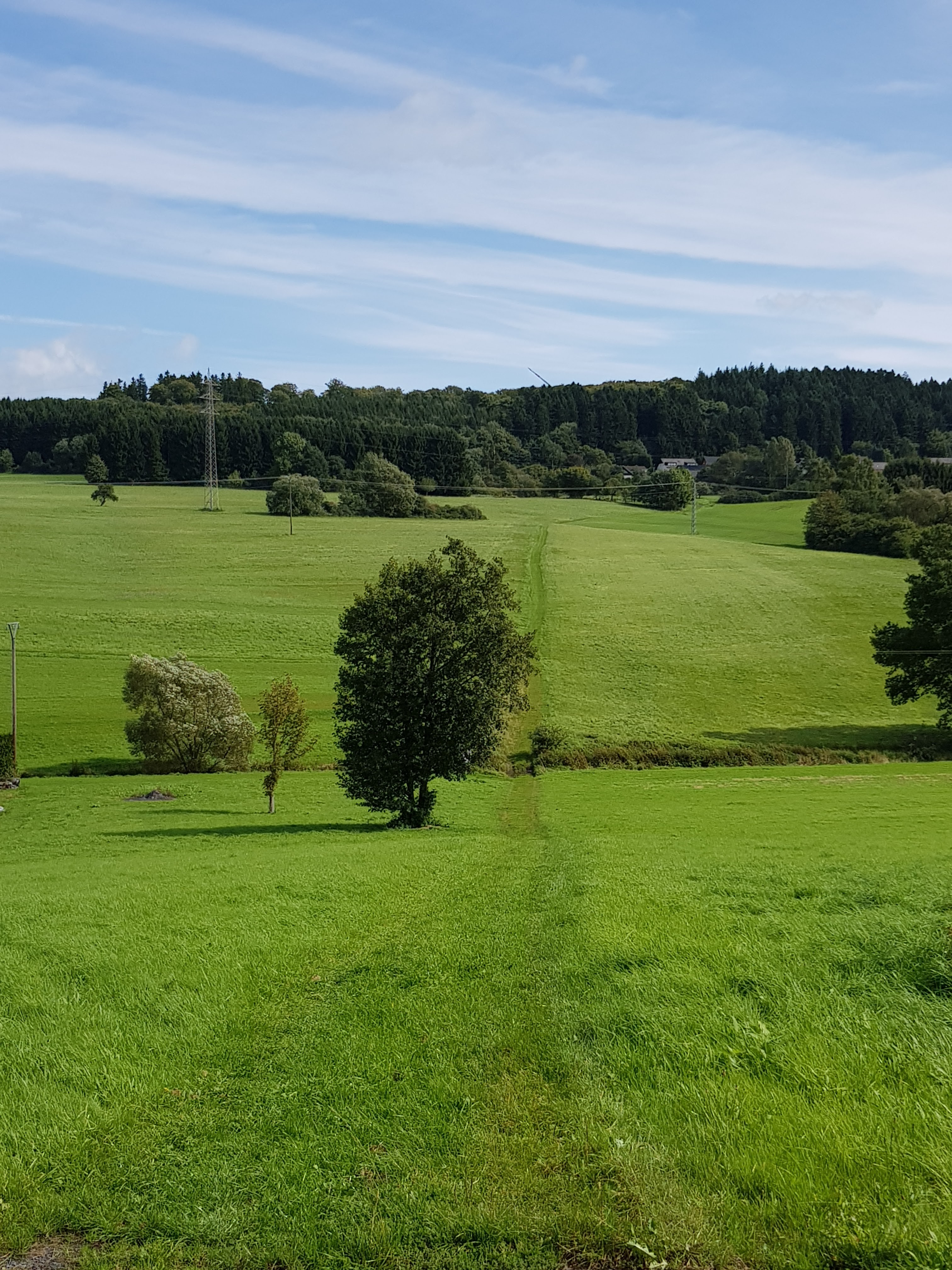 Wir folgen brav der Ausschilderung und machen dann trotzdem einen entscheidenden Fehler und biegen zu früh ab. Irgendwann merken wir dann, dass da was nicht stimmt. Erst denken wir, dass hier die Markierungen bloß fehlen, aber als dann Kerstin anruft und uns den Weg beschreibt, den sie gegangen ist, werden wir doch stutzig und beschließen, umzukehren. Das heißt, 2 km mehr als geplant und dass Kerstin nun nicht mehr hinter uns ist, sondern einen enormen Vorsprung haben muss. So schnell werden wir sie nicht mehr einholen. Aber egal, wir genießen die frische, würzige Luft, die wunderschönen Wege und weiten Blicke. Fast wie in der Rhön.