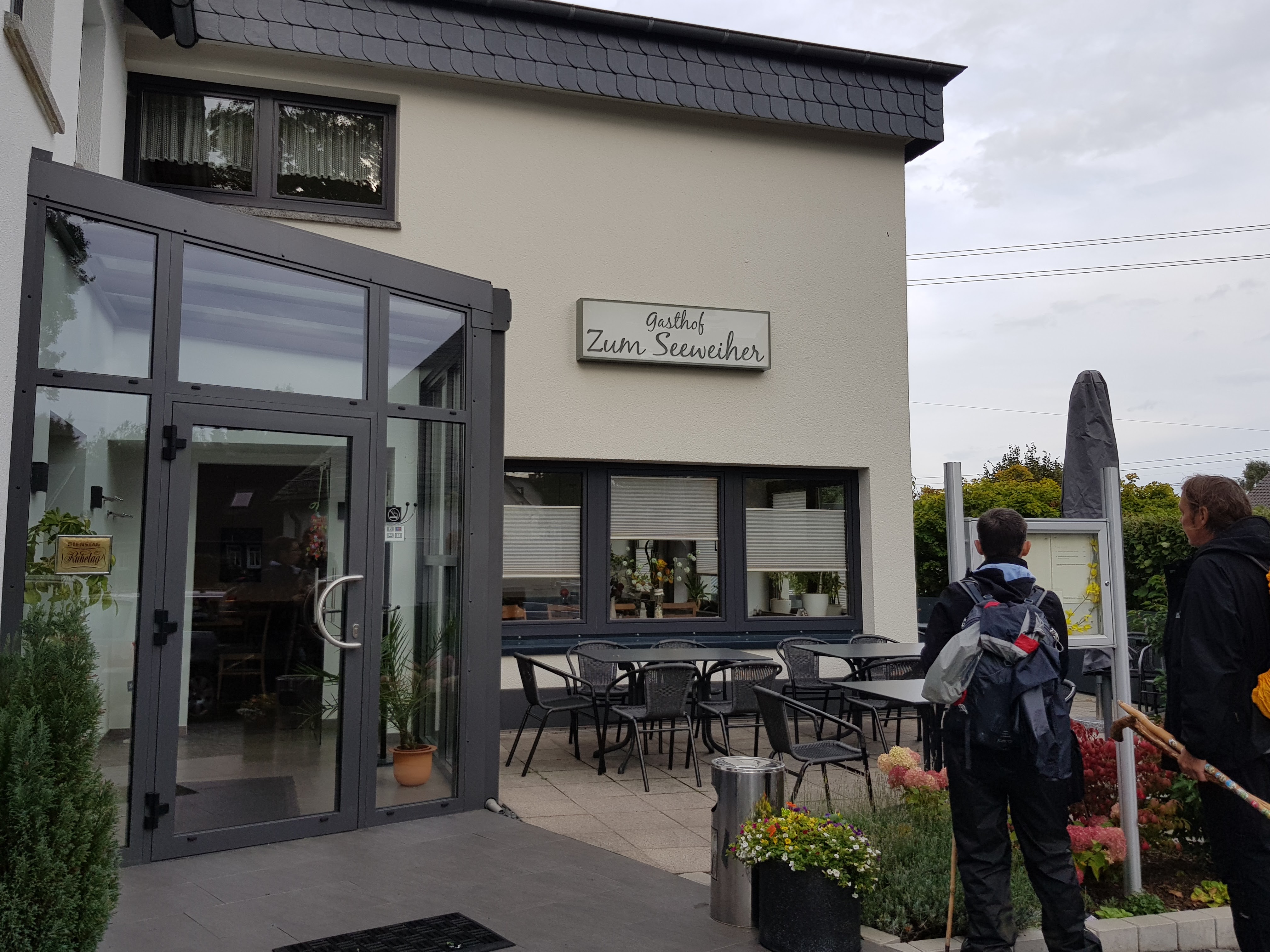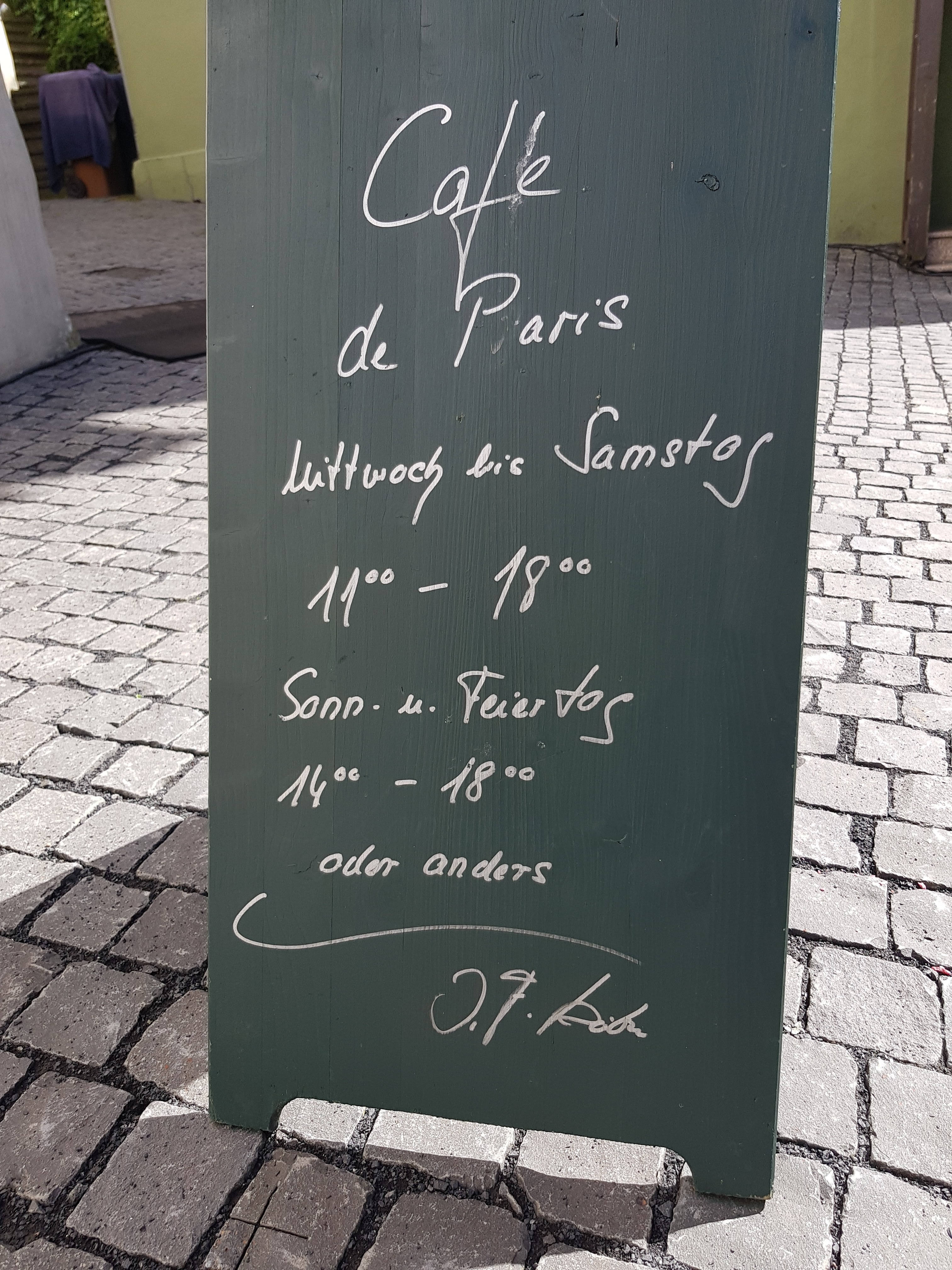 Wir holen schließlich unser Gepäck ab aus dem Hotel, verabschieden uns und flüchten vor dem einsetzenden Regen, der uns offensichtlich auch Auf Wiedersehen sagen will, in ein Café. Wir werden neugierig beäugt, wahrscheinlich vor allem wegen der Wanderstöcke. Die sind ja auch ein Hingucker. Nach leckerem Chai Latte gehts nun aber wirklich ab zum Bahnhof. Die Umsteigezeiten in Au und Köln werden leider nicht ausreichen für eine Zigarette, weswegen meine Raucher vorsorglich ihren Nikotinvorrat bis zum Anschlag auffüllen. Erst zum Schluss fällt uns das Schild rechts unten auf: