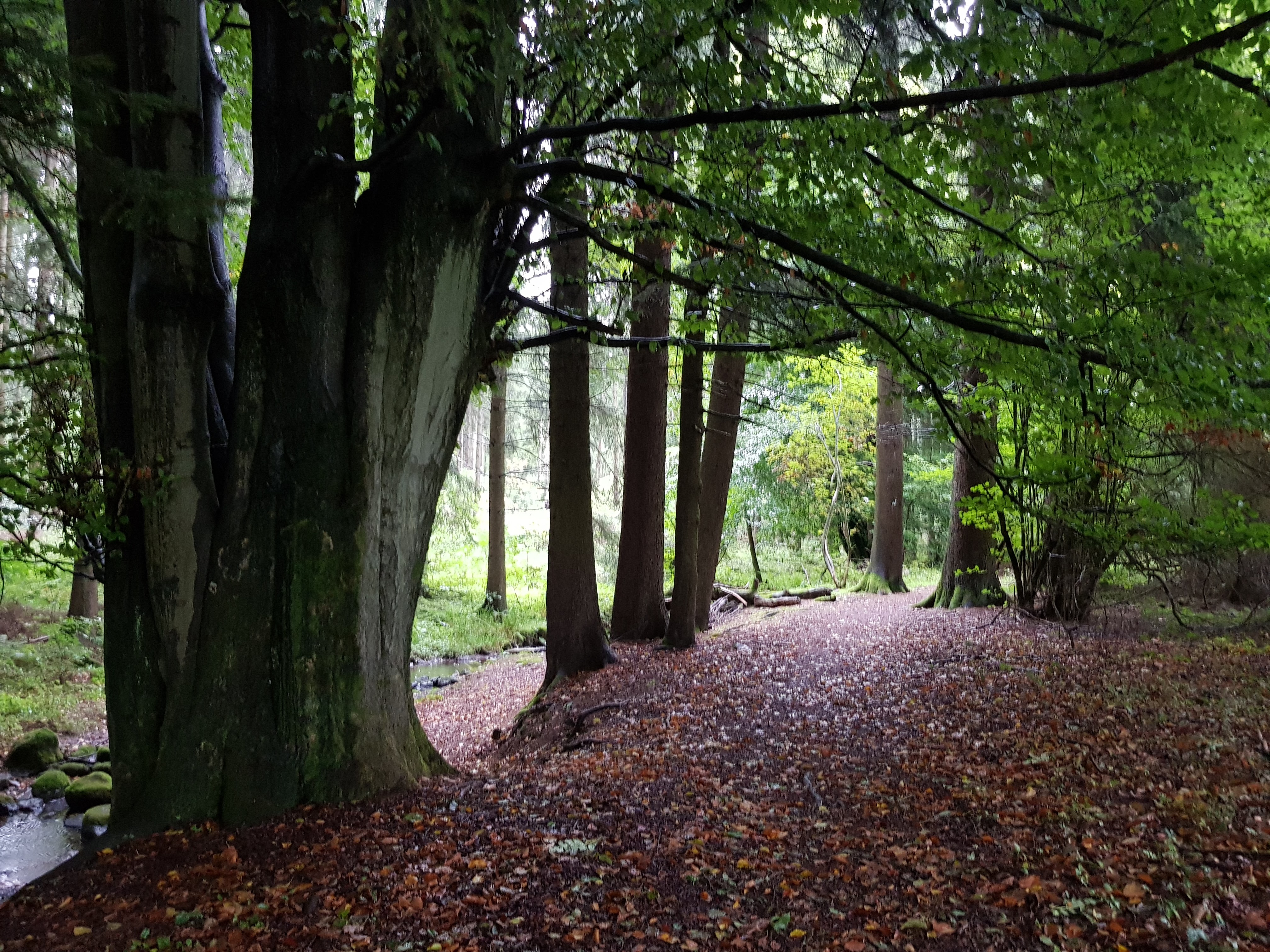 Nach kurzer Zeit Auf der Dorfstraße biegen wir ab auf einen wunderschönen Weg unter Weiden neben einem Bachlauf. Der Himmel verspricht nichts Gutes, schwere, dunkle Wolken bahnen sich ihren Weg über unsere Köpfe und schütten ihren Inhalt über uns aus. Ungeachtet dessen hat Kerstin wieder ihr Programm abzuarbeiten und das Bilderkennungsprogramm läuft auf Hochtouren.