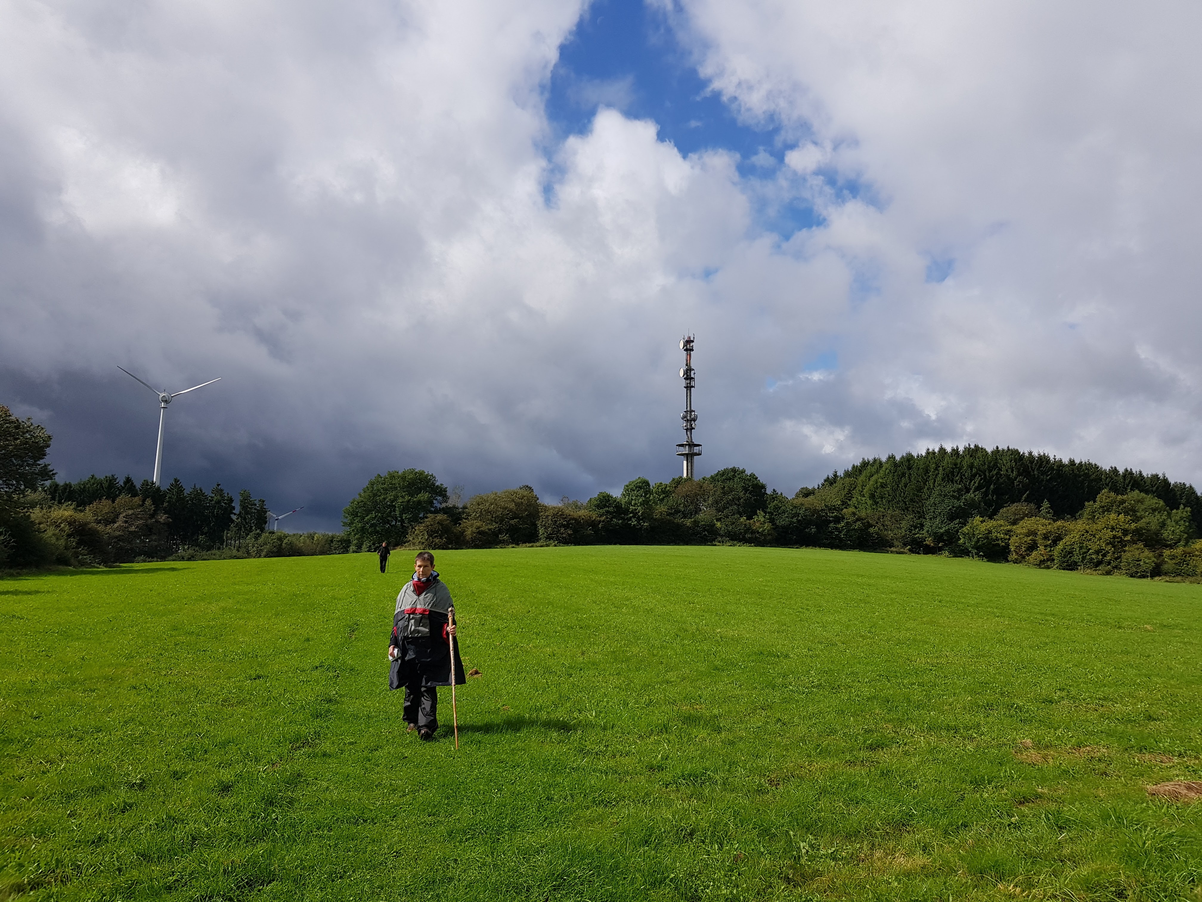 Ausgestattet mit Regenhosen, Regenjacken und -capes starten wir wieder um 9:30 Uhr. Heute stehen uns nur 18 km bevor. Zunächst gehts den Berg hoch zu dem Punkt, an dem wir gestern den Westerwaldsteig verlassen hatten. Jesus gibt uns das göttliche Geleit für den heutigen Tag mit einem Segensspruch, der unangenehm berührt. Das Wort „Heil“ ist in ähnlichem Kontext zu oft missbraucht worden.