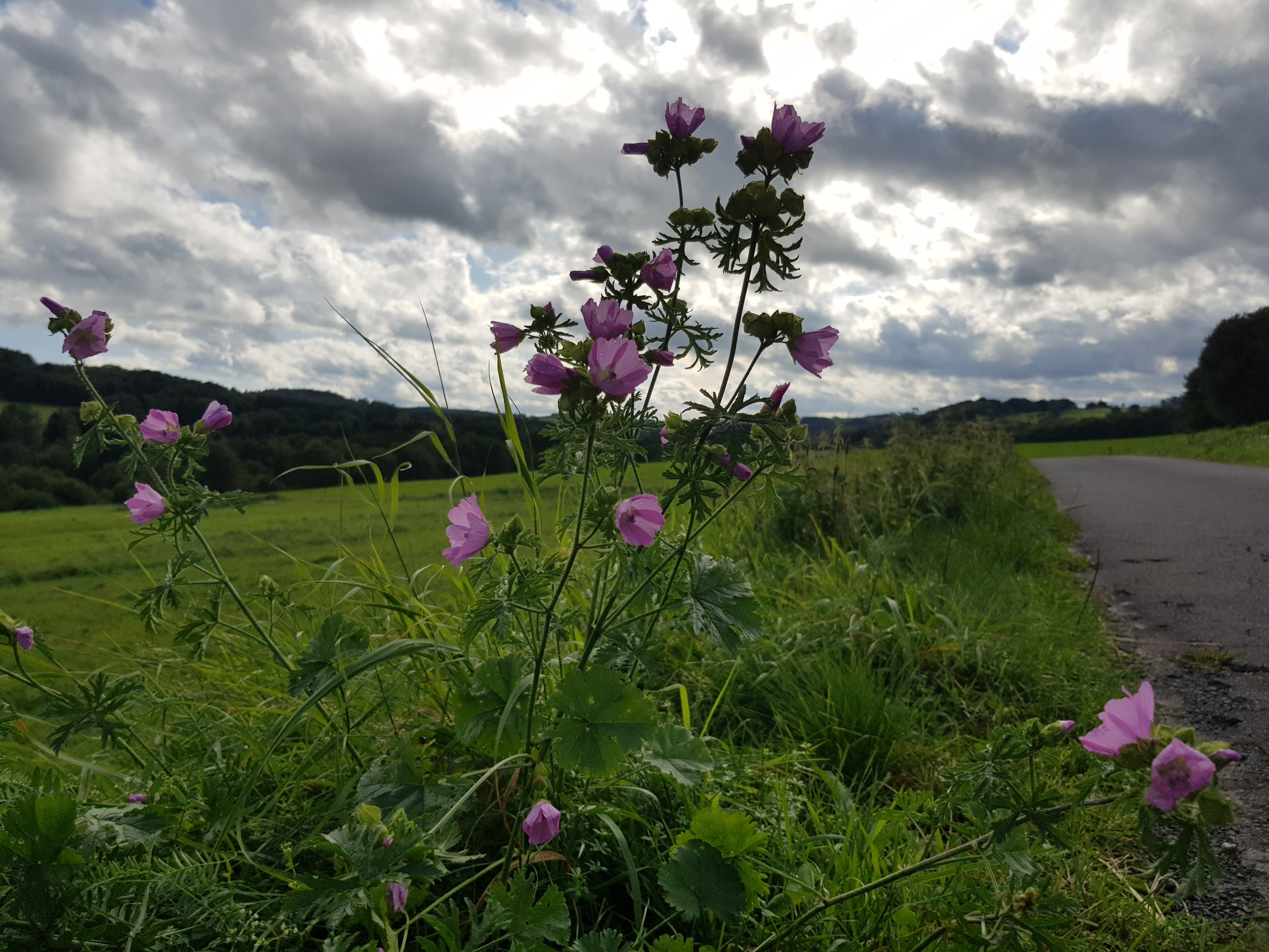 Zügig verlassen wir nun Herborn, zunächst auf einer steilen Straße und dann ein Weilchen entlang der Autobahn. Trotz der Geräuschkulisse ein schöner Weg über weite Wiesen mit Blick auf sanfte Berghänge. Kerstin bleibt schon nach kurzer Zeit in Geocaching-Mission zurück. Gerd und ich laufen schon mal weiter – nicht ahnend, dass wir sie nun länge Zeit nicht mehr zu Gesicht bekommen werden. Auch hier hat sich das indische Springkraut breitgemacht. Eine invasive Pflanze, die nicht zu unterschätzen ist. Sie ist schön anzusehen, riecht aber sehr penetrant süßlich und macht alles andere platt.