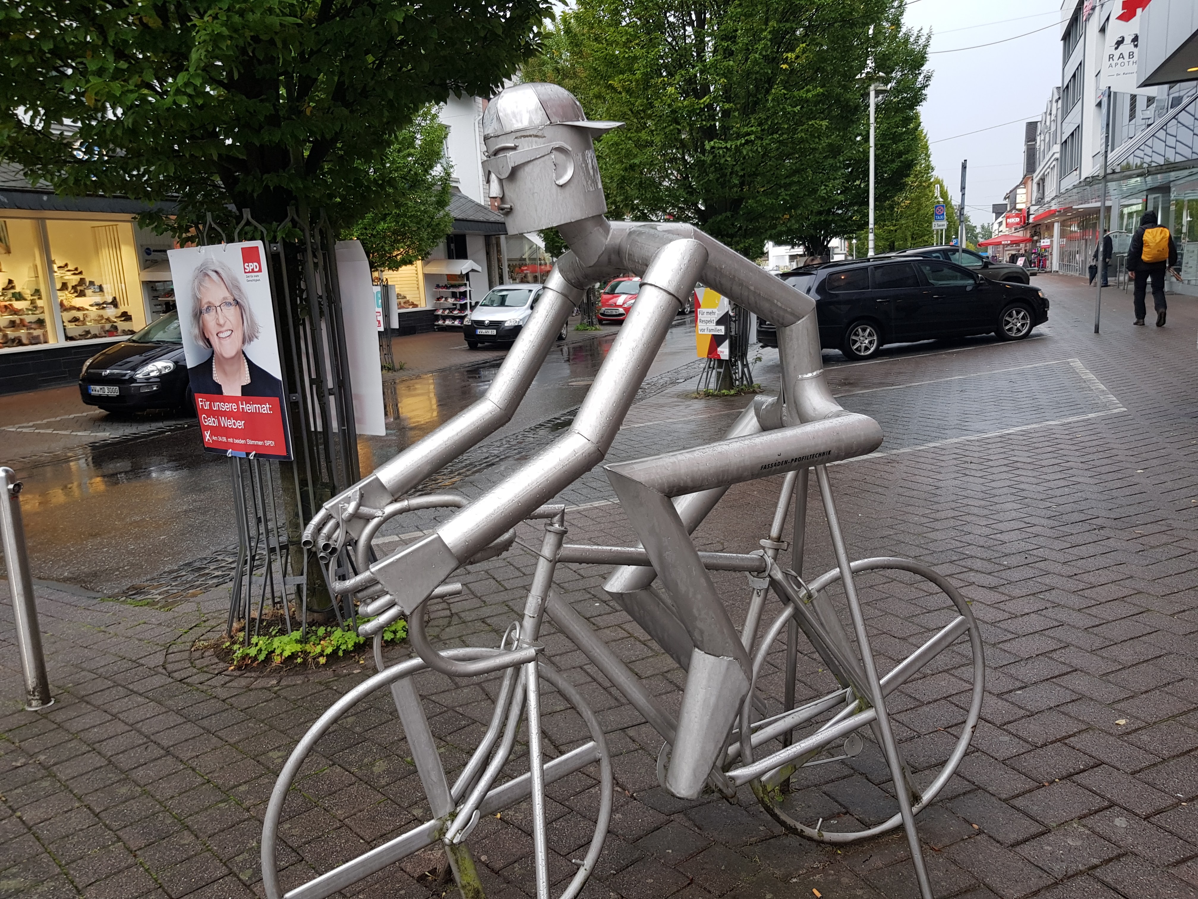 Also beschließen wir, einen Haps zu essen und dann unsere Zimmer in Beschlag zu nehmen. Leichter gesagt, als getan! Es scheint hier nur Cafés zu geben. Eins reiht sich ans andere. Ungläubig laufen wir die Fußgängerpassage zum 4. Mal auf und ab und bleiben dann in einem Eiscafé hängen, als doch tatsächlich Joey Kelly an uns vorbeiradelt! Dass er in der „Stadt“ ist, hatten wir schon mitbekommen. Vielleicht nimmt er ja auch am morgigen hiesigen Kartoffelfest teil. Aus der Wahlkampfecke beschallt uns grässliche Schlagermusik und wir sind froh, Kerstin zu einem Geocache begleiten zu dürfen. Dieser wird im Netz als so herausragend originell gefeiert, dass sie da natürlich unbedingt hin muss. Und es lohnt sich tatsächlich. Kerstin ist begeistert. Leider darf ich hier nichts weiter verraten, denn sonst wird es anderen Geocachern zu leicht gemacht. Aber hier ein Aufruf an alle: es lohnt sich!