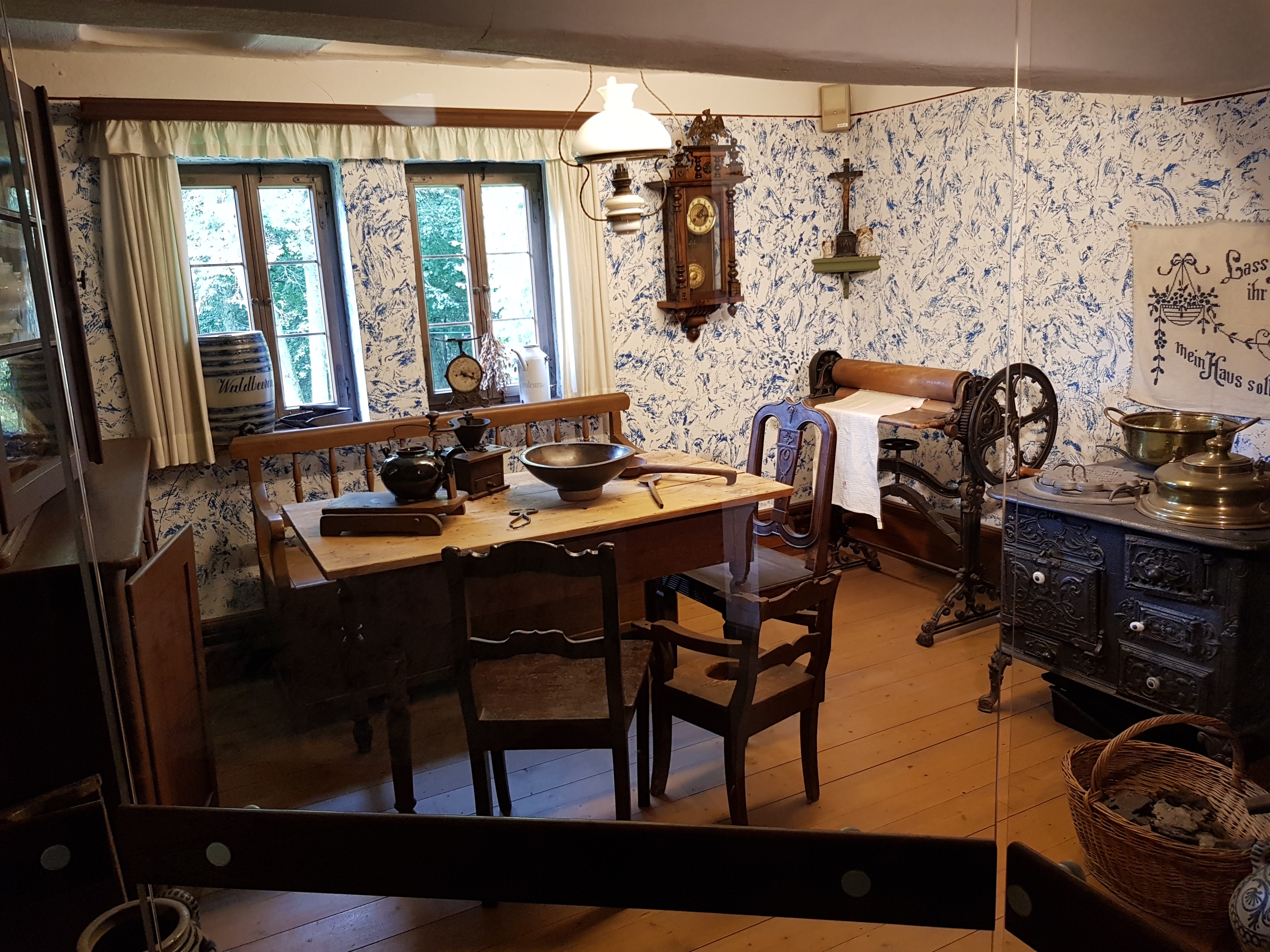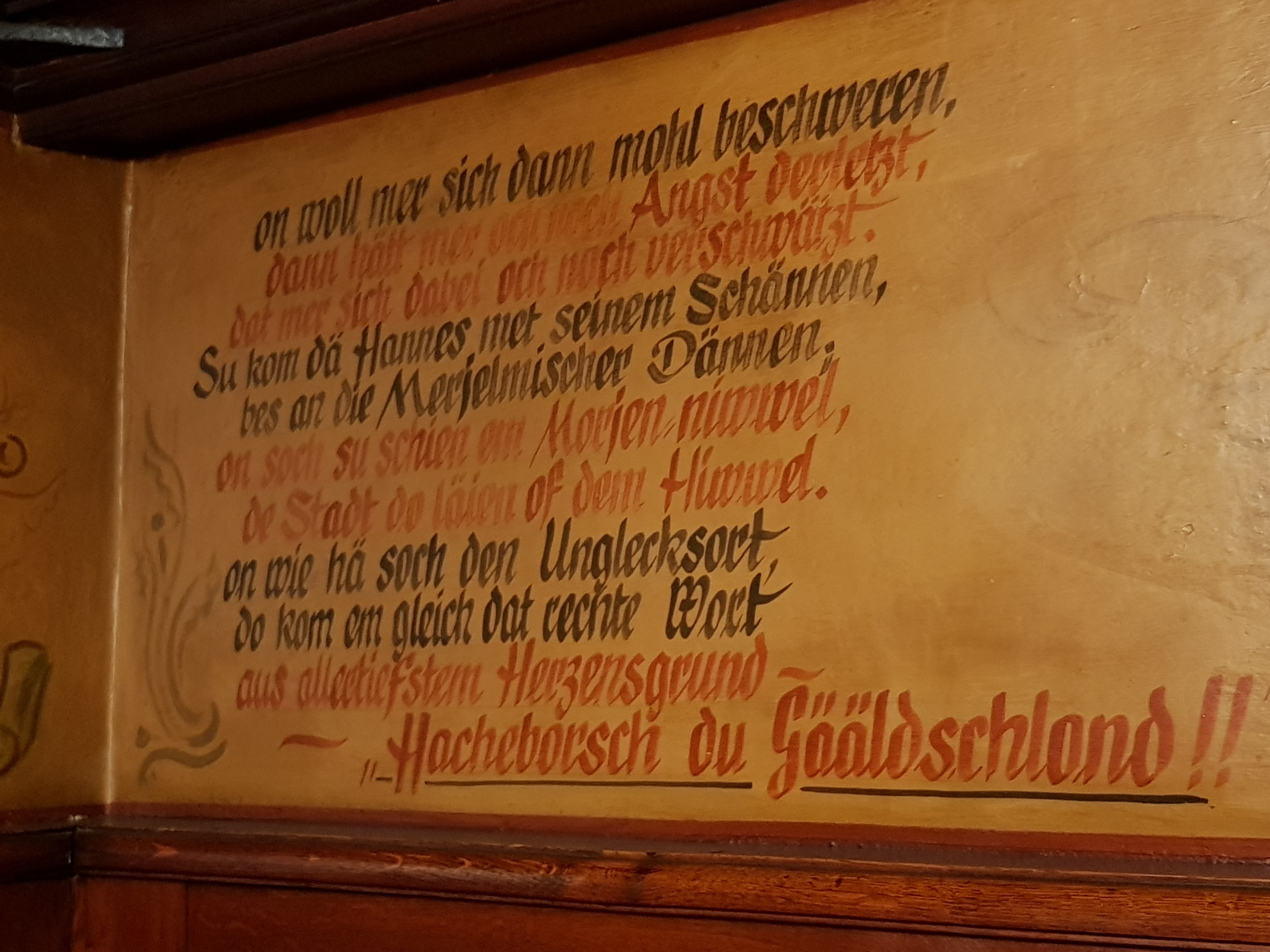 Wir gönnen uns heute morgen eine halbe Stunde mehr Schlaf, wir haben schließlich keine lange Tour mehr vor uns, aber zum Leidwesen von Gerd eine Shopping-Tour durch Hachenburg. Das Frühstück ist erwartungsgemäß wie überall in dieser Woche ausgesprochen üppig und lecker. Ich schaue mir den Vers mal genauer an, der über unseren Köpfen an die Wand gemalt ist, allerdings kann ich auf Anhieb nur wenig entschlüsseln. Vielleicht gelingt es euch Lesern besser: