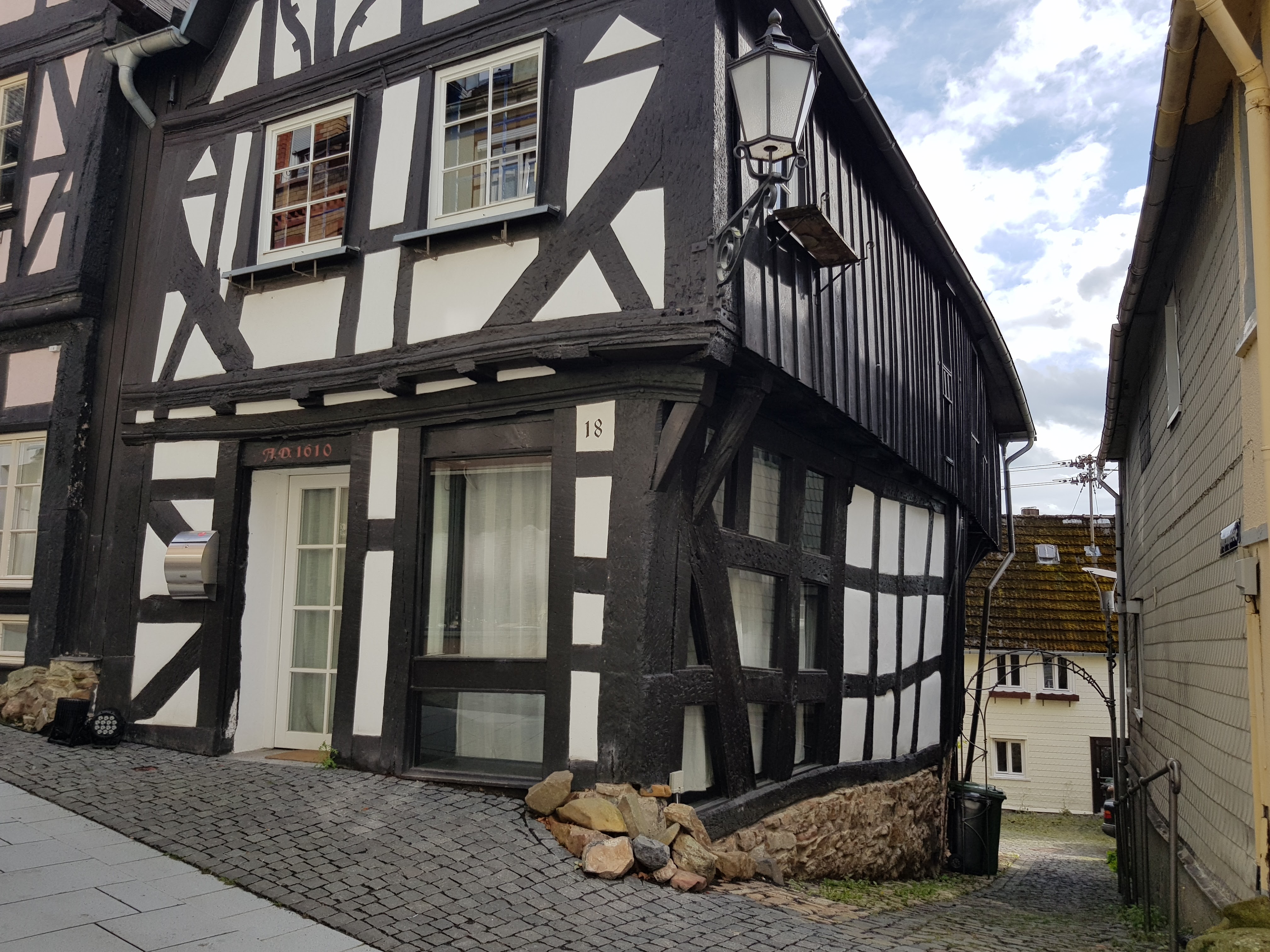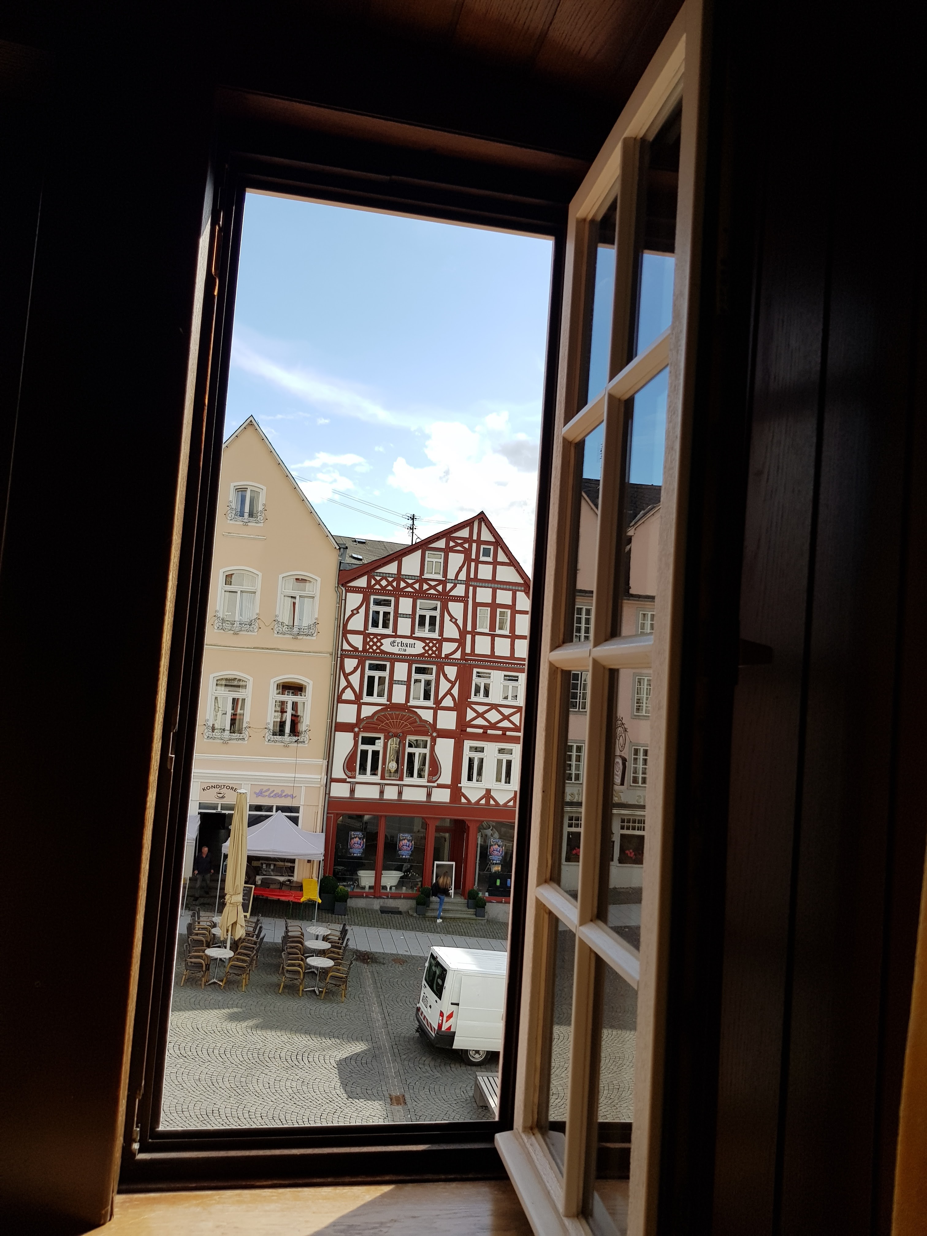 Der Westerwaldsteig führt mitten durch die Stadt, direkt bis zu unserem Hotel „Krone“ am Markt. Wir bekommen auf unserem Weg dorthin schon einen kleinen Eindruck von der Stadt. Sehr nett, mit vielen schönen, uralten Fachwerkhäusern. Eins davon ist unser Hotel, die älteste steinerne Herberge Deutschlands. Wir werden aus dem Fenster heraus freundlich begrüßt und hereingebeten. Was gibt es da nicht alles zu sehen!