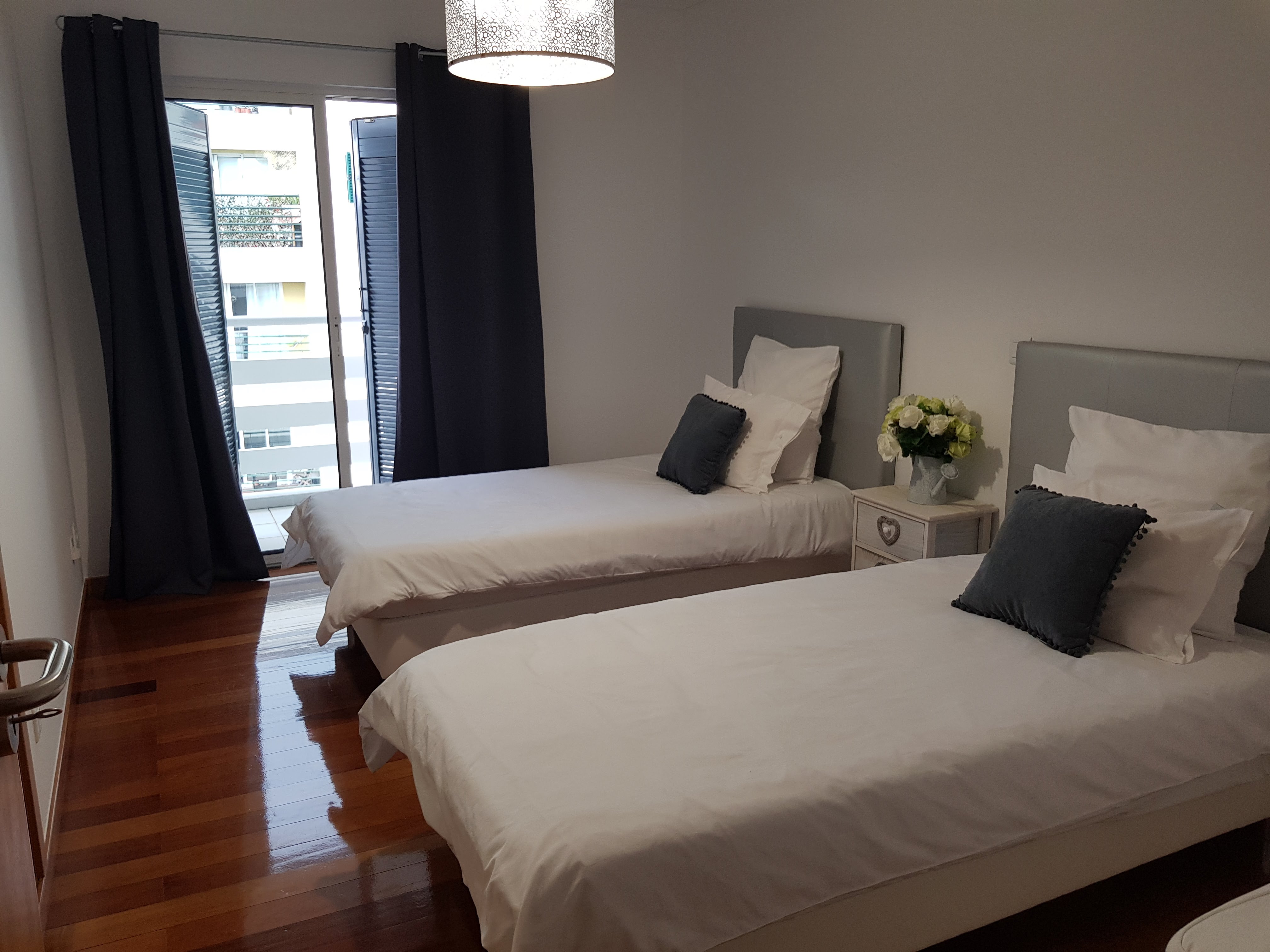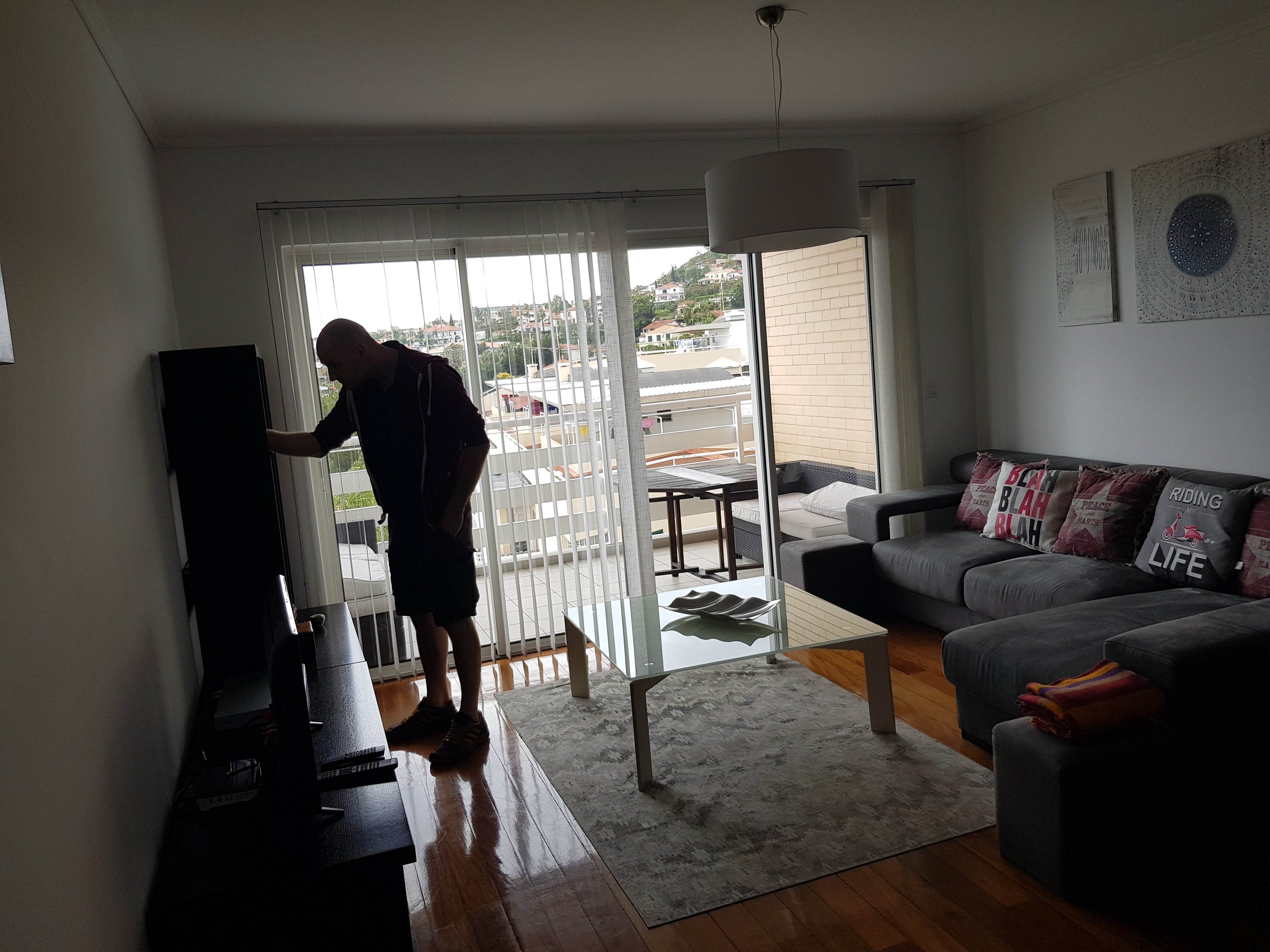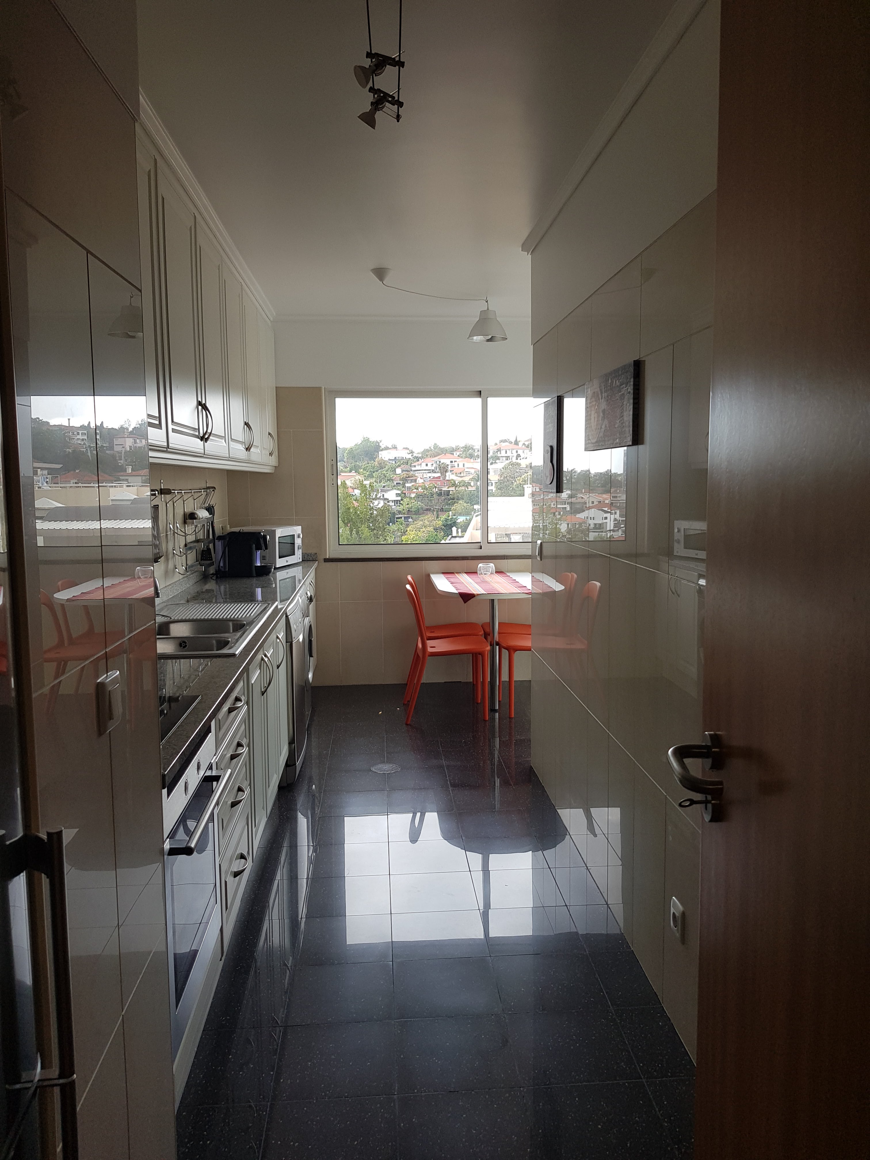 Nun warten wir auf unser Gepäck, schon ahnend, dass wir unsere Koffer nicht finden werden auf dem Band. Denn wenn es in Köln für uns schon zu Fuß knapp war mit dem Fahrzeugwechsel, konnte das Gepäck ja gar nicht so schnell umgeladen werden. Und so ist es auch. Also müssen wir an einen Schalter und die Nachlieferung regeln. Es wird uns, wenn es irgendwann Madeira erreicht hat, in die Ferienwohnung gebracht. Vermutlich erst morgen Abend oder übermorgen. Das heißt: shoppen gehen! Auf Kosten von Eurowings, denn schließlich braucht der Mensch frische Schlüpfer, Zahnbürste, Creme, Duschbad, Hosen, Shirts, Blusen, dazu passenden Schmuck, Haarbürste, Schminkzeug, Wanderschuhe, Socken und, und, und… Aber erst mal den Mietwagen abholen (Peugeot 208) und Leonel treffen, der vor unserer Ferienwohnung, die laut Maps 21 km entfernt liegt, auf uns wartet. Ein lustiger Typ, der uns alles zeigt, was es in der Wohnung und drumherum zu beachten gibt. Es ist unglaublich, wie viel Platz wir hier haben! Jeder ein eigenes Schlafzimmer, zwei Bäder und noch eine dritte Toilette. Ringsherum Balkon. Sehr schön.