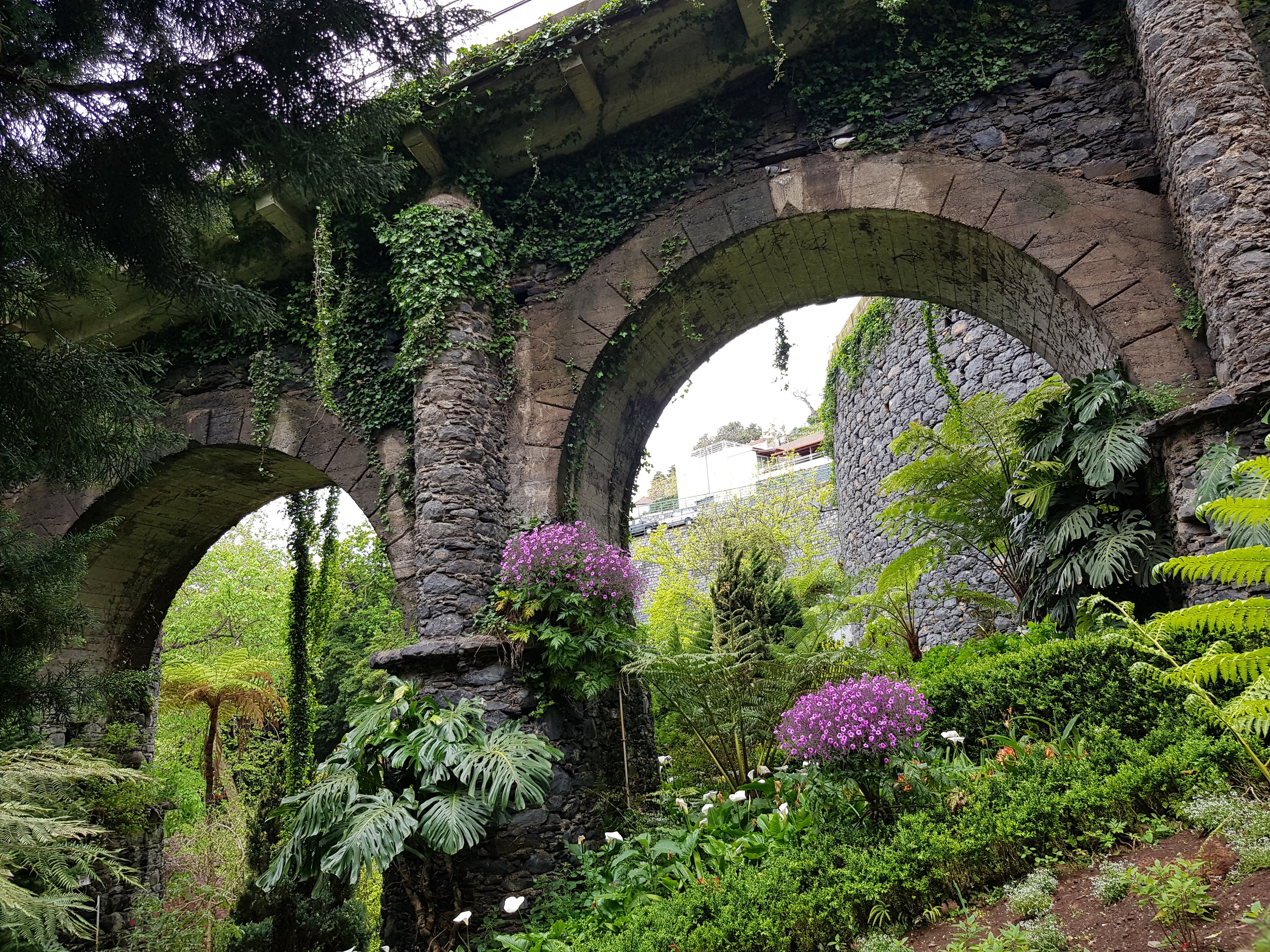 Einen Besuch des oben gelegenen Botanischen Gartens lehnt Wolfram kategorisch ab. Verstehe ich, denn er hat ja von mir schon ganz viel Pflanzenkunde verpasst bekommen. Unser alternatives Vorhaben, von dort aus auf der „Viel-Erfolg-Levada“ nach Funchal zurückzulaufen, wird von einem Zaun vereitelt. Egal, denken wir, dann schauen wir uns eben Monte an und die berühmten Korbschlitten. Aber auch das gelingt uns nicht, weil keine fahren. Vielleicht beginnt die Saison dafür später. Doch so leicht lassen wir uns nicht entmutigen. Wir finden einen herrlichen Weg durch den Stadtpark, der auch als Botanischer Garten durchgehen könnte.