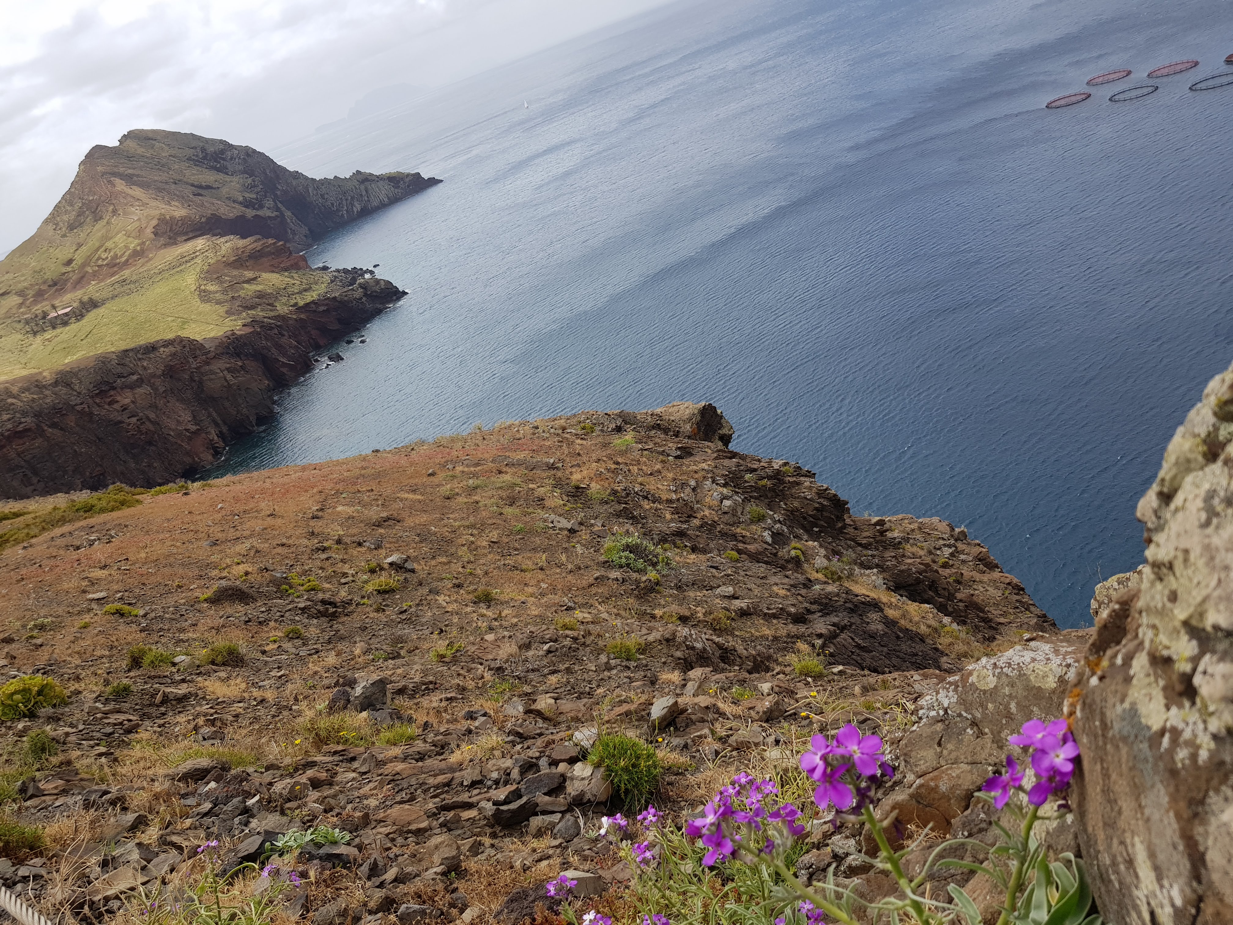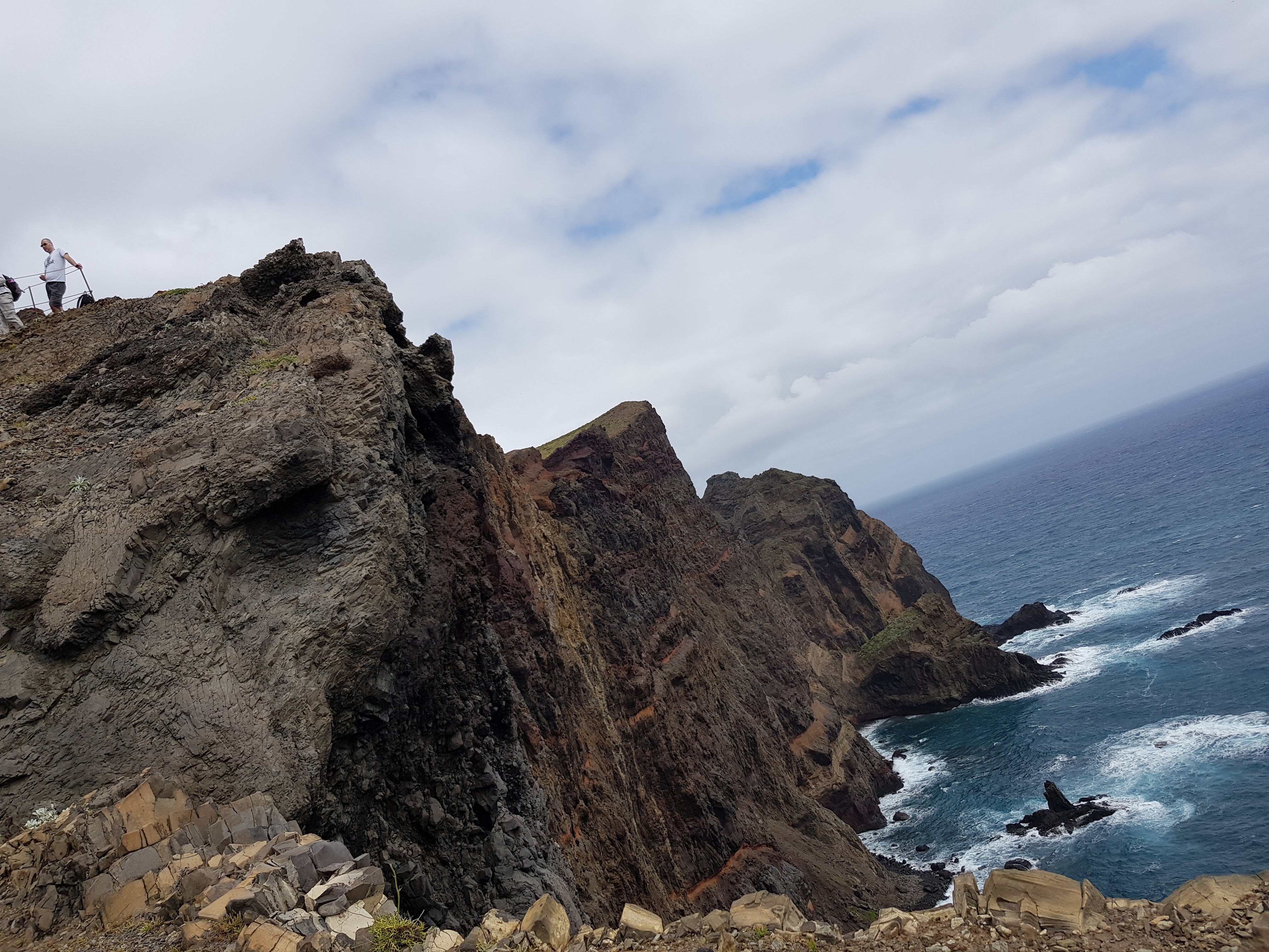 So langsam spielen wir uns aufeinander ein mit unserem morgendlichen Routineprogramm. Einer nach dem anderen taucht auf zum Start in den Tag, den wir heute wandernd auf dem östlichsten Zipfel von Madeira verbringen wollen – der Halbinsel Ponta De São Lourenço. Im Reiseführer lesen wir, dass es dort fast nie regnet und Vegetation so gut wie nicht vorhanden ist außer ein paar Moosen im Frühjahr. Wie schon mehrmals festgestellt, kann man in Madeira auch Angaben in aktuellen Auflagen nur bedingt trauen. Als wir auf dem Parkplatz ankommen, fängt es an zu regnen und es stürmt so sehr, dass wir erst mal im Auto sitzenbleiben. Keiner von uns ist so motiviert wie der Rest der Menschheit, der sich offenbar komplett hier versammelt hat, um uns auf der 3,5 km langen Strecke zur Spitze der Halbinsel zu begleiten. Eine Völkerwanderung ist im Gange. Wie die Ameisen reihen sich die Massen kilometerweit sichtbar in bunter Funktionskleidung hintereinander ein, um auf den mitunter schmalen Pfaden vorwärtszuziehen. Da wir nun aber einmal da sind und der Regen auch schnell vorbei ist, werden wir Teil dieser im Sturm hin und her schwankenden Menschenmenge. Viele scheint ein französischer Bus ausgespuckt zu haben, aber auch grelle Frauenstimmen in schwäbischem Dialekt sind zu hören. Nebenbei bemerkt, wäre es mir nicht möglich, mit der Inhaberin einer solchen Stimme auch nur einen Tag zu verbringen. Mit reichen schon die paar Sätze, die ich im Vorbeigehen aufschnappe.