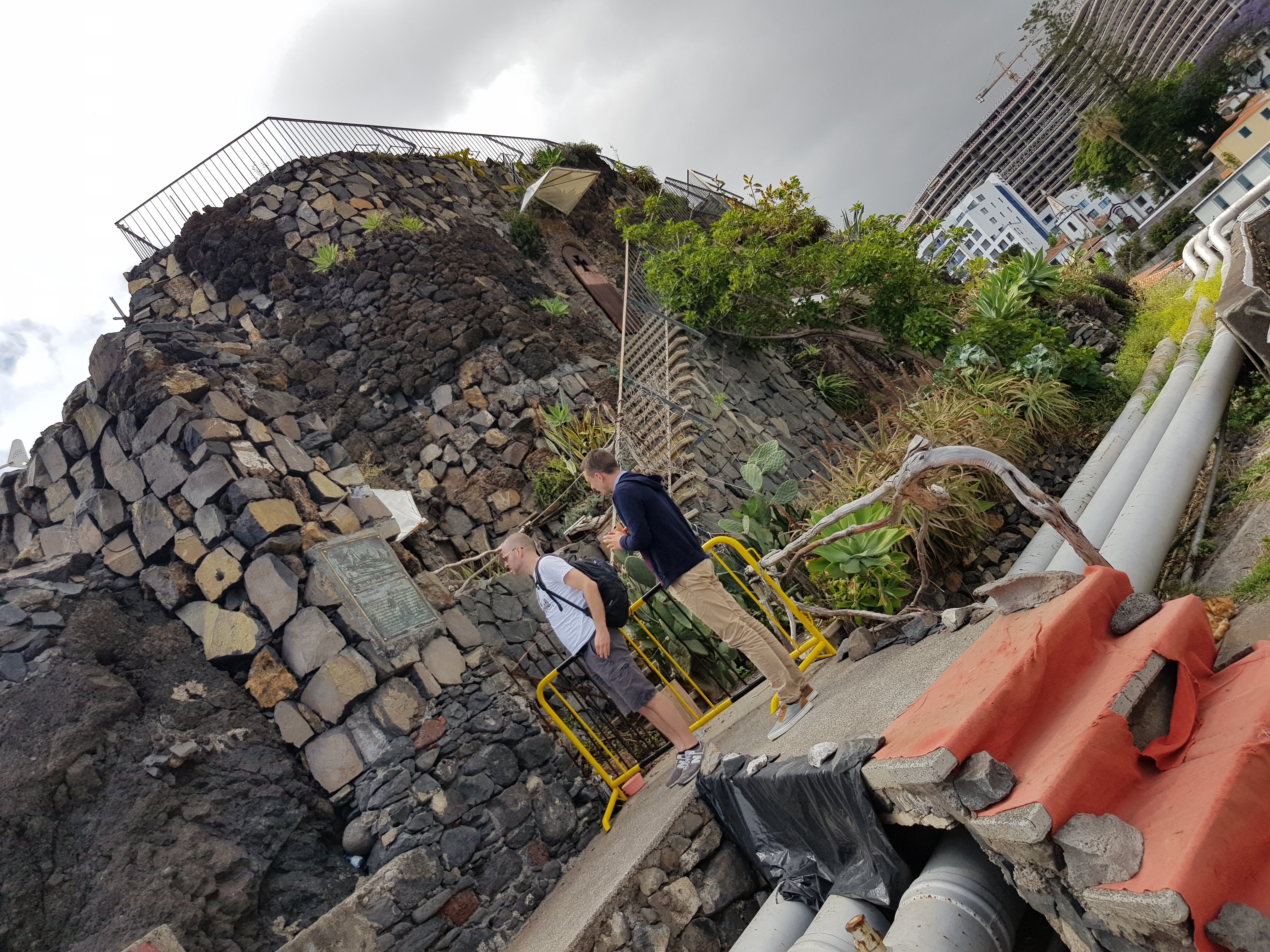 Nun gehts wieder runter und nach Calheta. Dort gibt es den einzigen künstlichen Sandstrand auf Madeira und wir sehen auch Menschen im Wasser und auf Sonnenliegen. Außerdem hat der Ort ein Zuckermuseum zu bieten und ein berühmtes Kunstzentrum. An der Uferpromenade können wir gemauerte Schlote und ein historisches Destilliergerät bewundern. Viel interessanter finden wir aber eine verbale Auseinandersetzung zwischen einem Hund und einer Katze, die offenbar unentschieden endet. Das herrliche Wetter lässt diese ganzen Ortschaften idyllisch und romantisch erscheinen, aber im Grunde genommen langweilen wir uns schon nach 10 Minuten. Wie mag das sein, wenn man hier leben muss? Im Reiseführer finde ich einen Hinweis auf ein Ökohotel in 400 m Höhe, das einen schönen Park, vegetarisches Essen und einen wunderschönen Blick zu bieten hat. Außer für Wolfram also für jeden was dabei. Wir fahren hoch, finden das Hotel auch, aber es wird gerade saniert und ist geschlossen. Sind wir ja schon gewöhnt, dass man sich auf keine Angaben verlassen kann. Aber in einem kleinen Restaurant direkt neben unserem geparkten Auto werden wir sehr nett willkommen geheißen und finden auch hier schmackhafte Angebote auf der Speisekarte. Während wir mampfen, pilgern unzählige Wandergruppen an uns vorbei in Richtung Baustelle. Wo wollen die alle hin? Es kommt auch niemand wieder zurück! Wir studieren Wander- und Reiseführer und kombinieren, dass neben dem Hotel einer der als schwierig eingestuften Wanderwege beginnt. Er führt aus 400 m Höhe direkt hinunter ans Meer, dort entlang und den nächsten Berg wieder hinauf. Dauer: 5,5 Stunden. Das schaffen wir natürlich nicht mehr, aber vielleicht können wir wenigstens den ersten Abschnitt hinunter laufen und dann wieder hoch? Also los! Wieder vorbei an der Hotel-Baustelle und dazugehörigen Ferienhäusern, entdecken wir den unglaublich schönen Weg runter nach Paúl do Mar.