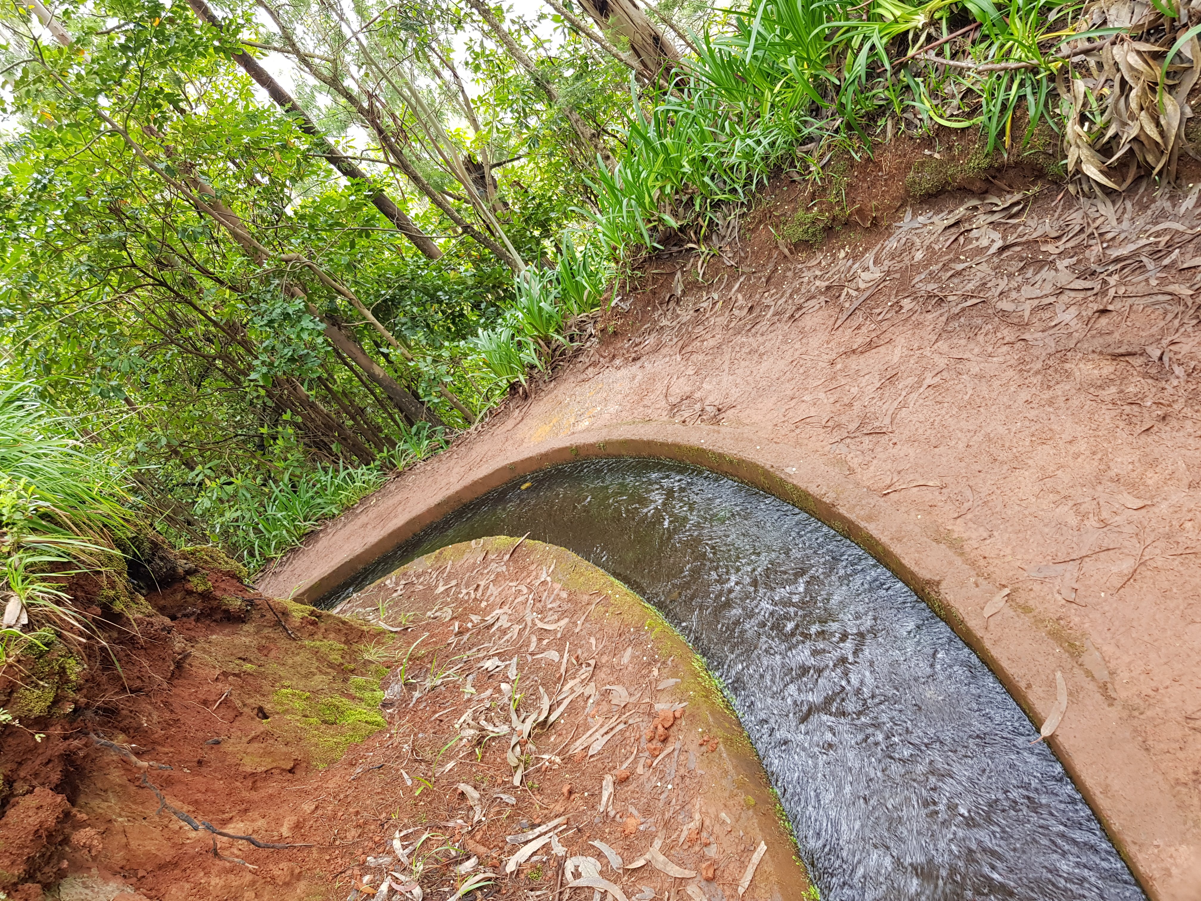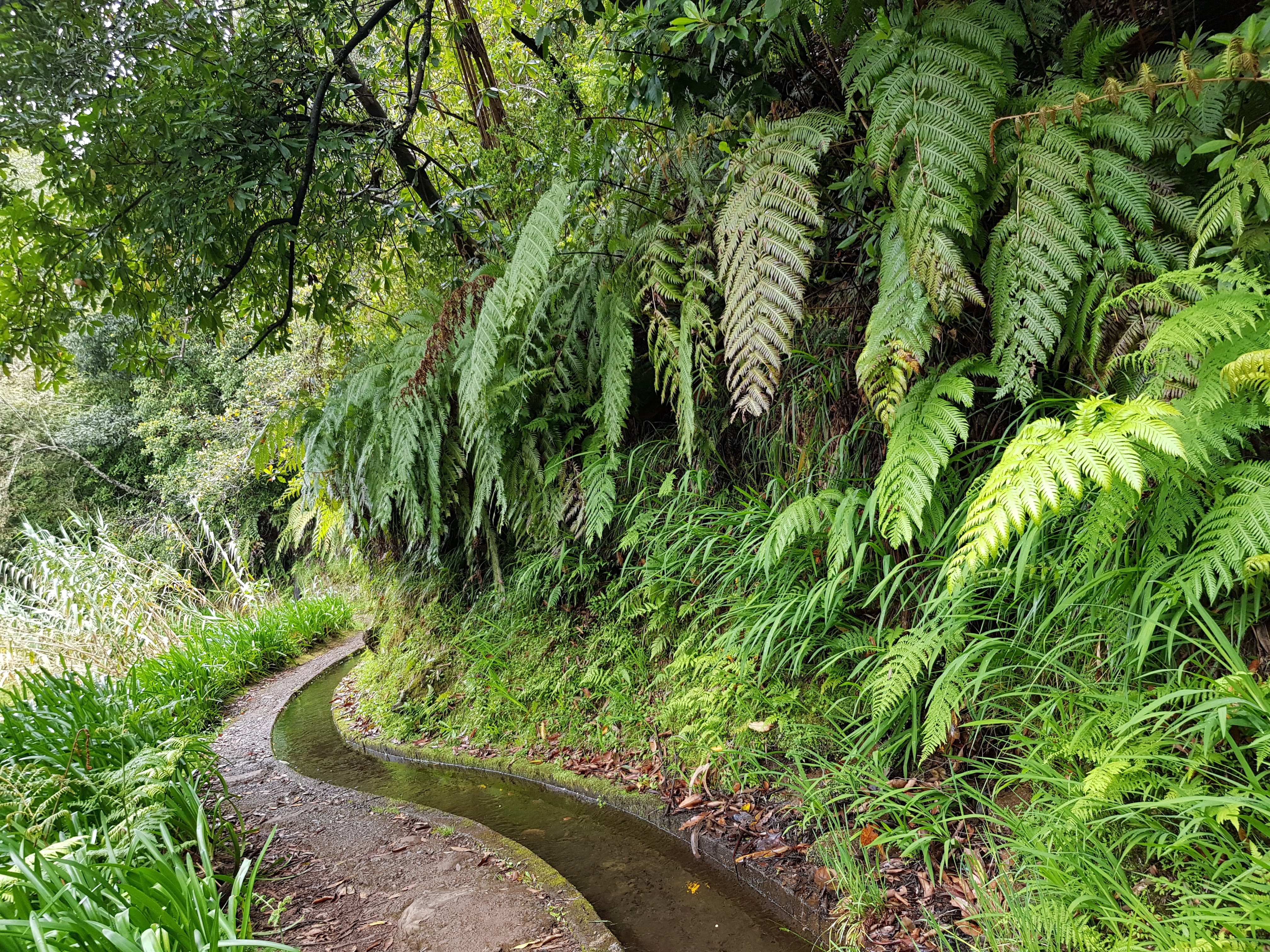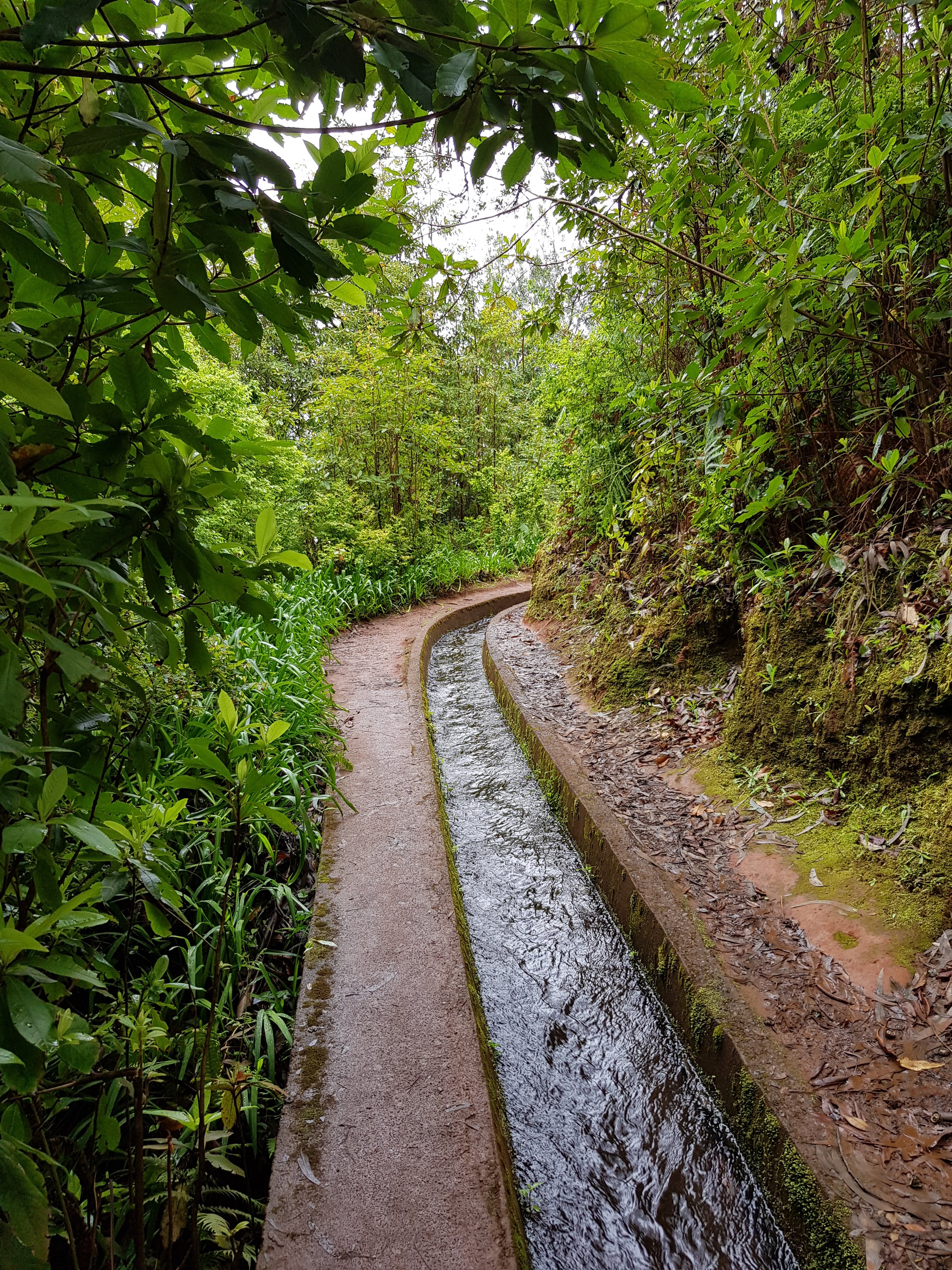 In Funchal scheint die Sonne, während es hier bewölkt ist. Diese Wetterunterschiede sind übrigens sehr landestypisch. Da man nur wenige Kilometer zurücklegen muss, um von 0 auf über 1000 Höhenmeter zu kommen, ist unten oft strahlender Sonneschein, während die Berge in schwere Wolken gehüllt sind und Regen sehr wahrscheinlich ist. Nicht umsonst ist das hier die Blumeninsel und Madeira berühmt für die üppige Vegetation. Von nichts kommt nichts. Wir brauchen jetzt auch nicht unbedingt Sonnenschein, wir laufen sowieso im Schatten der Lorbeer- und Eukalyptusbäume, die ganz besonders ätherisch duften. Nicht wie das Öl, das wir kennen. Diese Duftnote entsteht erst, wenn man die Blätter zerreibt. Die Bäume verströmen einen holzigen, sehr markanten Duft, der schwer zu beschreiben ist und an ein herbes Parfüm erinnert. Jedenfalls für mitteleuropäische Waldgänger ein völlig neues Erlebnis. Frische, würzige Waldluft, aber anders als gewohnt. Natürlich auch die Vegetation, wenn man darauf achtet. Auf den ersten Blick ist es einfach nur Wald. Die Wege sind sehr feucht und wir haben eigentlich nicht die richtigen Schuhe an. Jetzt wäre es gut, wenn ich meine Wanderschuhe mitgenommen hätte. Aber das war mir zuviel Schlepperei. Egal, es geht auch so, aber in Nullkommanichts haben wir eine dicke Lehmschicht aus der typischen roten Erde an den Füßen kleben. Es ist wunderschön hier und ich könnte den ganzen Tag so laufen. Ab und zu überholen wir geführte Wandergruppen oder kommen uns Leute entgegen. Dann muss man sich arrangieren, wie man unbeschadet aneinander vorbeikommt, denn der Weg ist meistens ziemlich schmal und auch nicht ungefährlich, denn es geht stellenweise steil bergab ins sehr tiefe Tal. Aber diese Punkte sind mit Zäunen aus Stahlseilen gesichert. Wenn man seinen Blick in die Ferne schweifen lässt, könnte man denken, dass man im Bodetal im Harz wandert. Kaum habe ich den Gedanken gehabt, dass man hier auch mal ganz schnell mit den Füßen im Wasser landen kann, höre ich hinter mir ein Geräusch, als wenn man einen großen Stein ins Wasser plumpsen lässt. Georg ist von der Einfassung des Baches abgerutscht und ein Fuß ist nass. Hm, nicht zu ändern, wir können nur unser Tempo erhöhen, damit er warm bleibt.