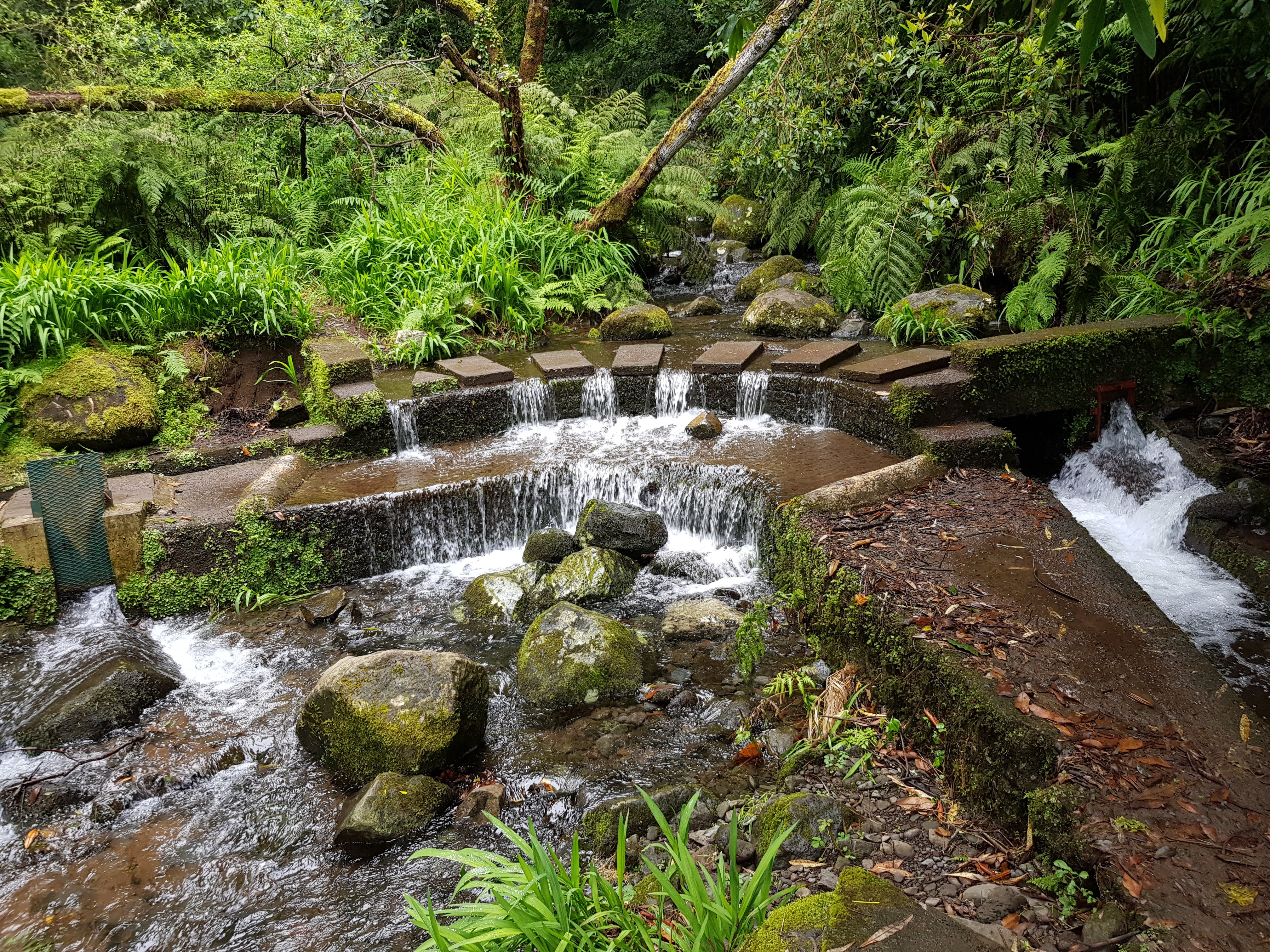 Nun dauert es nicht mehr lange, bis wir das Ende des Weges erreicht haben. Wir stehen nun am Flussbett, von dem die Levada abgeleitet wird, quasi an deren Anfang. Die Wassermassen stürzen hier vom Berg in eine Art Sammelbecken und rauschen weiter runter ins Tal.