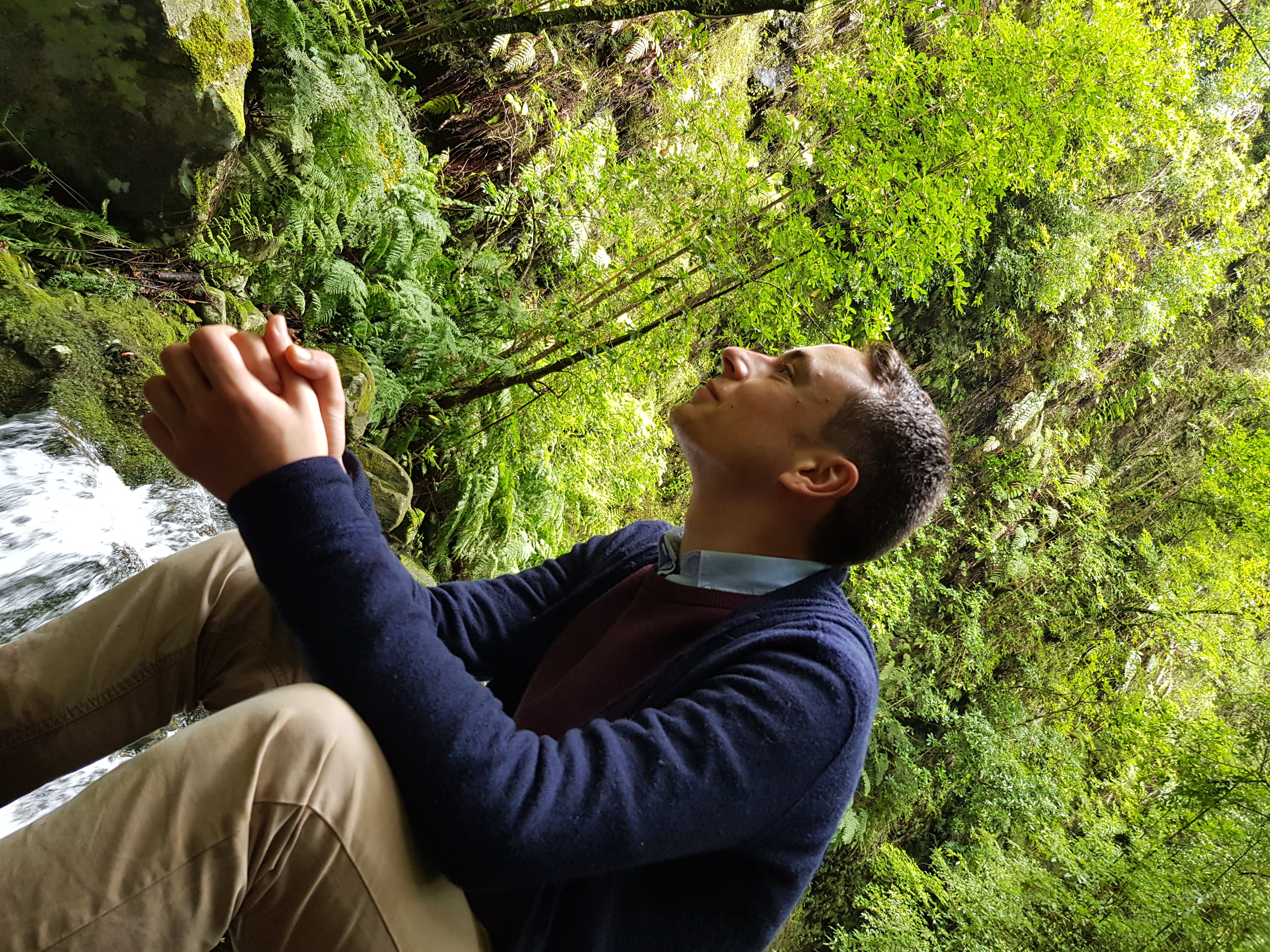 In der Ferne hören wir das Rauschen eines Wasserfalls, das immer näher kommt. Schließlich stehen wir davor und müssen uns überlegen, wie wir so trocken wie möglich darunter hindurch kommen, denn er trommelt direkt auf den Weg. Ich schicke Stoßgebete zum Himmel, dass ich heute morgen vergessen habe, meine Regenjacke auszupacken und biete Georg an, sie wie eine Plane über uns zu halten. Er weigert sich aber und möchte ohne Regenschutz hindurch rennen. Ok, dann kann ich meine Jacke auch richtig anziehen und nur meine Beine und Füße bekommen was ab.
