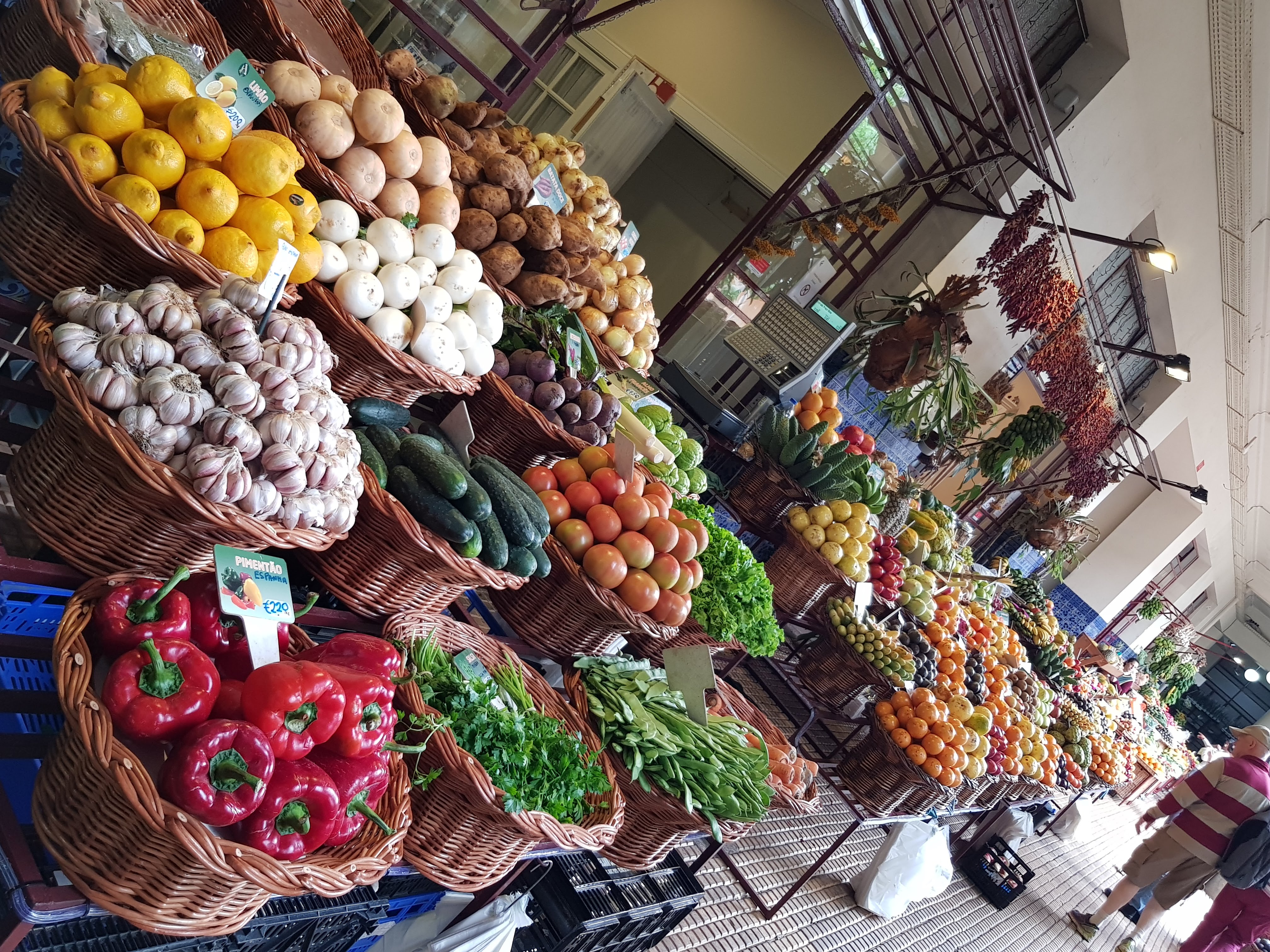 Nun ist aber erst mal Siesta. Georg schlägt vor, einen zweiten Versuch zu wagen, die Markthallen zu besuchen. Habe ich nichts dagegen, schließlich will ich ja auch noch ein paar Souvenirs kaufen. Heute wird ja nicht schon wieder ein Feiertag sein! Zu Fuß hinunter und zurück wären es mehr als 8 km, aber Wolfram will bestimmt auch nochmal an die frische Luft und uns fahren, versuche ich ihm zu suggerieren. Erfolglos. Er hatte sich nämlich kurz zuvor eine Pizza geholt und meint, das wäre frische Luft genug gewesen. Ich könnte ja selbst fahren. Och nö, denke ich. Jetzt habe ich so schön eingeparkt und möchte eigentlich nicht durch die Innenstadt kurven durch steile Gassen und einen Parkplatz suchen. Wolfram könnte das viel besser und vor allem entspannter! Aber er bleibt stur, er hat heute Ruhetag. Georg steht abmarschbereit an der Wohnungstür. Ich hole tief Luft und sage zu mir: Das schaffst du auch, Renate. Ok. Auf gehts. Runter in die Stadt, die Richtung ist klar – zum Meer, dort kann man irgendwo parken und den Rest laufen. Schließlich landen wir in einem Parkhaus, das gefühlt genauso weit weg ist von der Markthalle wie unsere Wohnung, aber egal. Dort angekommen, empfängt uns eine Fülle von Sinneseindrücken. Es duftet wie auf einem orientalischen Basar nach Gewürzen und Lebensmitteln. Farbenprächtig präsentieren sich uns Obststände, Blumenläden und Bekleidung. Ein Laden verkauft Rum und Wein, sogar die Decke ist mit Flaschen gepflastert.