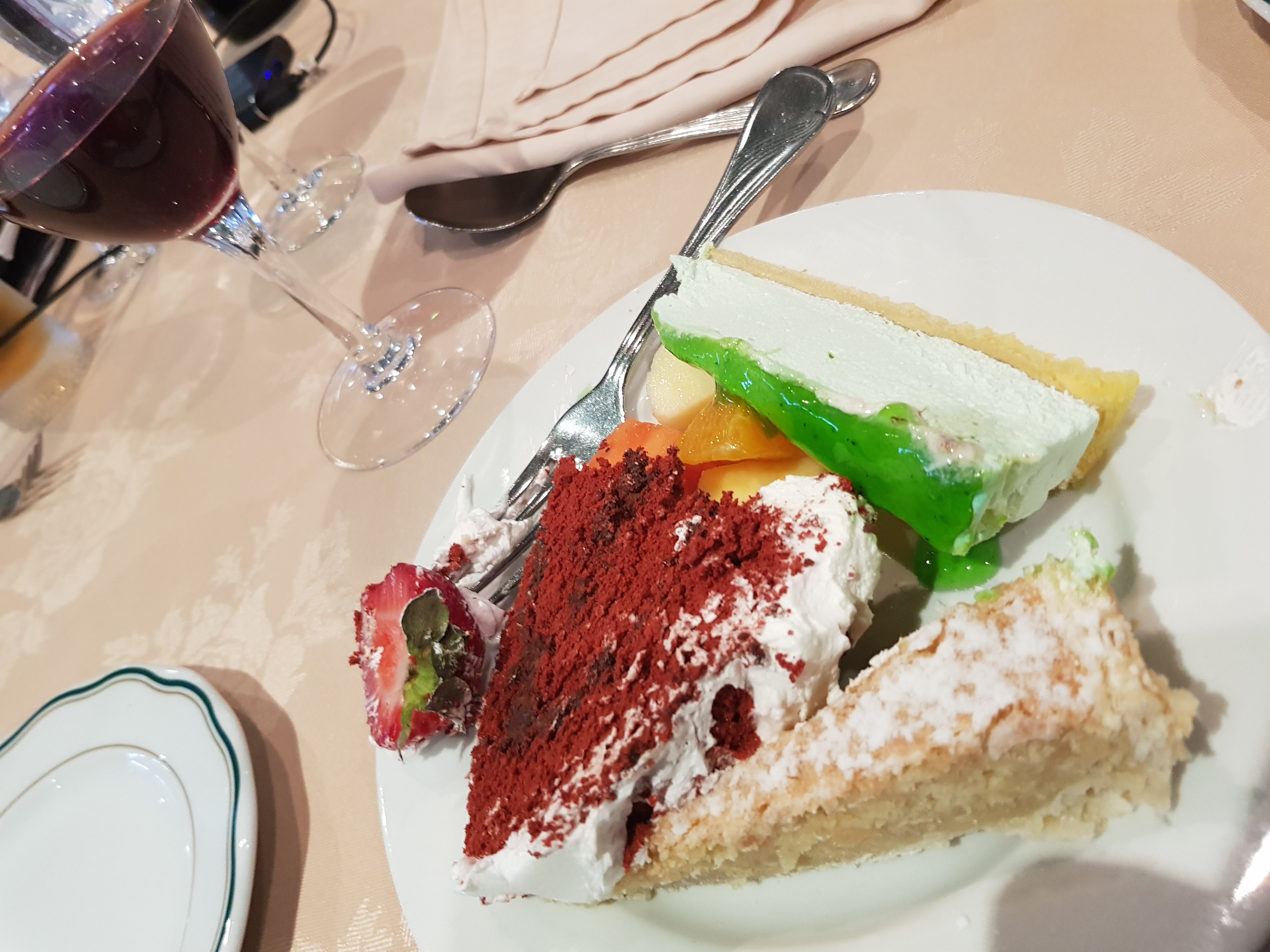Das Buffet ist für meine Begriffe gigantisch, während ich andere meckern höre, die Auswahl wäre ja hier nicht so doll. Es gibt drei Sorten Fleisch, Fisch in verschiedenen Variationen, Soßen, Nudeln, Kartoffeln, Reis, Gemüse, diverse Salate und ein extra Dessert-Buffet. Was wollen die Leute noch?